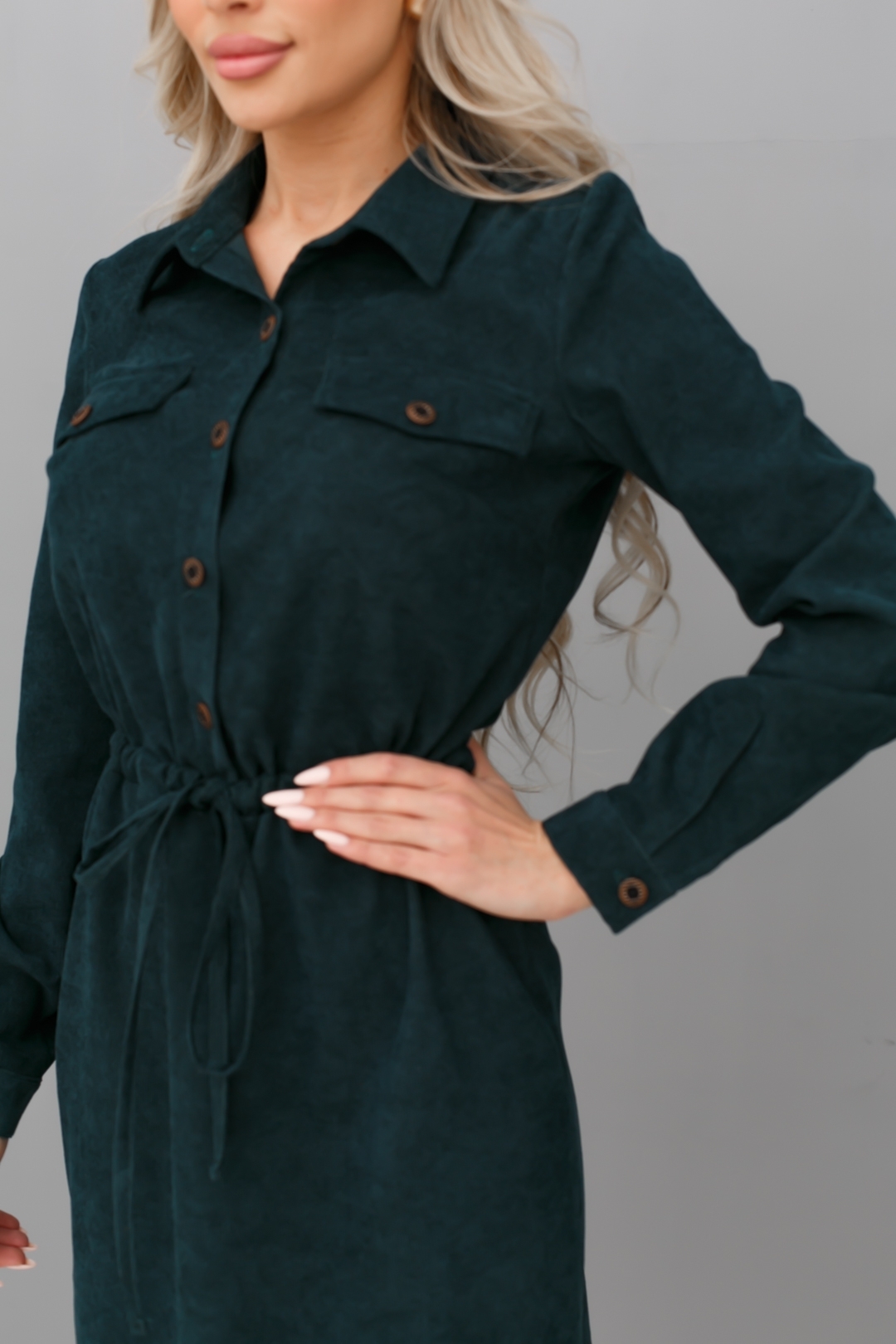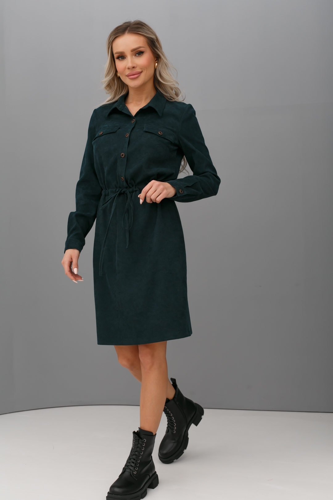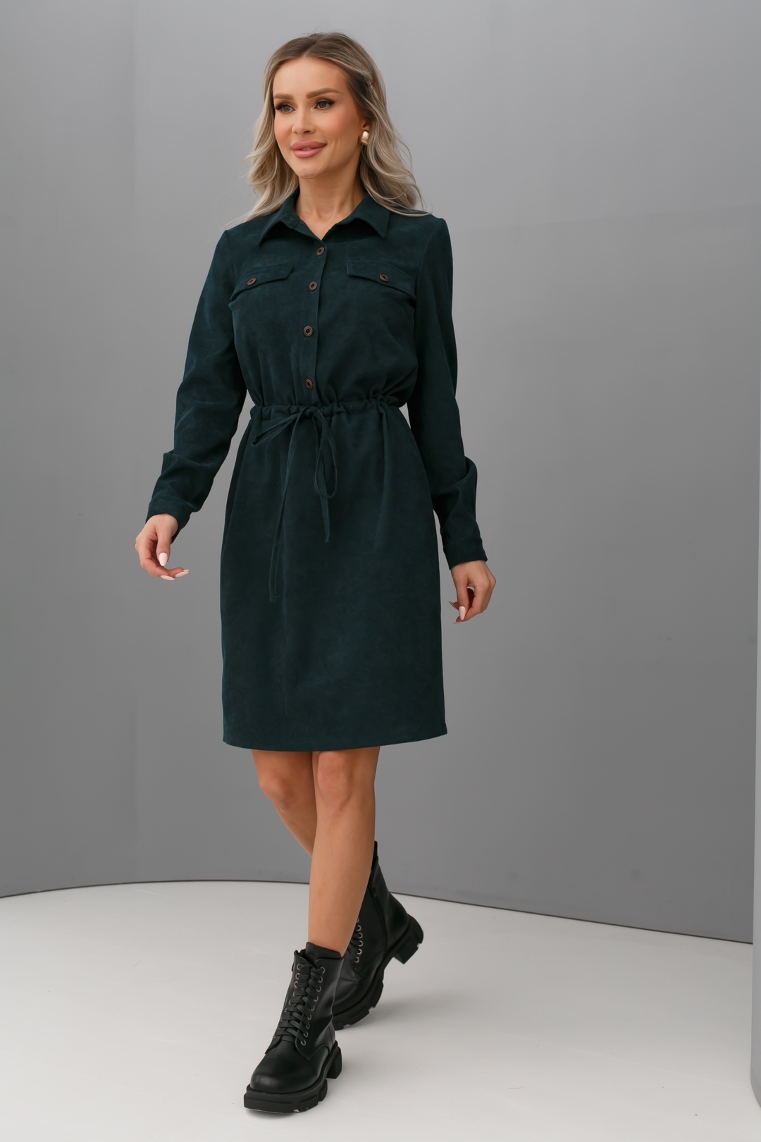 Платье прямого силуэта. Классический рубашечный воротник на стойке и планка до пояса на пуговицах. Модель отрезная по линии талии, дополнена кулиской. По переду накладные клапана. Длинный втачной рукав. Низ ровный, сзади разрез. Универсальный вариант для работы и отдыха.