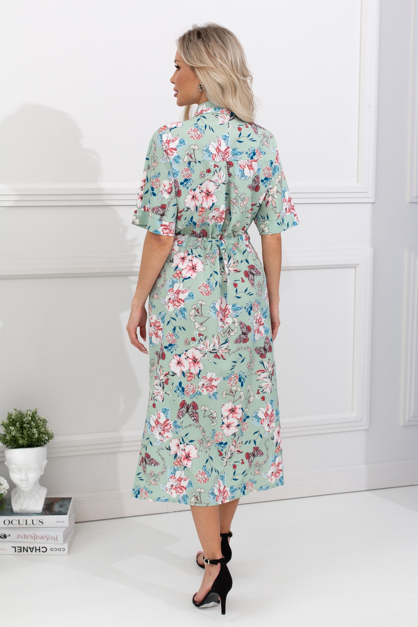 Легкое платье приталенного силуэта. Короткий цельнокроенный рукав с притачной манжетой. Горловина оформлена отложным воротником на стойке переходящим в планку с застежкой на петли и пуговицы. Модель отрезная по линии талии, дополнена кулиской. В боковых швах функциональные карманы. Низ ровный, по бокам разрезы.