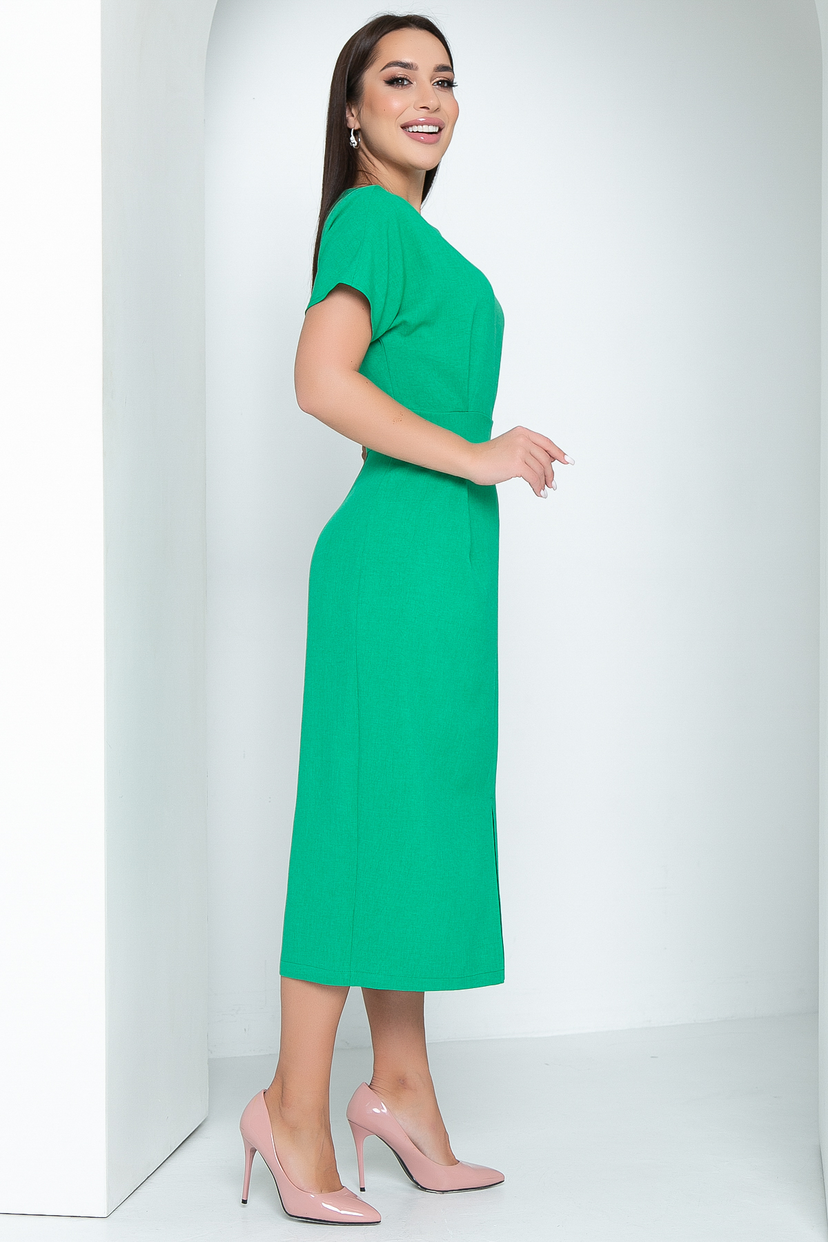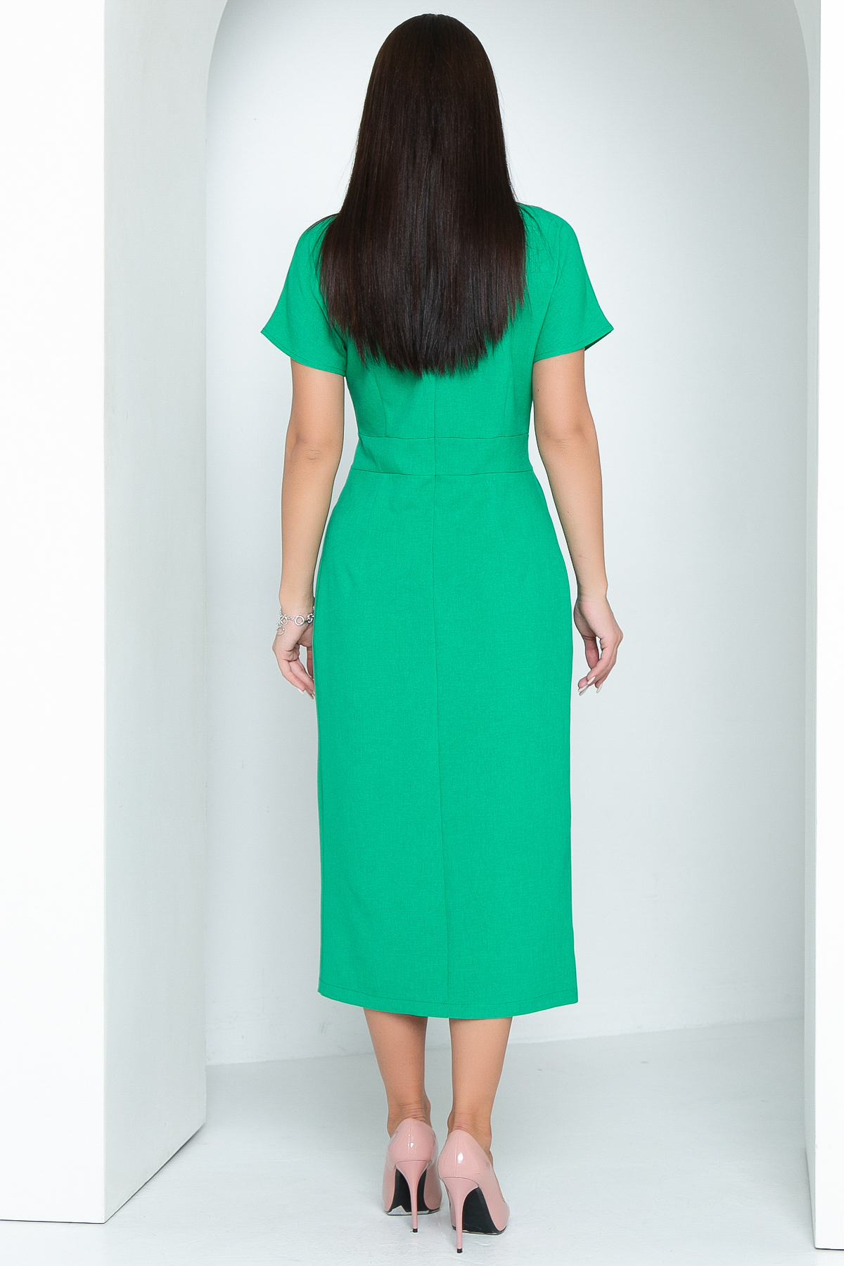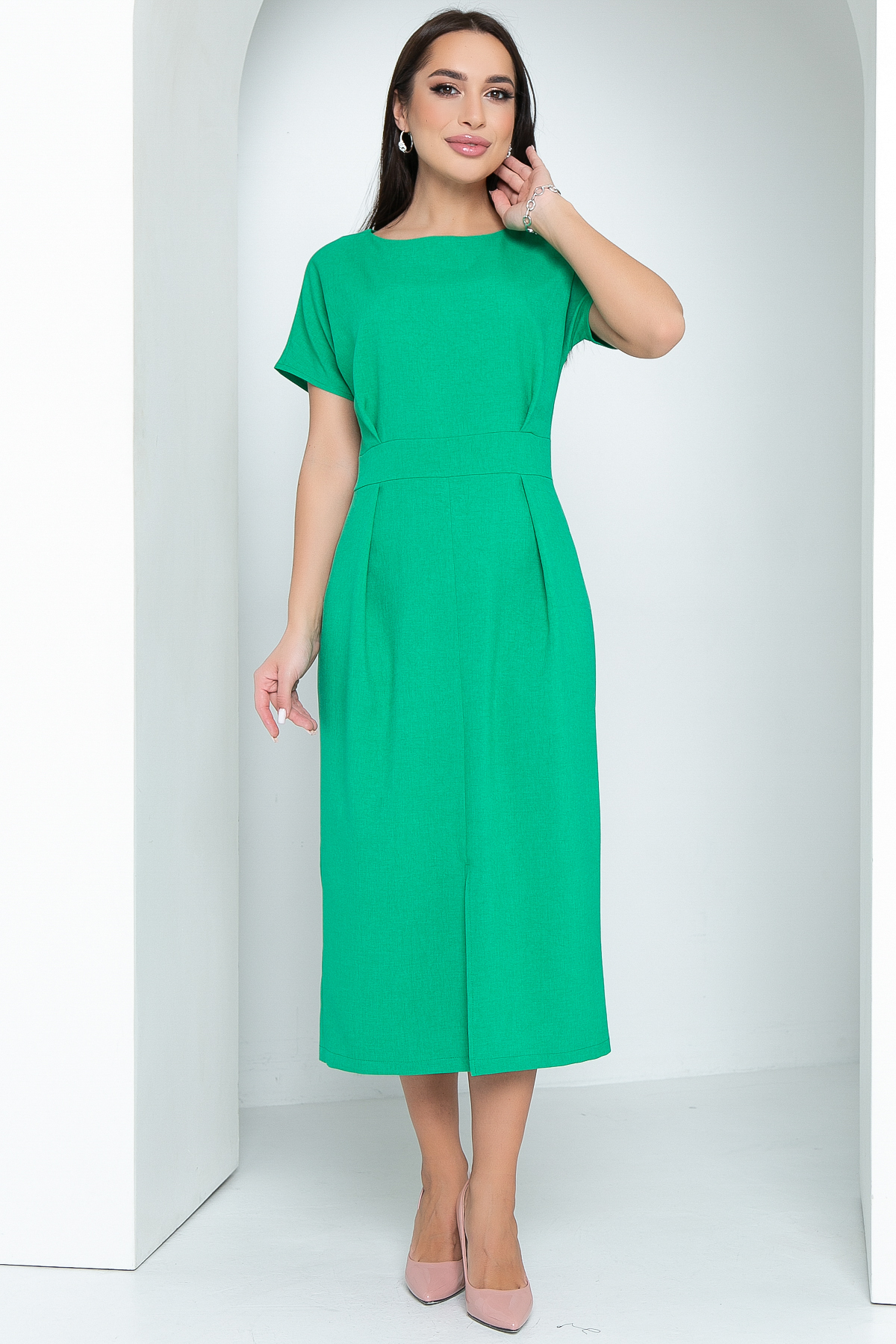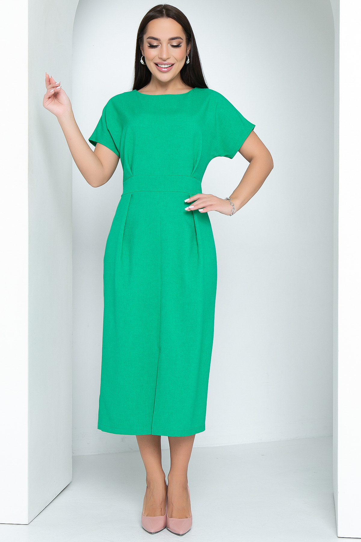 Летнее удлиненное платье со спущенным плечом выгодно подчеркивает фигуру. Стильное платье элегантного кроя, красивая длина миди - все это не оставит равнодушным окружающих. Горловина обработана обтачкой. Сзади в средний шов вставлена молния. Платье отрезное по талии, спереди сделаны две крупные складки