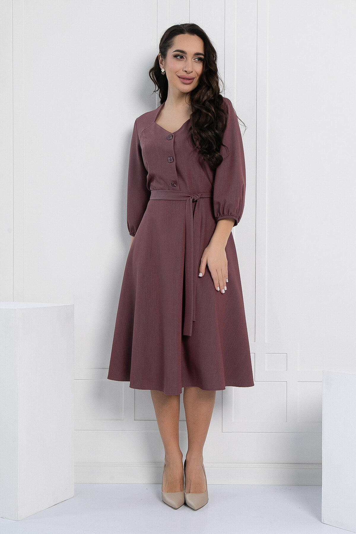 Превосходный выбор для тех, кто стремится к элегантности и утончённости. Модель с юбкой-клеш и рукавами длиной 3/4, которые оканчиваются резинкой, создаст женственный и изысканный образ. Талия платья отрезная, а по переду предусмотрена застёжка на пуговицы. Фигурный вырез горловины придаёт платью особый шарм. Пояс из основной ткани, который входит в комплект, подчёркивает талию, делая образ завершённым и стильным. Это платье станет отличным выбором для вечерних мероприятий и торжеств, позволяя вам выглядеть безупречно в любой ситуации.