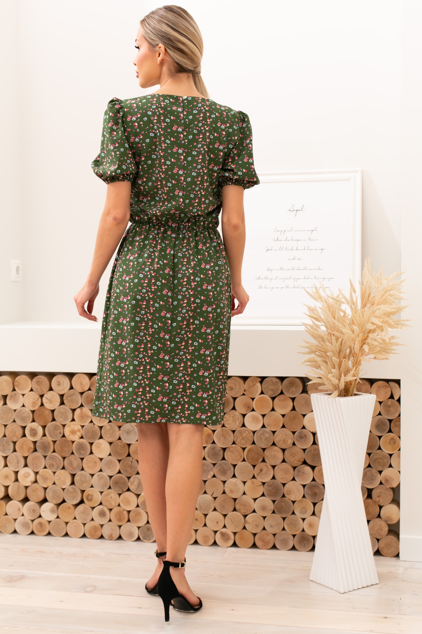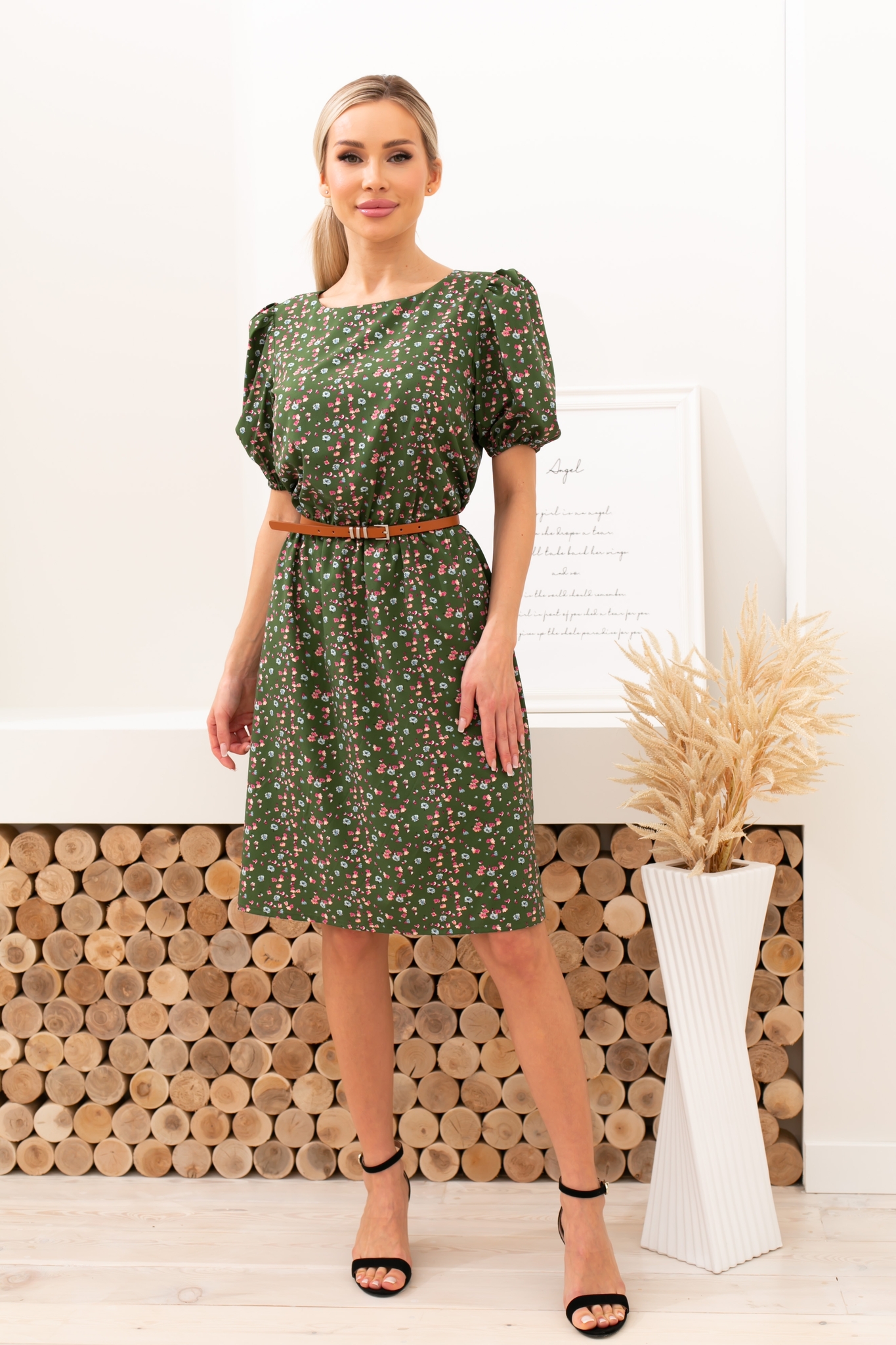 Красивое платье приталенного силуэта из легкой ткани Ниагара. Округлая горловина на внутренней обтачке с застежкой по спинке на петлю и пуговицу. Короткий втачной рукав фонарик присборен на эластичную резинку. Модель отрезная по линии талии присборена на резинку. Низ ровный, без разрезов.