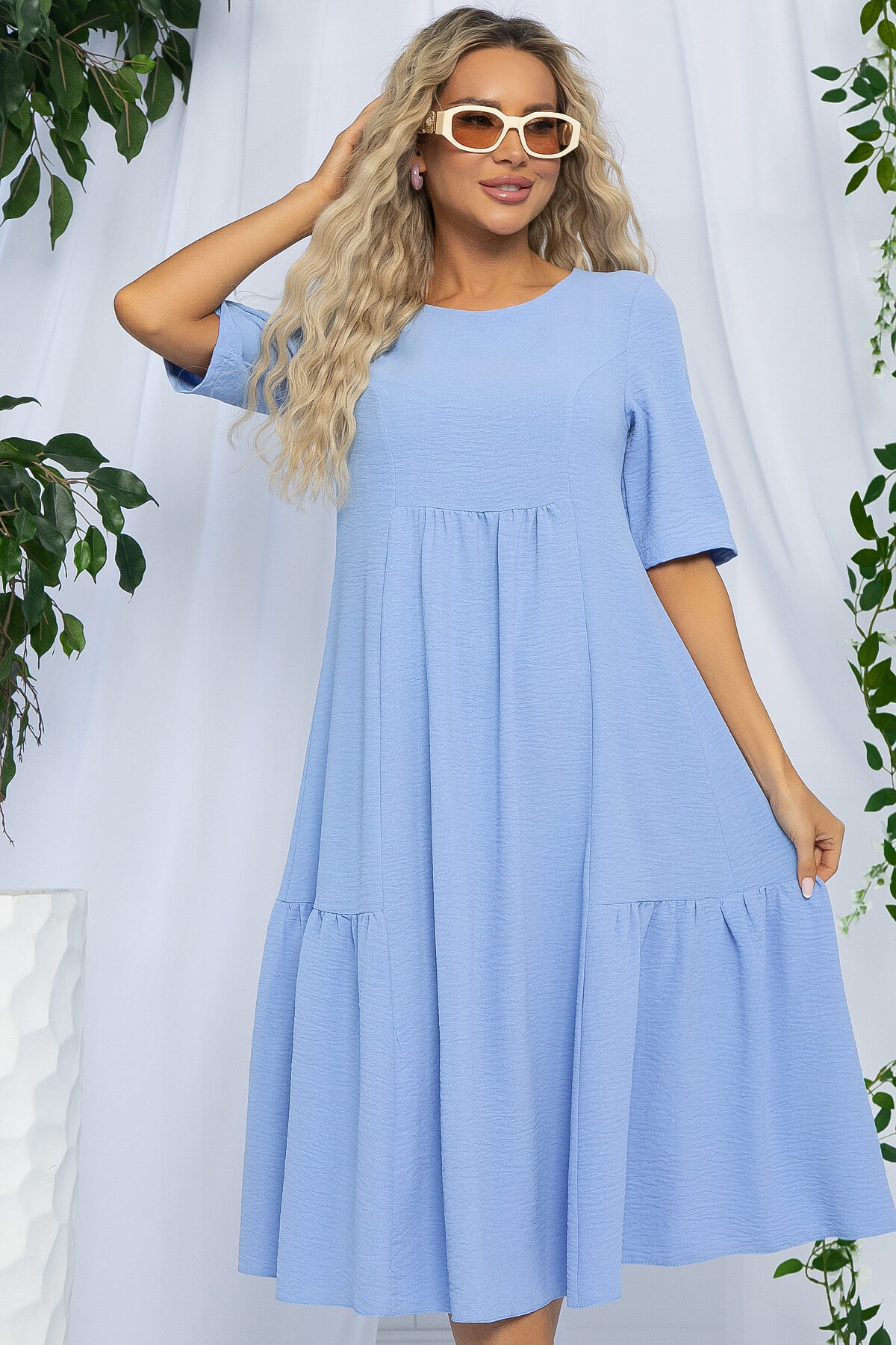 Платье свободного кроя средней длины — это прекрасный выбор для создания стильного и комфортного летнего образа! Его округлая горловина и втачные рукава средней длины придают платью изысканность. Платье расширяется к низу от линии груди, создавая нежный и воздушный силуэт. Декоративные элементы в виде сборок по бокам и чуть ниже линии груди спереди и сзади придают ему неповторимую изюминку. Это платье станет настоящим украшением вашего гардероба!