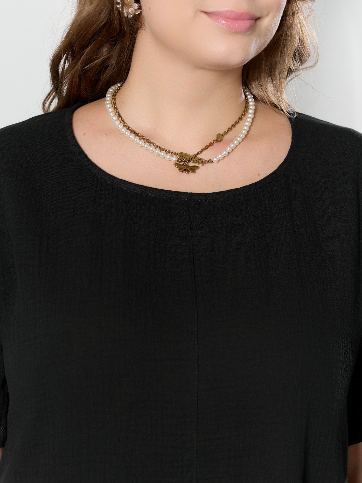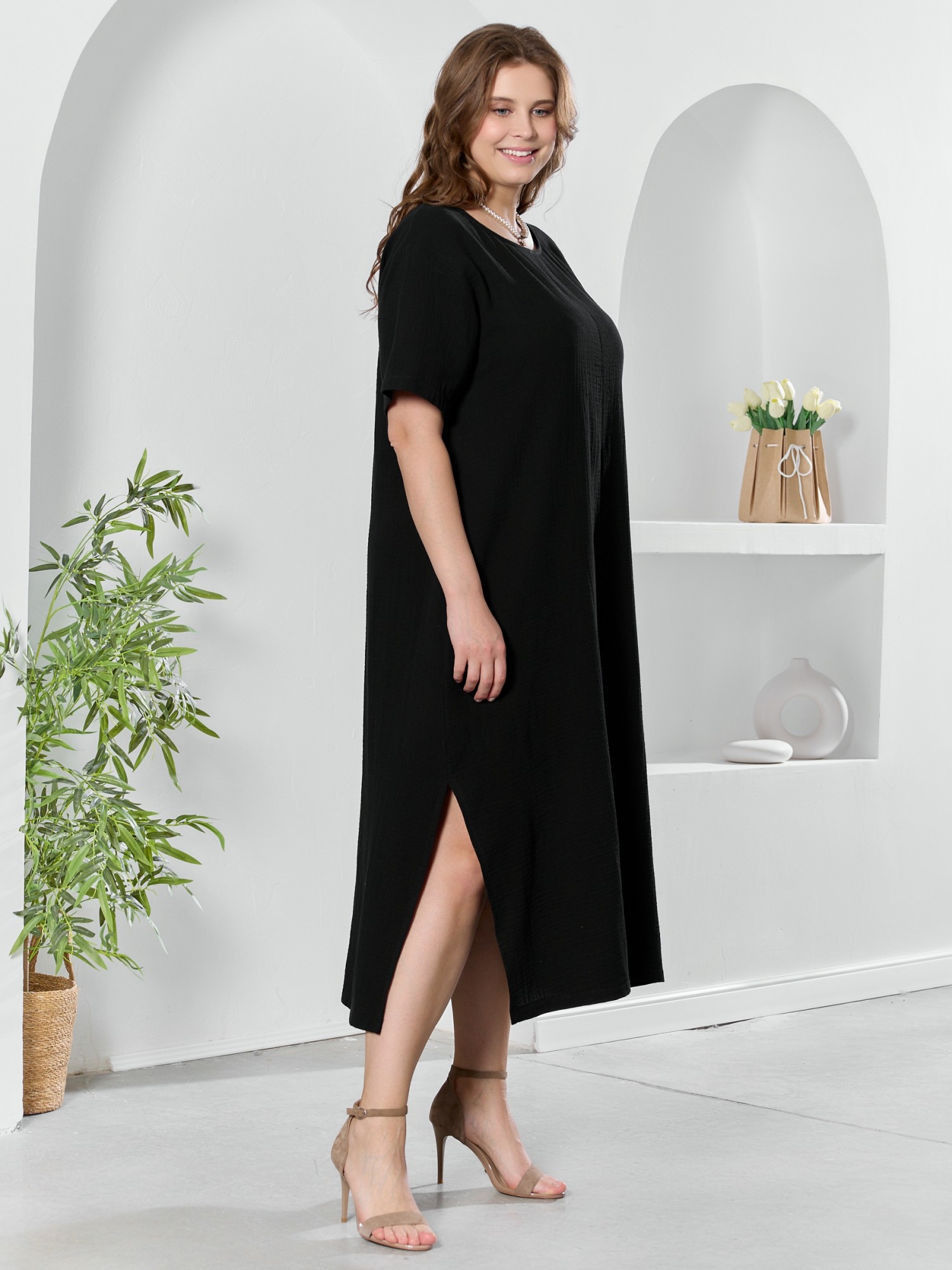 Платье женское из гладкокрашеного тканого полотна «муслин», прямого покроя, с горловиной овальной формы, короткими втачными рукавами. Полочка состоит из двух частей, в шве соединения деталей по центру – разрез, горловина окантована основным материалом.