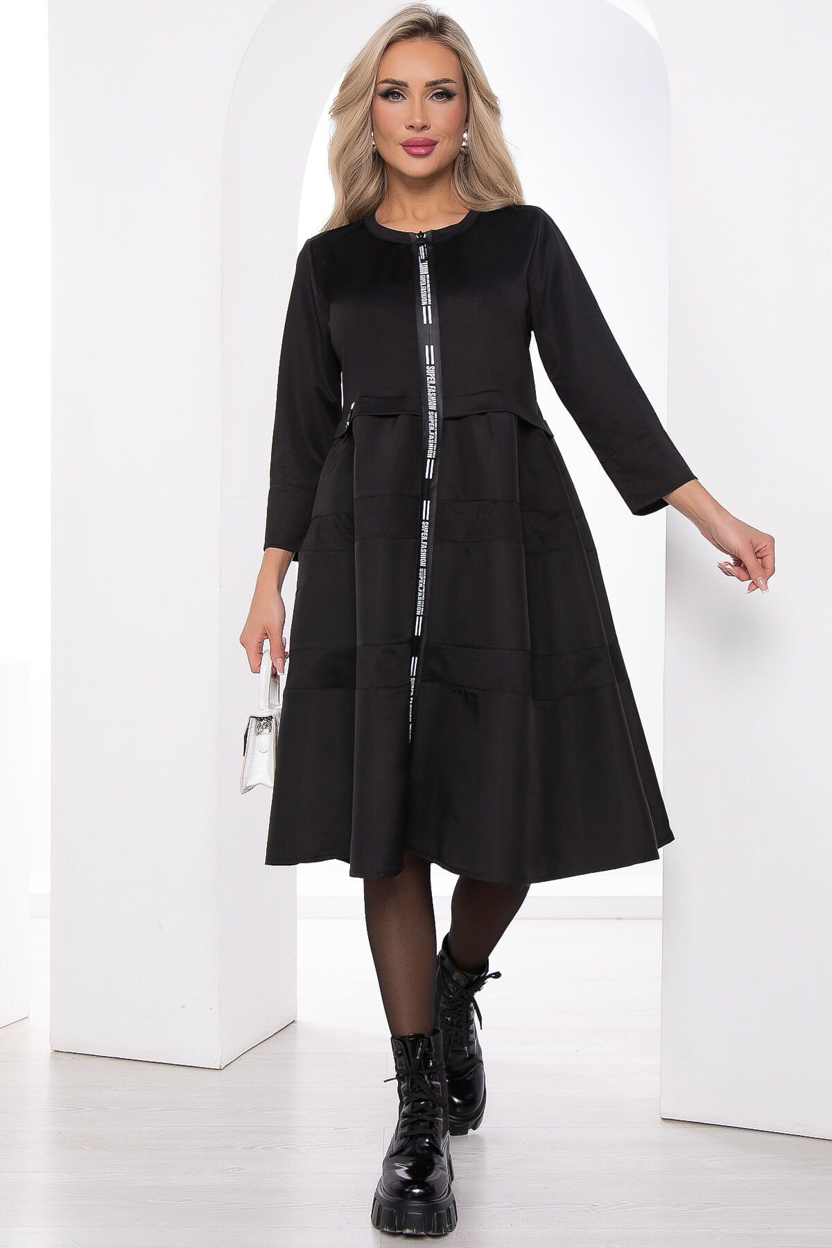 Повседневное платье в стиле спорт-шик из комбинированных материалов: плотного трикотажа и плащевки. Платье отрезное по линии талии, юбка состоит из ярусов. Такой фасон прекрасно подойдёт для повседневных мероприятий, будет хорошо сочетаться, как с обувью на плоской подошве, так и с каблуком. Плащевка неприхотлива в уходе, любые брызги или капли с неё можно удалить обычной влажной салфеткой. Молния по всей длине платья также является декоративным элементом. Платье без подкладки.