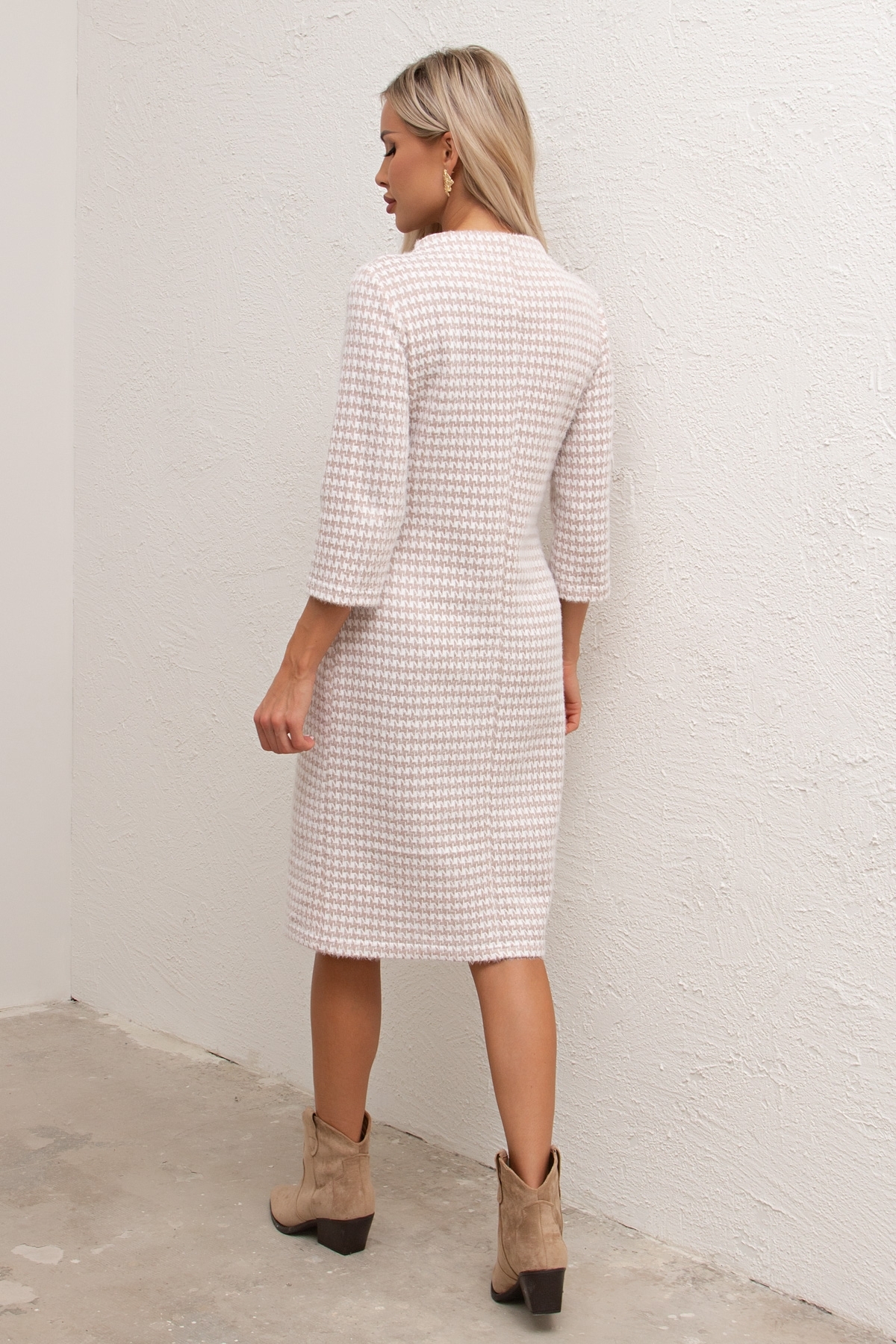 Комфортное платье прямого силуэта выполнено из трикотажного полотна Ангора. Горловина оформлена цельнокроеной стойкой - лодочка. Втачной рукав длиной 3/4. Низ ровный, без разрезов.
