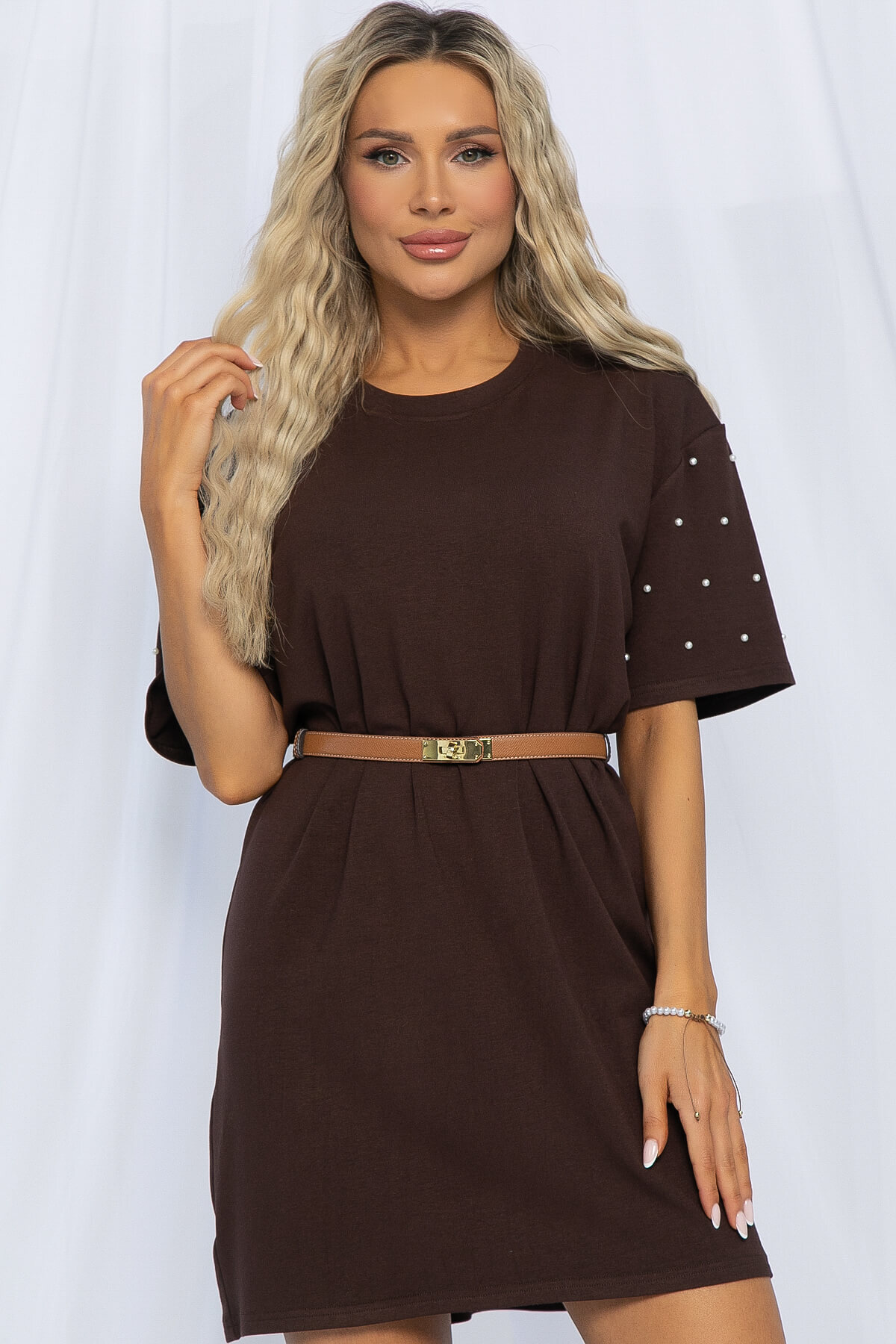 Платье-футболка мини-длины в красивом шоколадном оттенке — это то, что нужно для базового гардероба! Вы можете подчеркнуть свою талию, добавив тонкий ремешок на талии или широкий пояс. Особое внимание привлекают рукава, украшенные бусинами. Сочетайте его с кедами или сандалиями, чтобы создать непринуждённый и модный образ.
