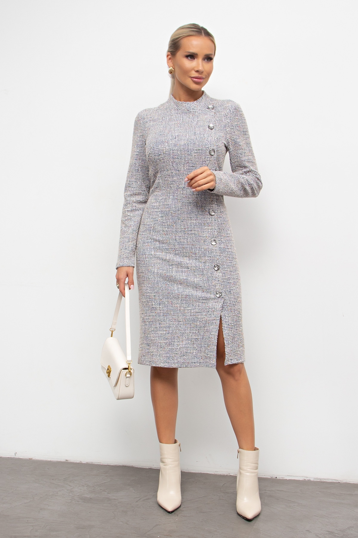 Элегантное платье прилегающего силуэта из трикотажного полотна - Меланж. Длинный втачной рукав. Горловина оформлена воротником - стойкой с запахом, переходящей в имитацию застежки на пуговицы. Модель без молнии. Низ ровный, по переду шлица.
