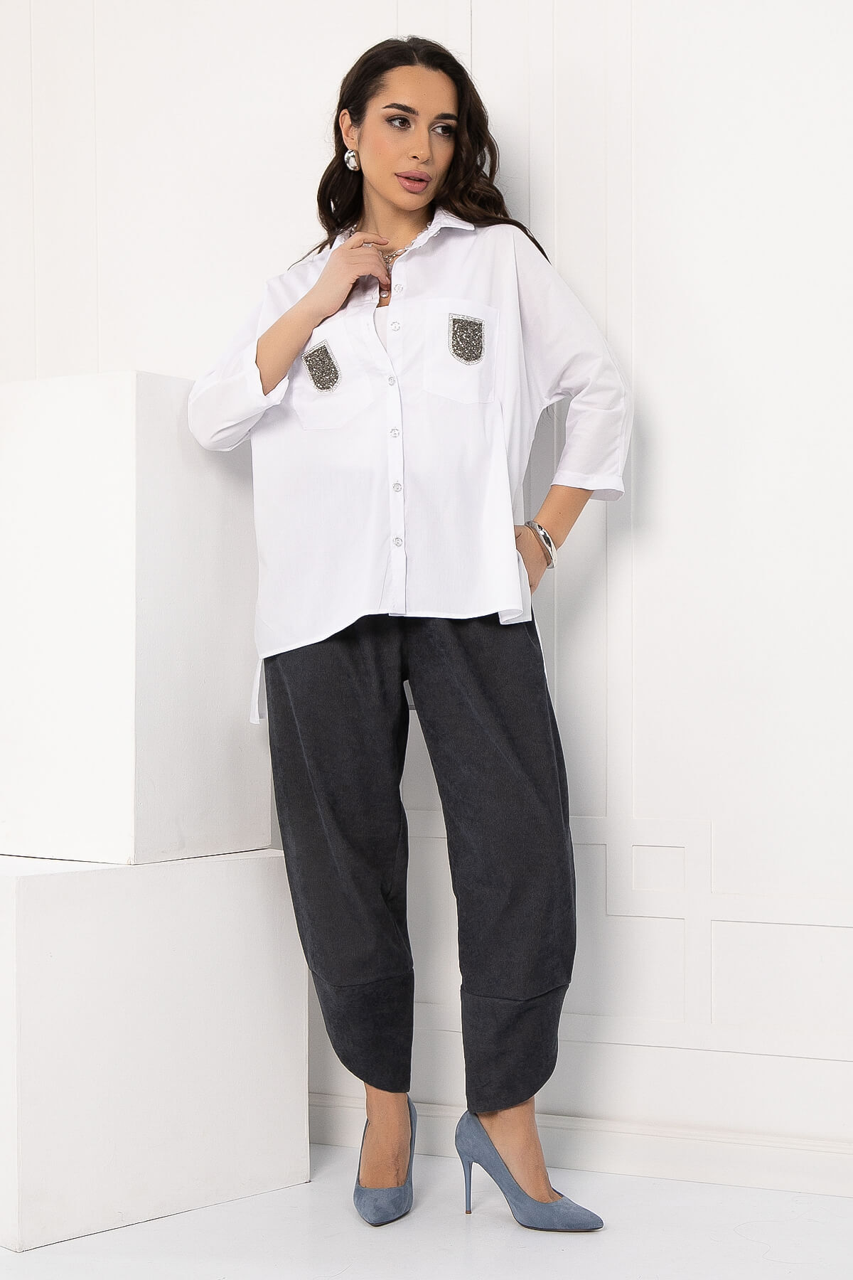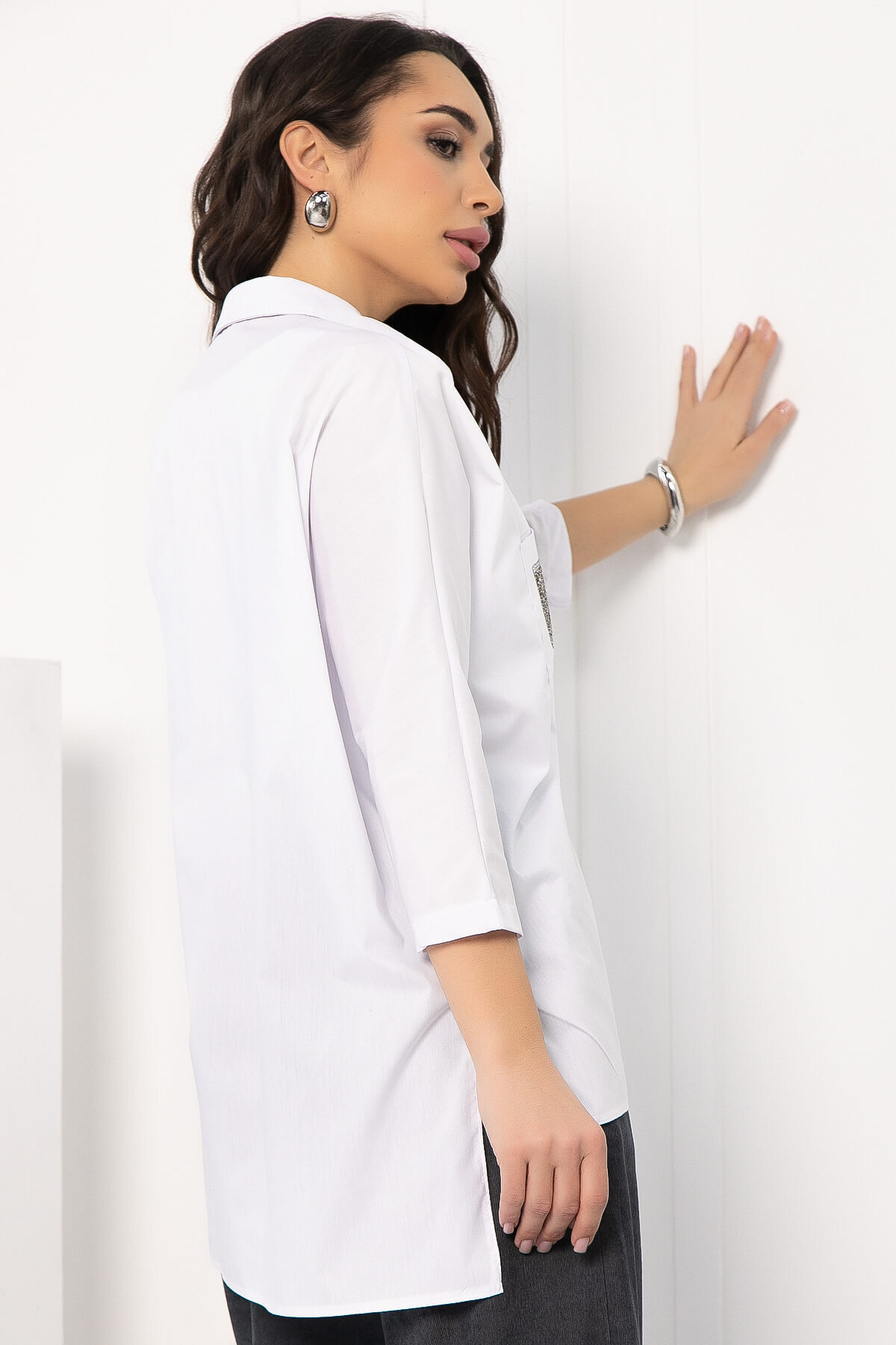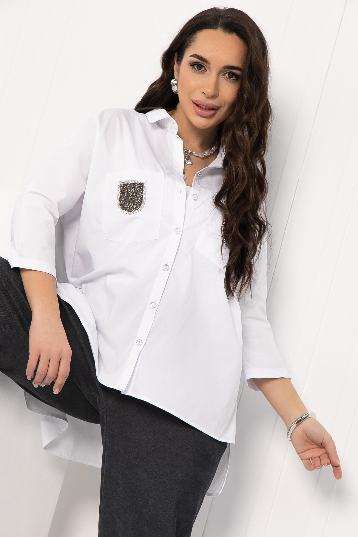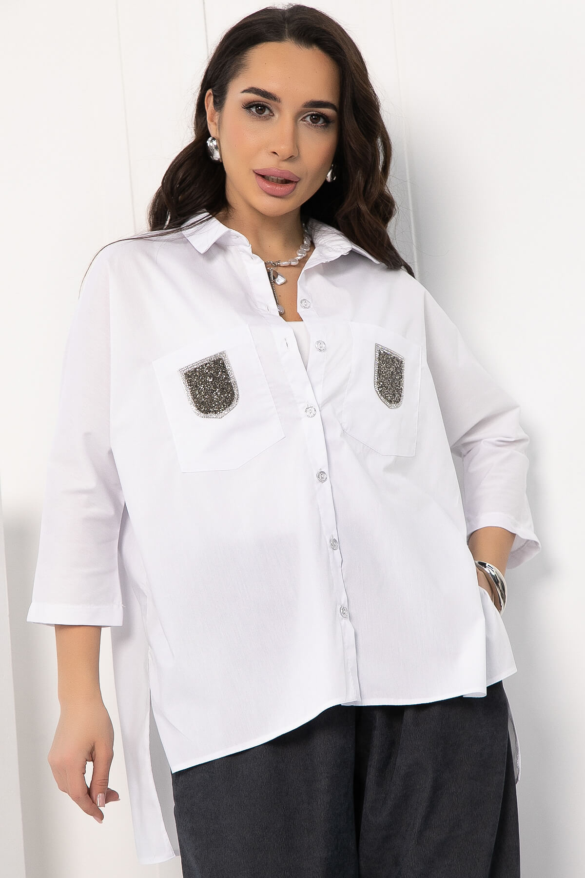 Стильная рубашка — базовая основа гардероба! Подходит как для офиса, так и для учёбы. Белый цвет и стразы на карманах делают ее нарядной и подходящей для любого повода. Рукава 3/4, два накладных кармана, длина рубашки сзади длиннее, чем спереди. Оверсайз-модель придает стильный и современный вид, при этом прекрасно скрывая все недостатки фигуры. Это великолепный выбор для тех, кто предпочитает оригинальность и стиль в своем аутфите. Прекрасно сочетается с различными низами и аксессуарами.