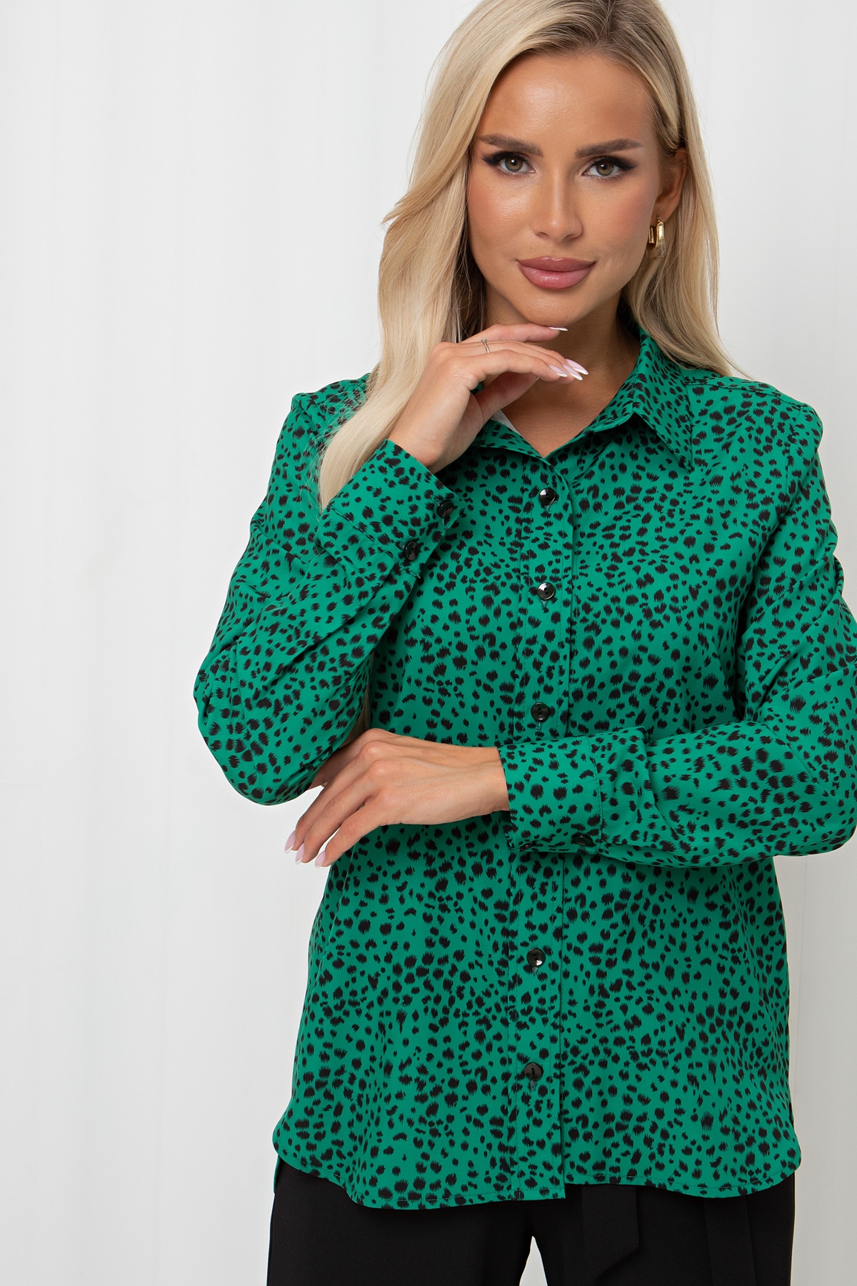 Стильная рубашка прямого силуэта с оригинальным принтом. Длинные втачные рукава оканчиваются манжетами с застежкой на пуговицу. Горловина оформлена классическим воротником на стойке, переходящим в планку с застежкой на пуговицы. Спинка дополнена кокеткой со складкой. Низ фигурный, без разрезов. Рубашка отлично смотрится как заправленная, так и на выпуск.