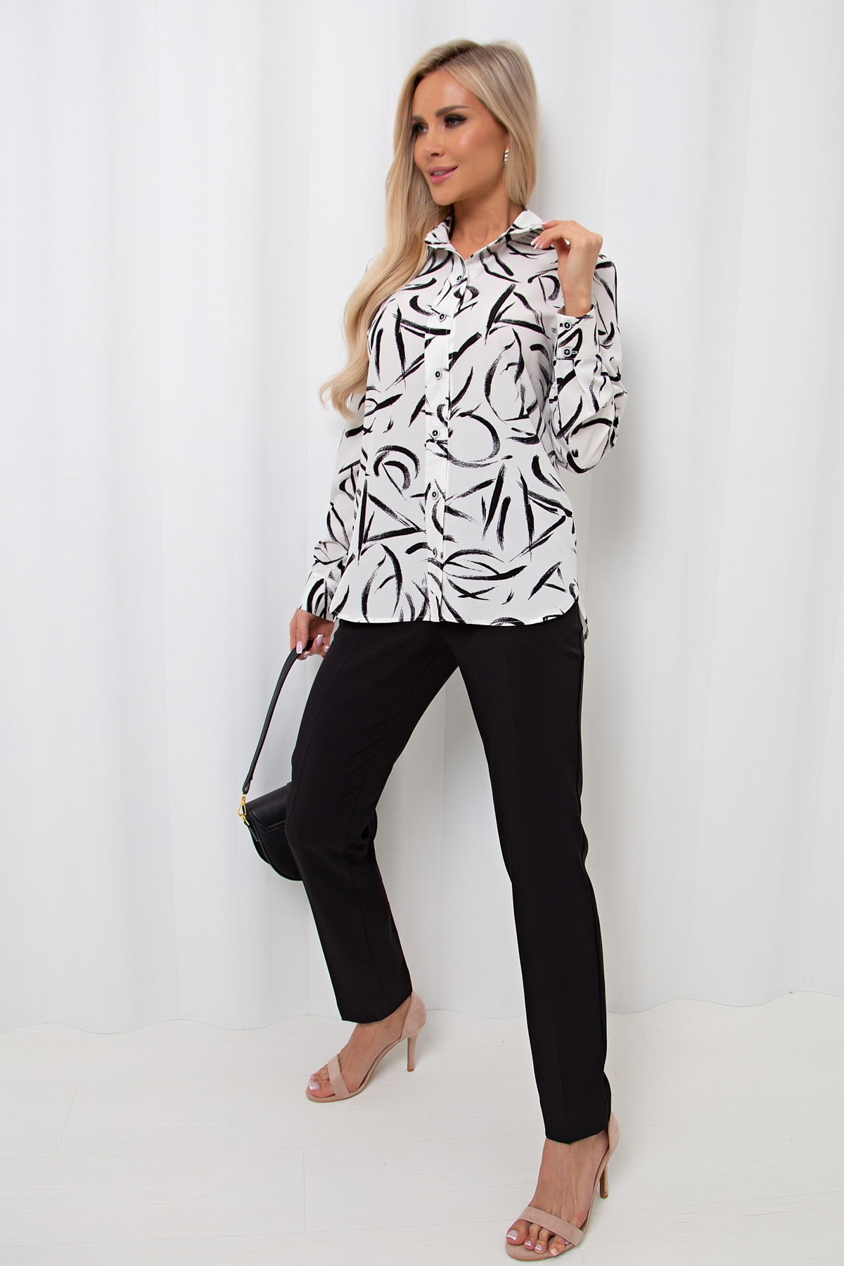 Стильная рубашка прямого силуэта с оригинальным принтом. Длинные втачные рукава оканчиваются манжетами с застежкой на пуговицу. Горловина оформлена классическим воротником на стойке, переходящим в планку с застежкой на пуговицы. Спинка дополнена кокеткой со складкой. Низ фигурный, без разрезов. Рубашка отлично смотрится как заправленная, так и на выпуск.