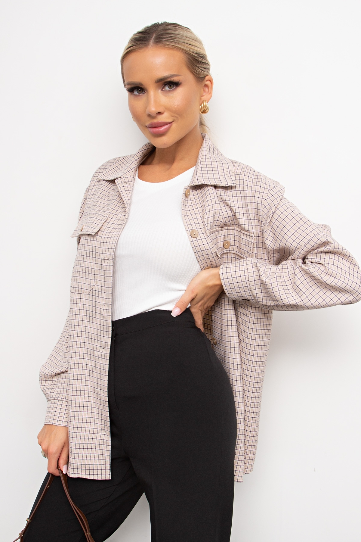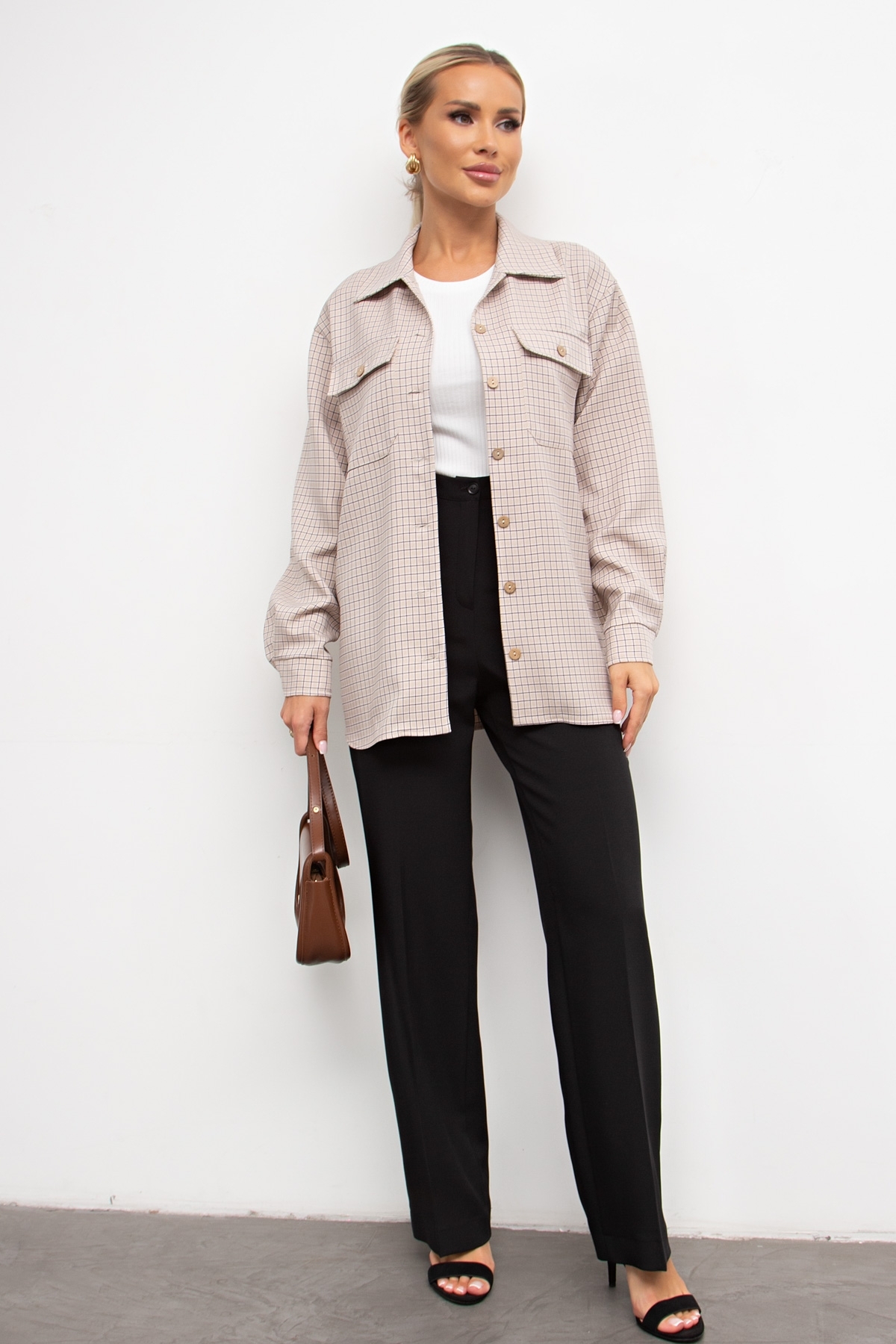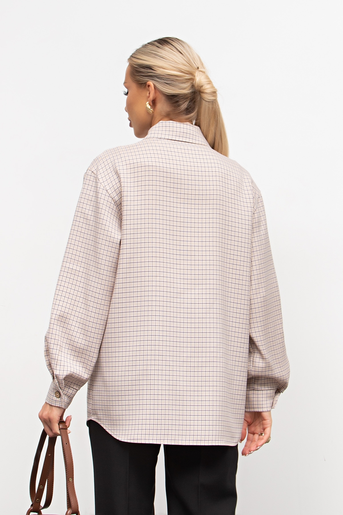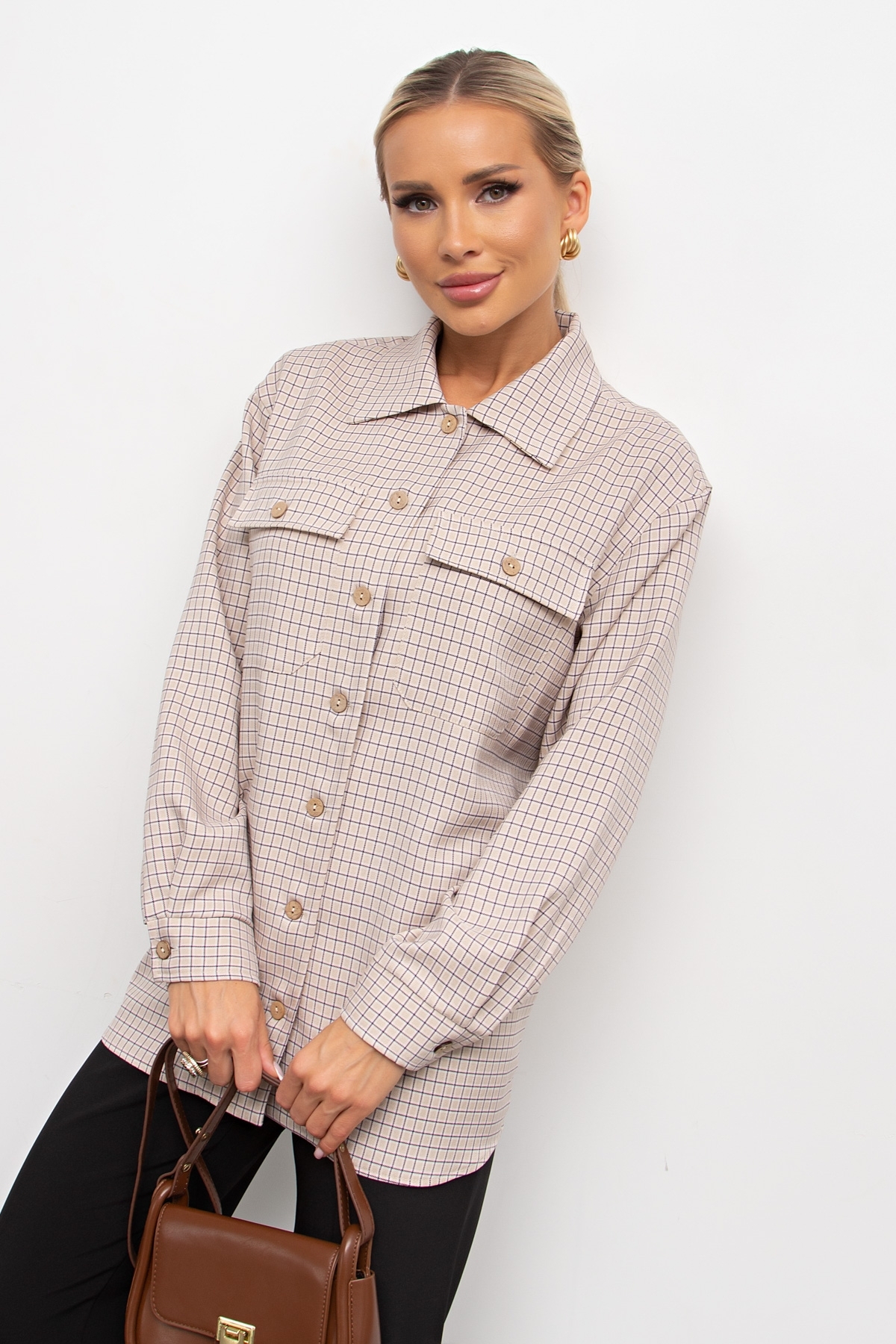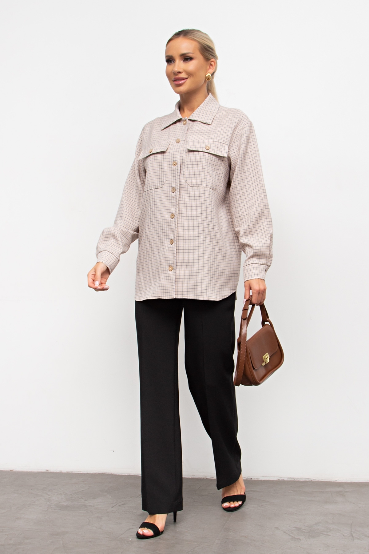Стильная рубашка свободного кроя. Модель с накладными карманами на пуговицах. Горловина оформлена отложным воротником, переходящим в планку с застежкой на петли и пуговицы. Длинный втачной рукав со спущенным плечом, оканчивается притачной манжетой. Низ фигурный. Рубашку можно сочетать с джинсами, кожаными брюками, а так же создавать многослойные стильные образы.