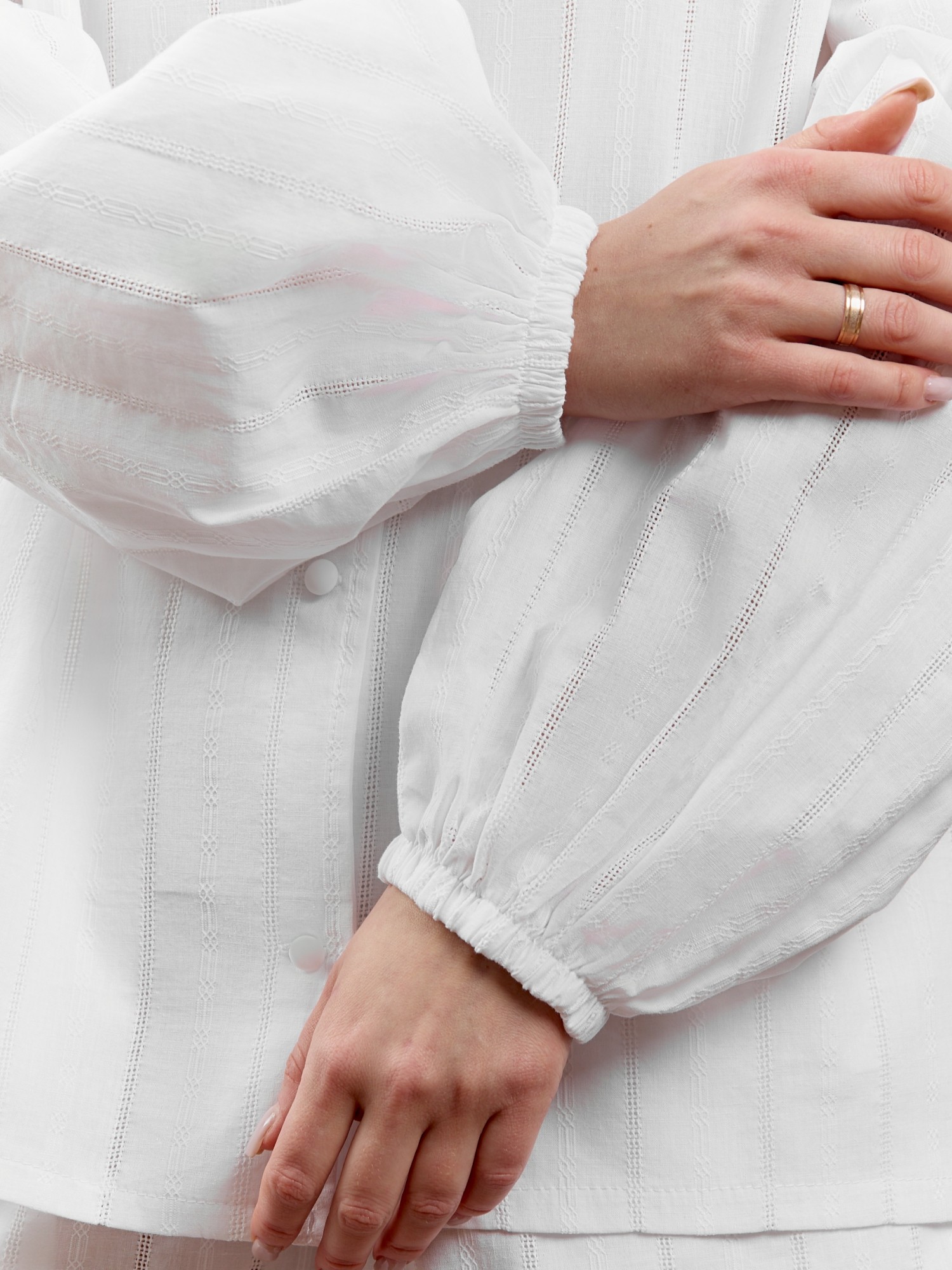 Рубашка женская из гладкокрашеного тканого полотна «батист» шитье, свободного покроя, с глубокой V-образной горловиной, длинными широкими рукавами, понизу обработанными подгибкой, с вложением эластичной тесьмы создающей эффект «фонарика». Горловина обработана внутренними обтачками, центральная бортовая застежка на петли и пуговицы.