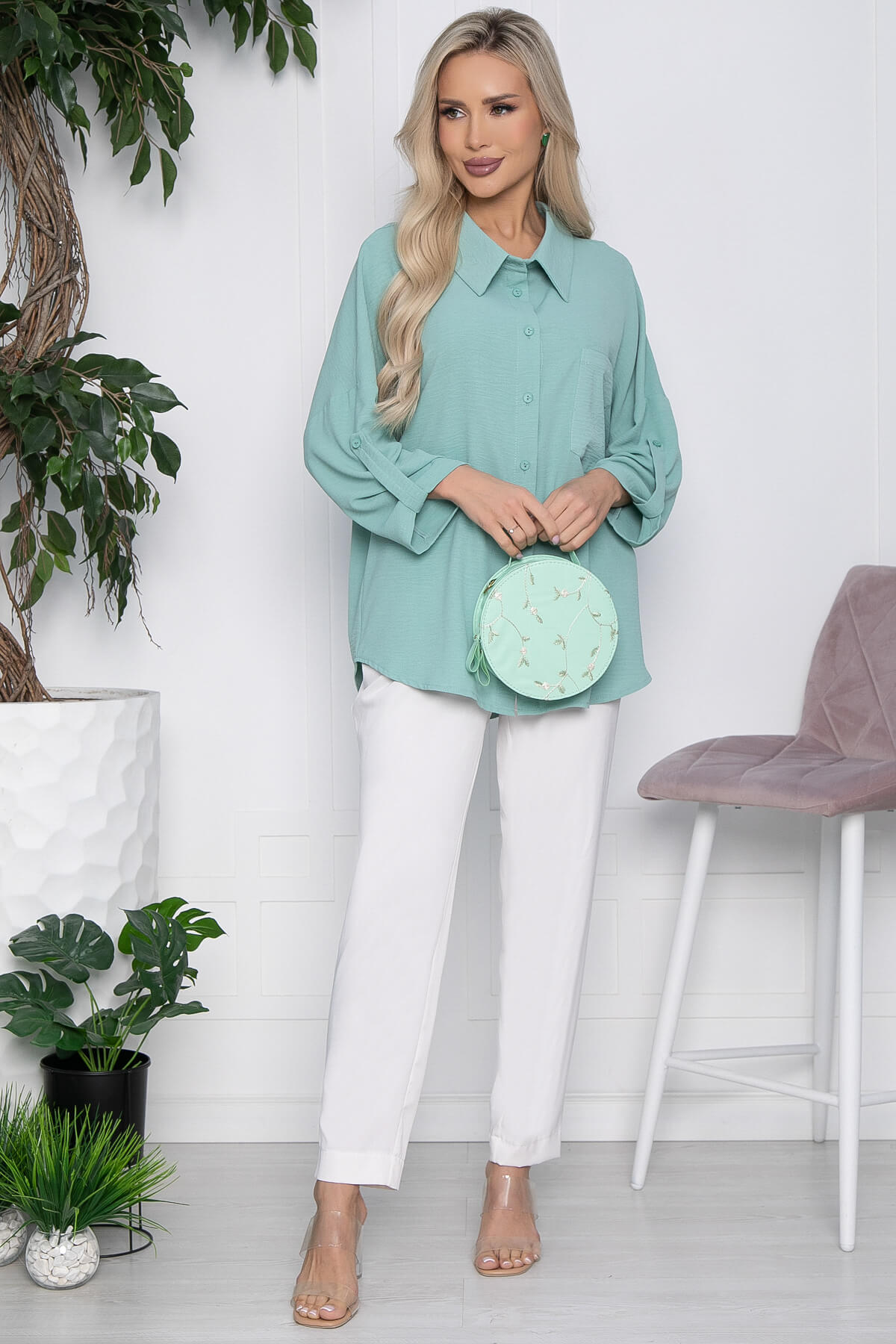 Лёгкая рубашка свободного кроя с акцентной спинкой. Классический отложной воротник по переду, по спинке украшен цепочкой серебряного цвета. Рукав втачной, 3/4, на пате. Такая рубашка подойдёт для создания стильного летнего образа и будет гармонично смотреться в сочетаниях с джинсами, шортами и брюками.