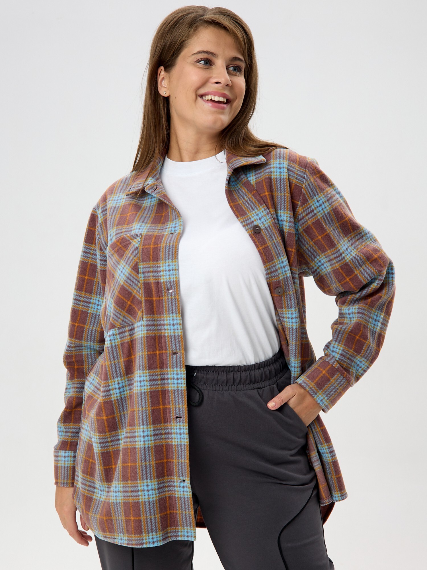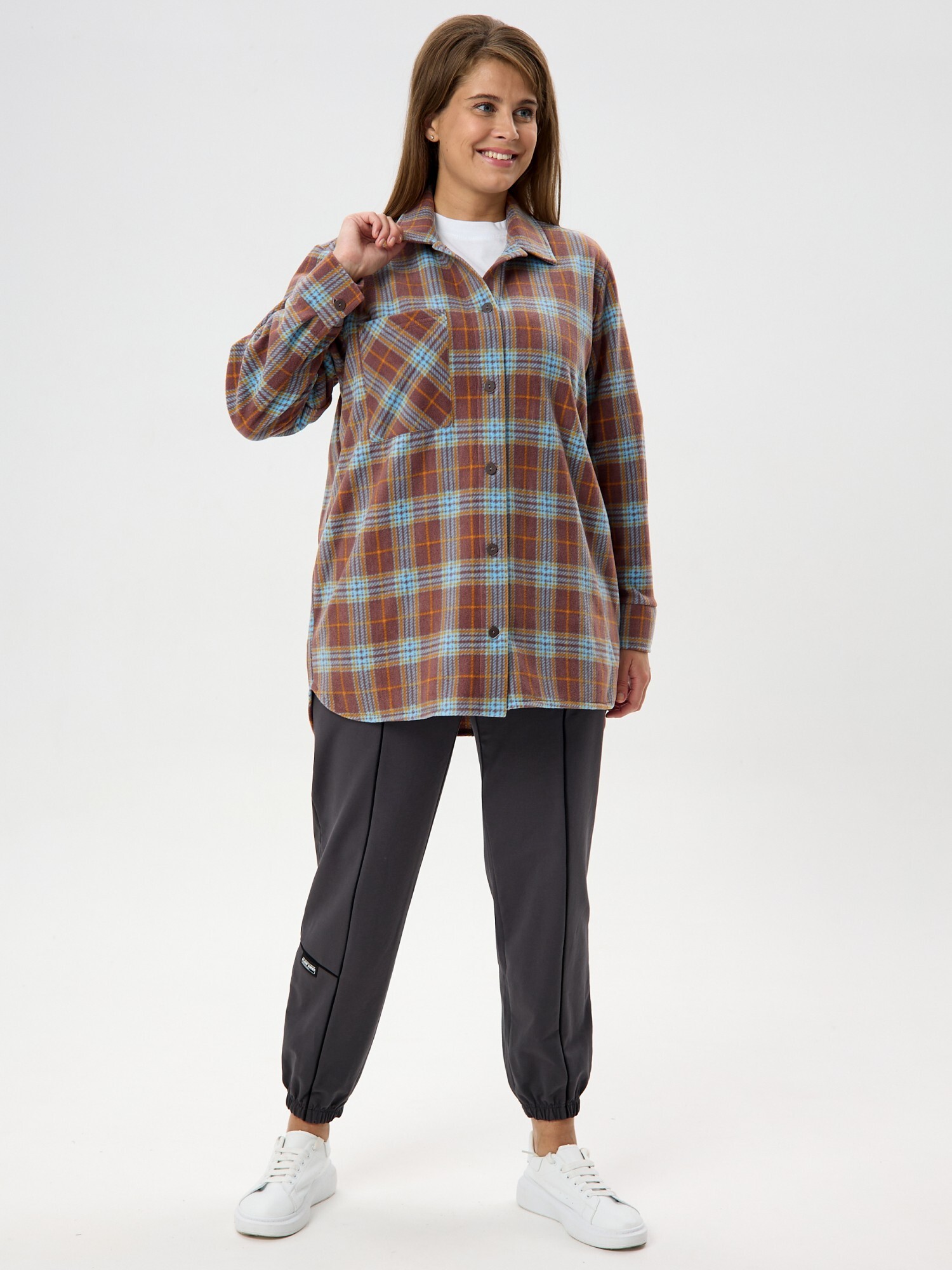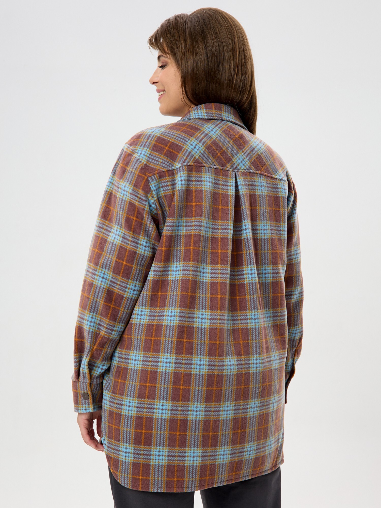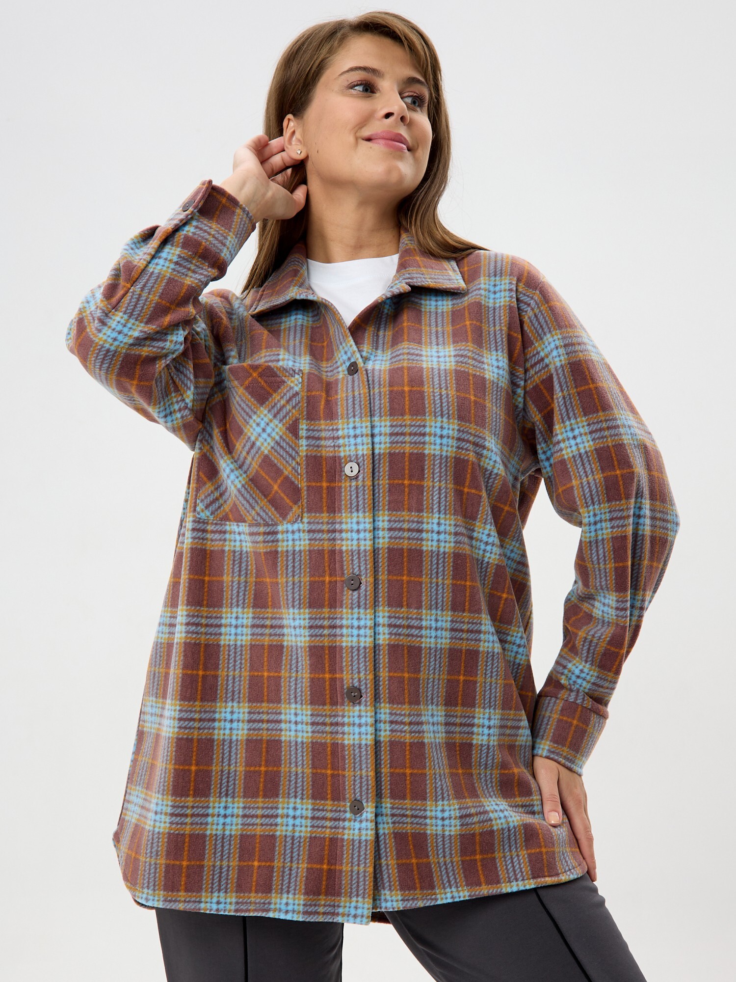 Рубашка (туника) женская из трикотажного полотна «флис» с набивным рисунком «клетка», свободного силуэта, с длинными втачными рукавами напритачных манжетах, стояче-отложным воротником, нагрудным карманом,фигурным низом и центральной бортовой застежкой на петли и пуговицы. Спинка – с отрезной кокеткой и бантовой складкой в центре соединительного шва.