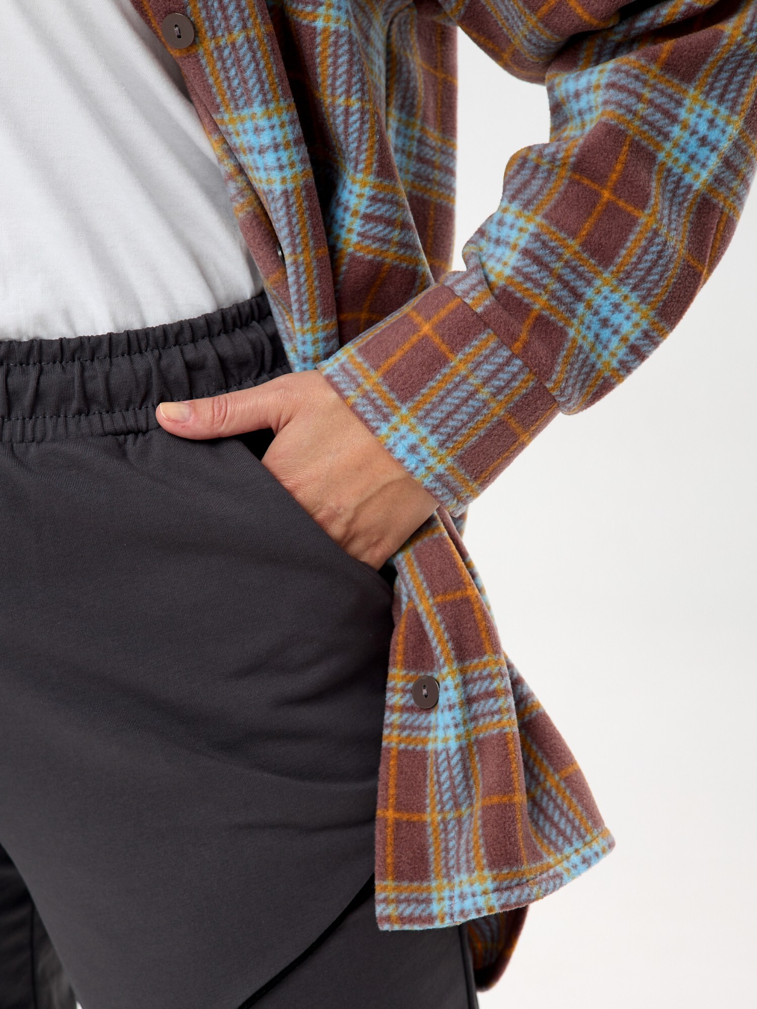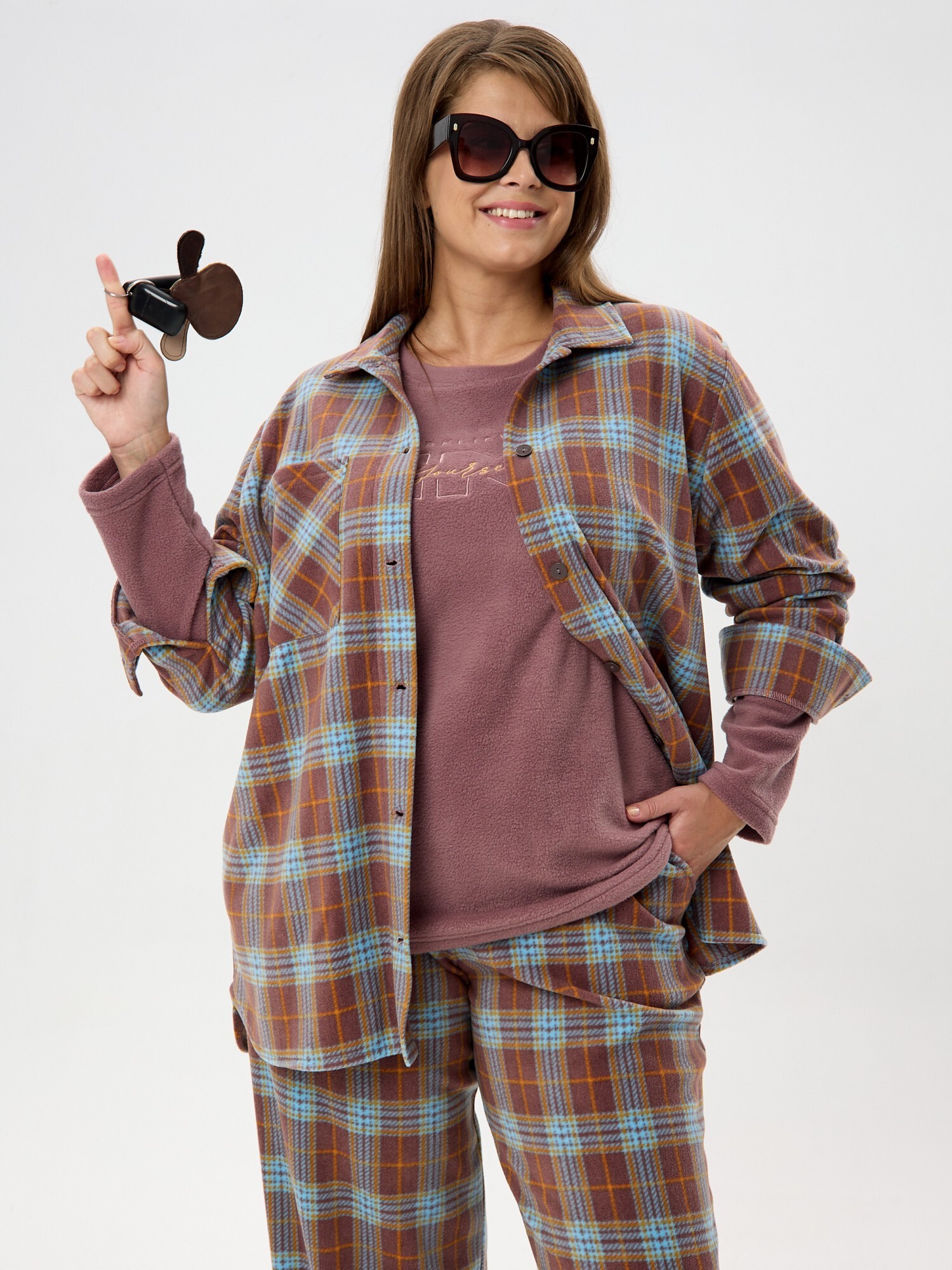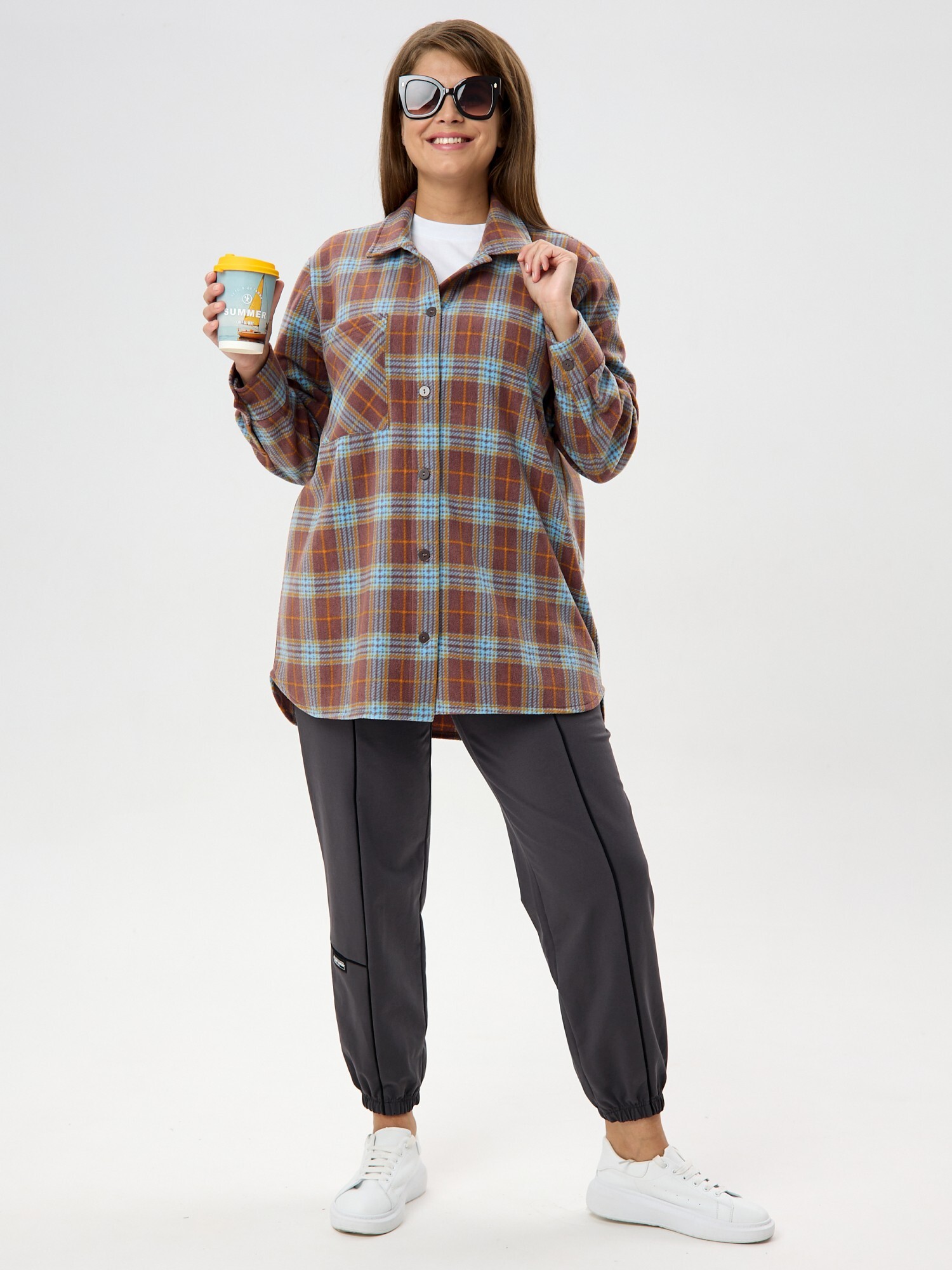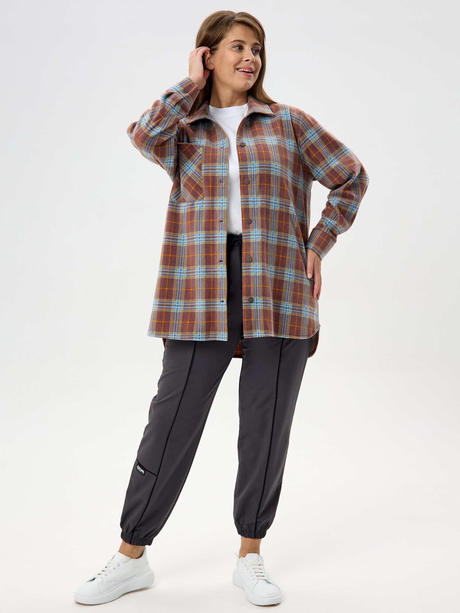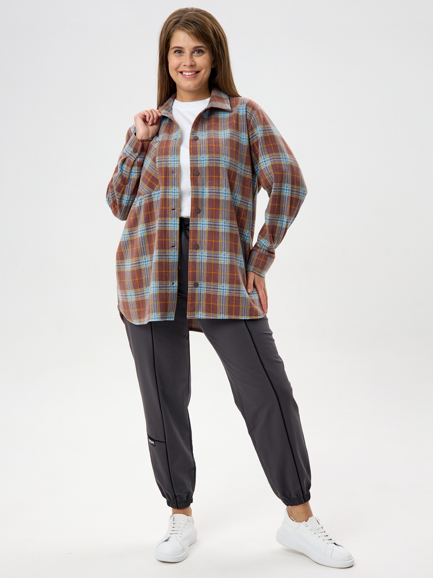 Рубашка (туника) женская из трикотажного полотна «флис» с набивным рисунком «клетка», свободного силуэта, с длинными втачными рукавами напритачных манжетах, стояче-отложным воротником, нагрудным карманом,фигурным низом и центральной бортовой застежкой на петли и пуговицы. Спинка – с отрезной кокеткой и бантовой складкой в центре соединительного шва.