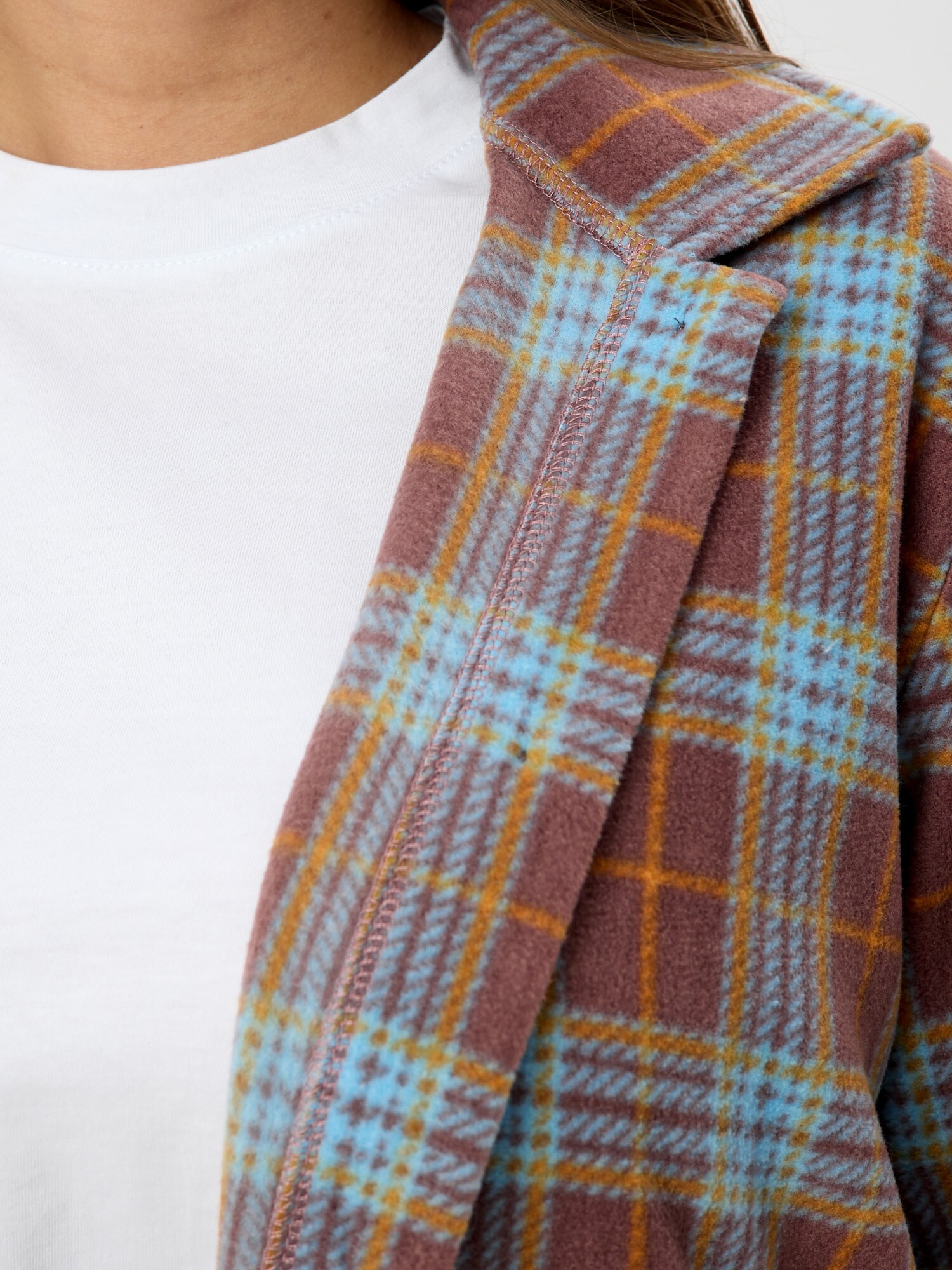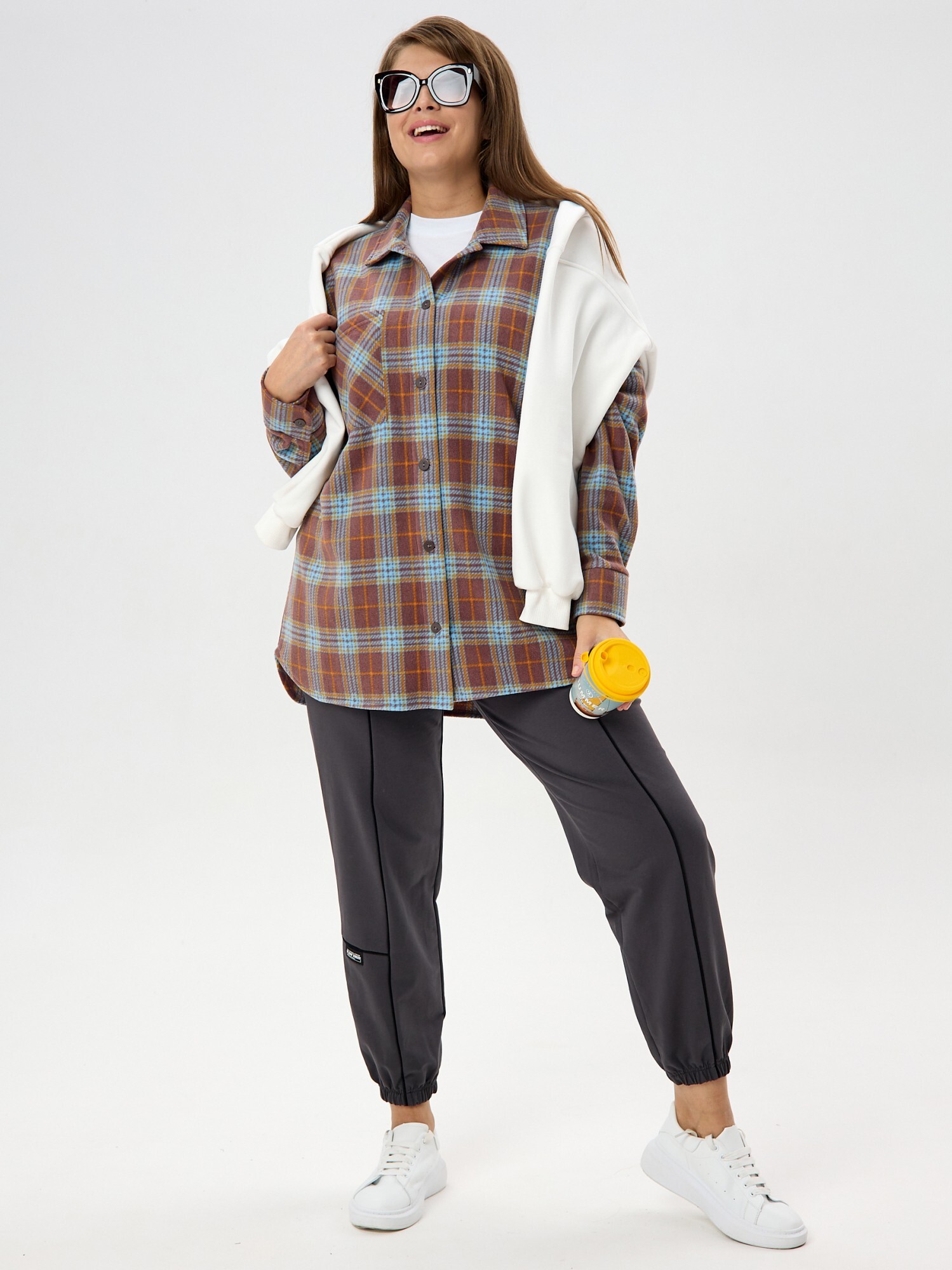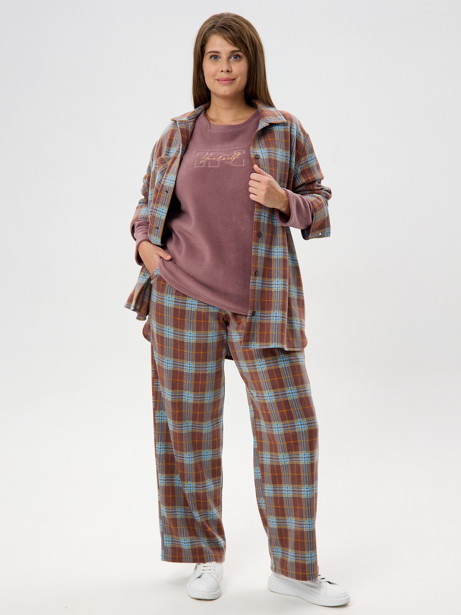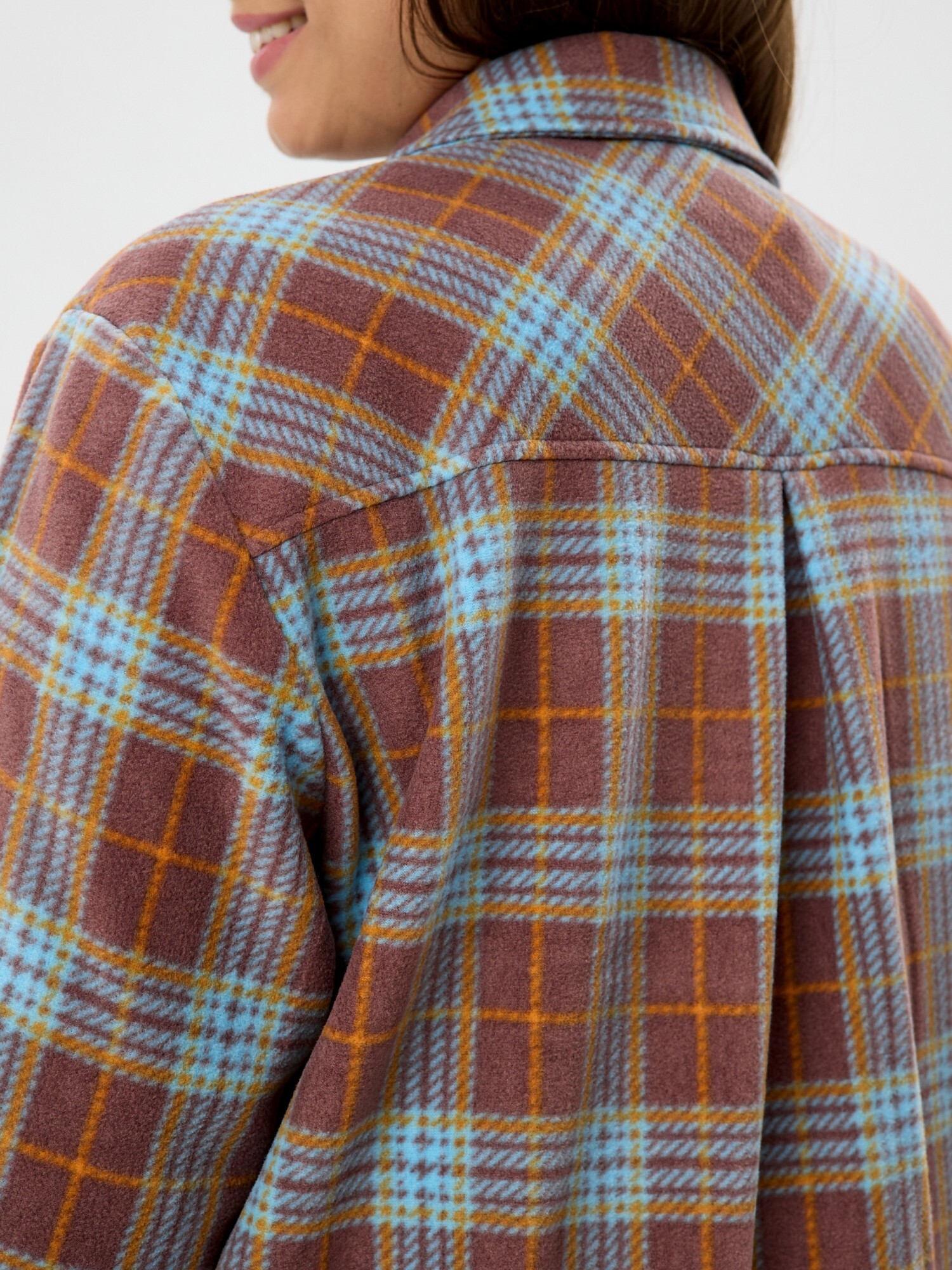 Рубашка (туника) женская из трикотажного полотна «флис» с набивным рисунком «клетка», свободного силуэта, с длинными втачными рукавами напритачных манжетах, стояче-отложным воротником, нагрудным карманом,фигурным низом и центральной бортовой застежкой на петли и пуговицы. Спинка – с отрезной кокеткой и бантовой складкой в центре соединительного шва.