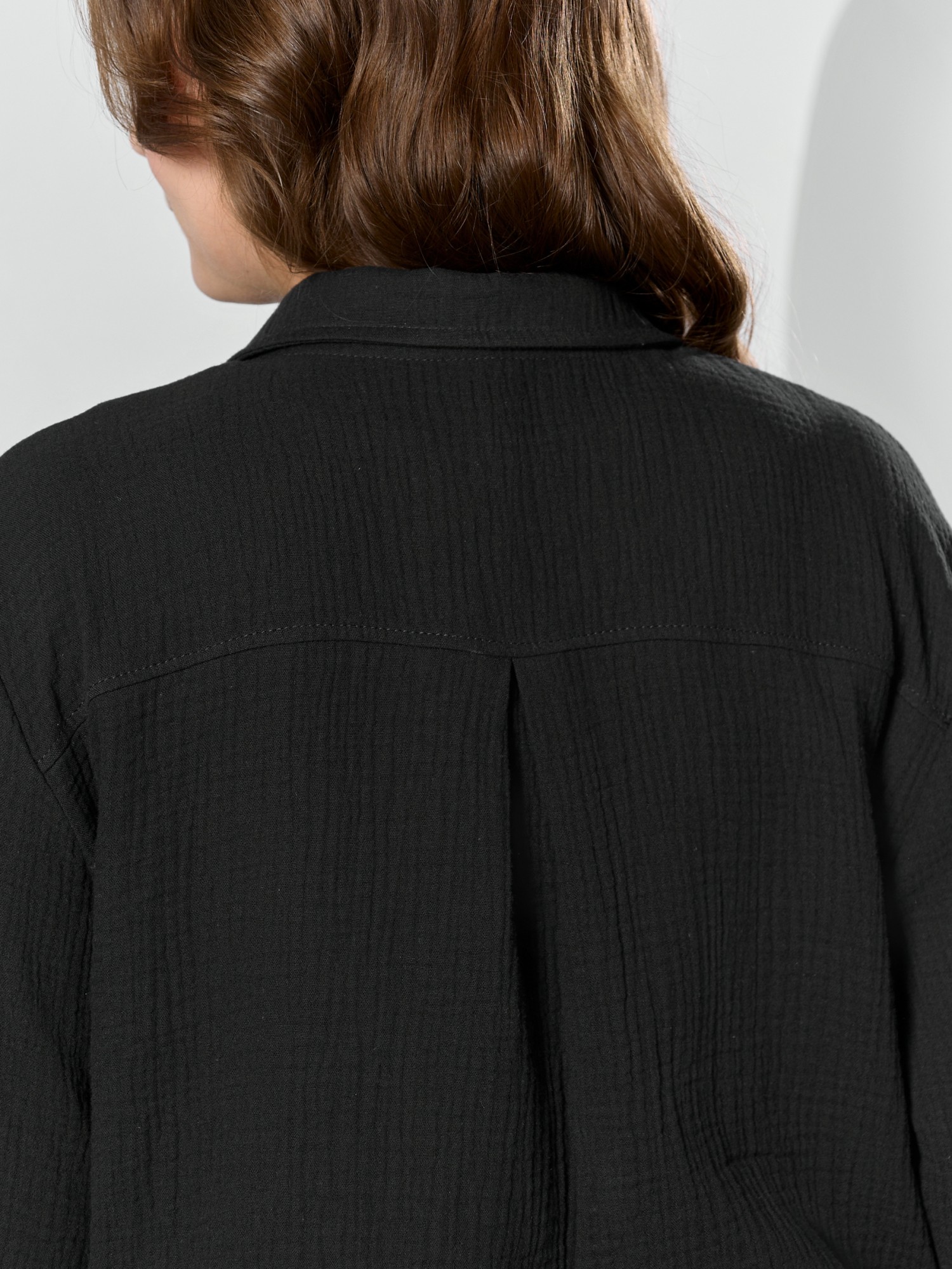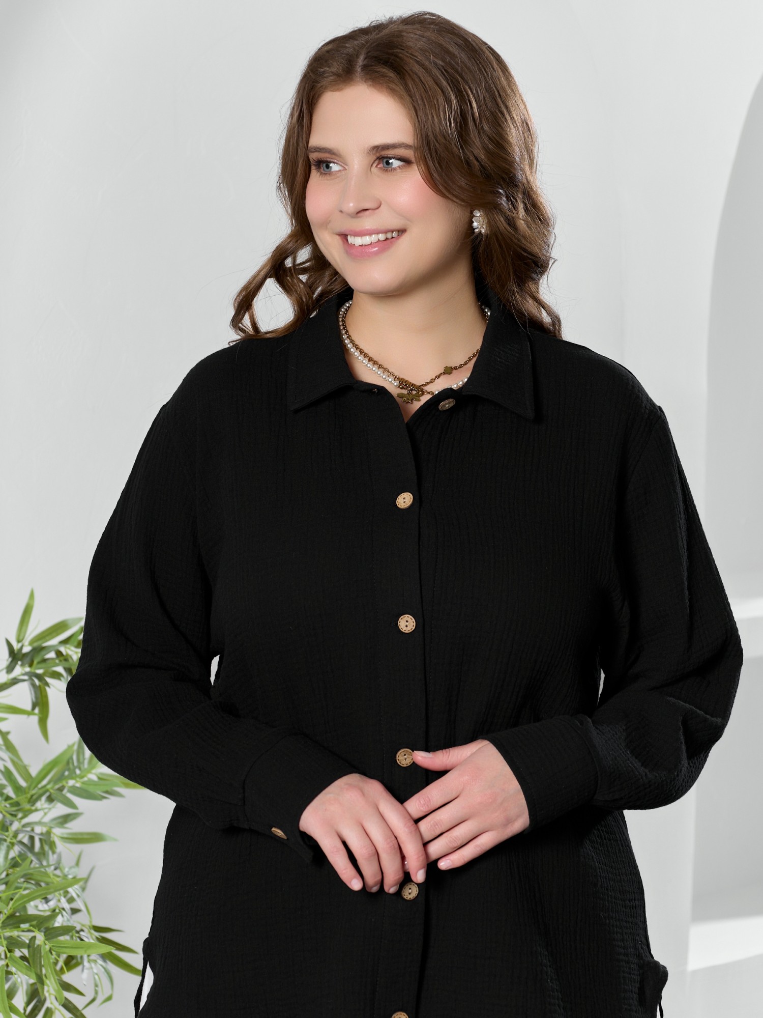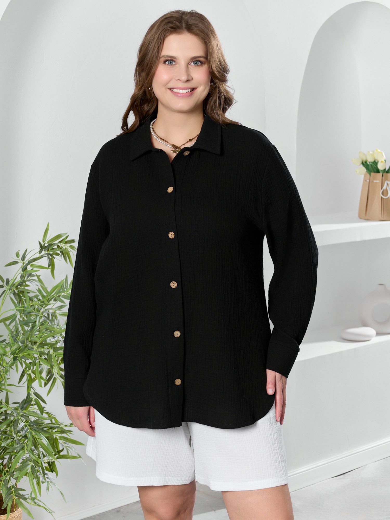 Рубашка – женская из гладкокрашеного тканого полотна «муслин», прямого силуэта, с длинными втачными рукавами на притачных манжетах, стояче-отложным воротником, фигурным низом и центральной бортовой застежкой на петли и пуговицы. Спинка – с отрезной кокеткой и бантовой складкой в центре соединительного шва.
