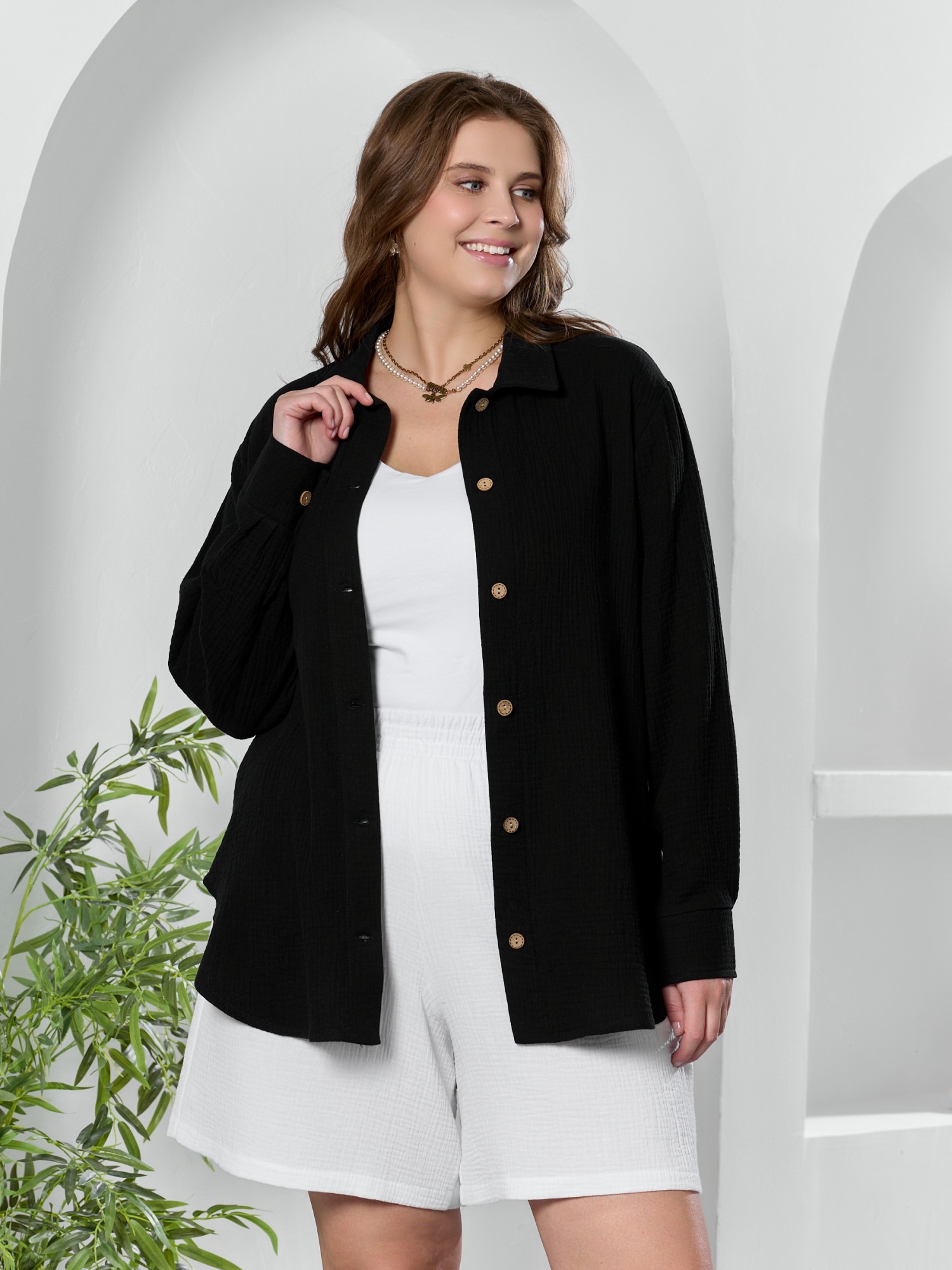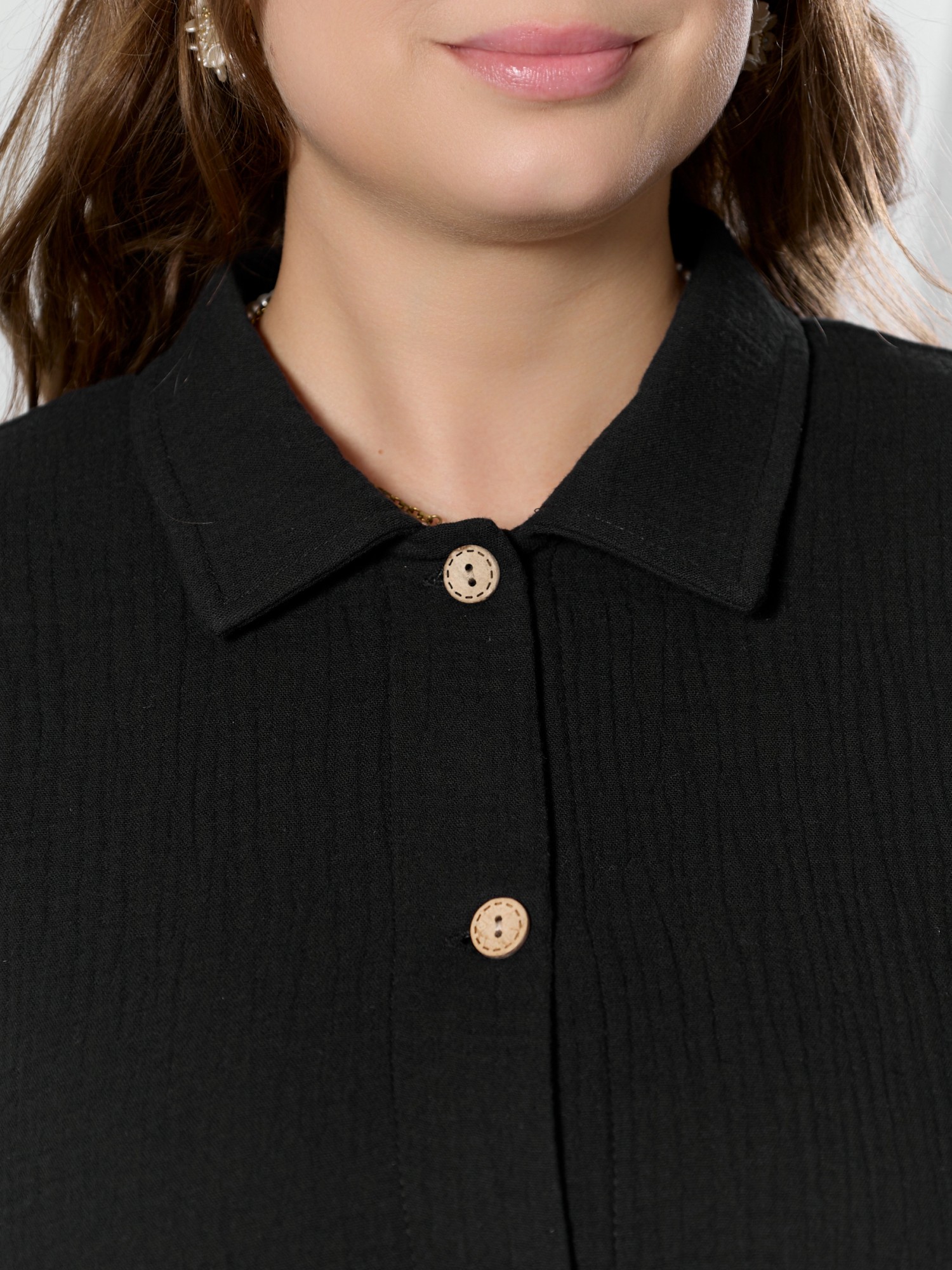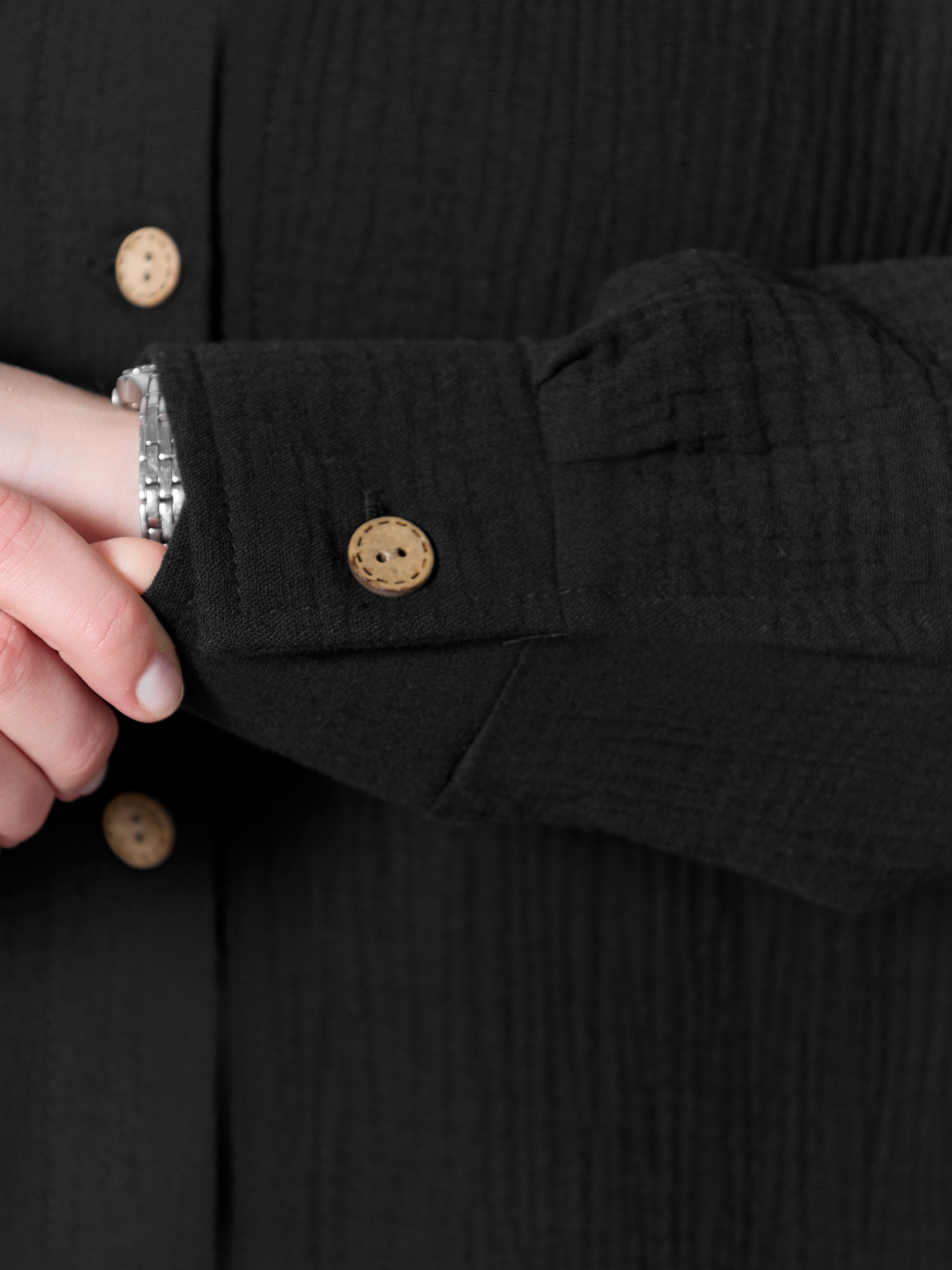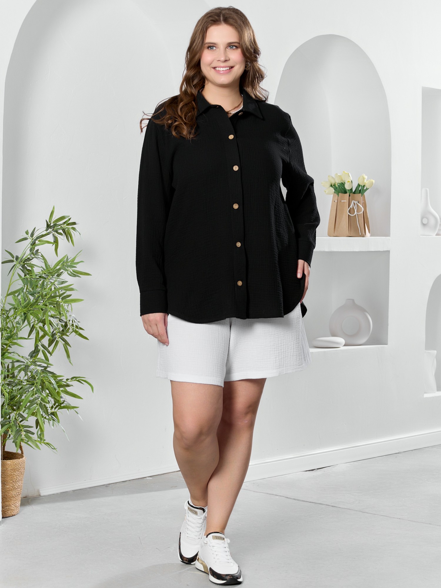 Рубашка – женская из гладкокрашеного тканого полотна «муслин», прямого силуэта, с длинными втачными рукавами на притачных манжетах, стояче-отложным воротником, фигурным низом и центральной бортовой застежкой на петли и пуговицы. Спинка – с отрезной кокеткой и бантовой складкой в центре соединительного шва.