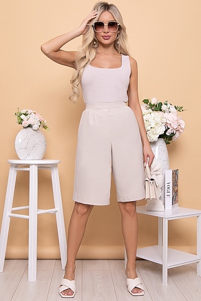 Шорты из легкой костюмной ткани без застежки,с имитацией гульфика по переду.По бокам функциональные карманы.Притачной пояс с эластичной резиной по бокам и спинке.