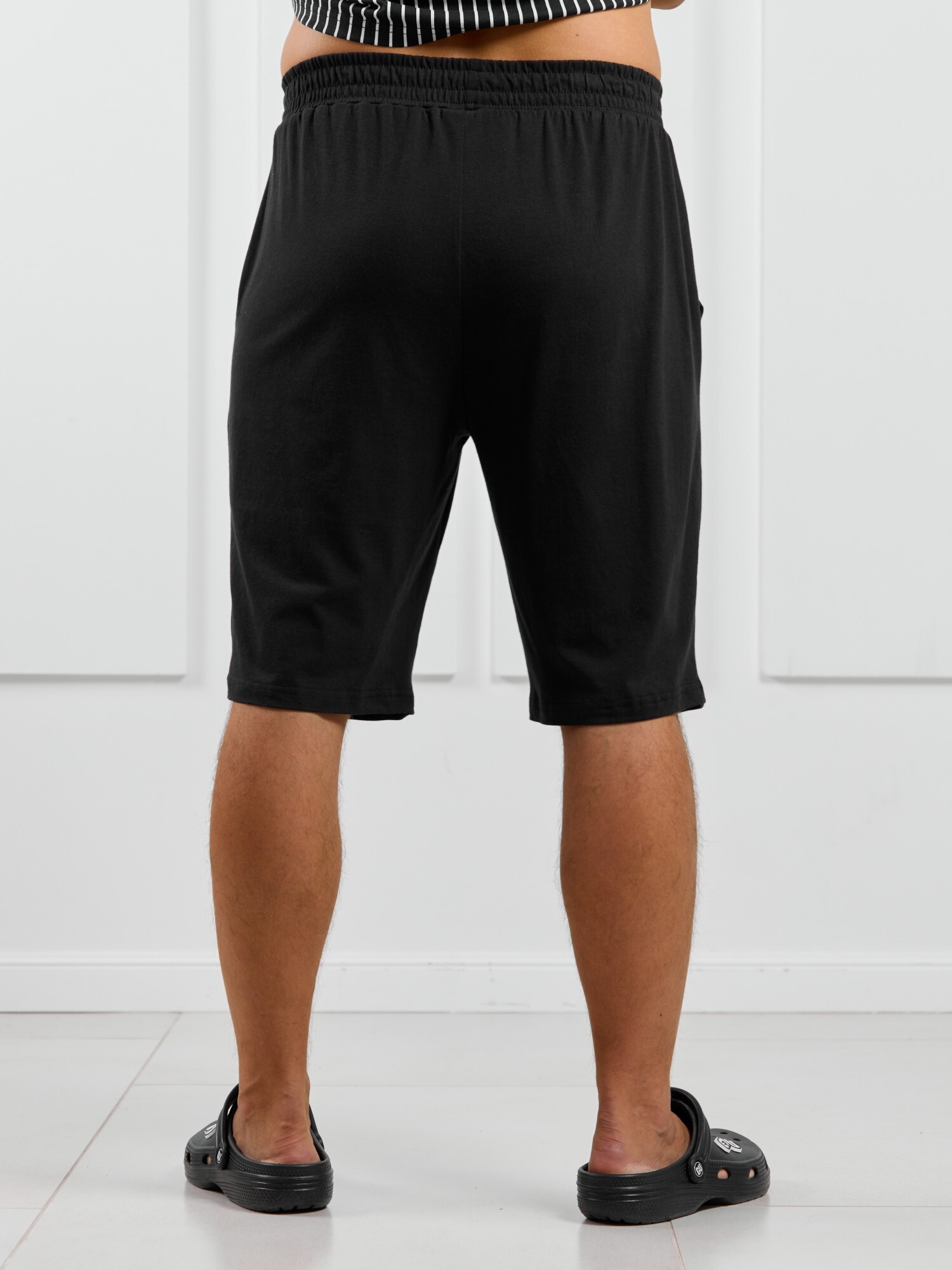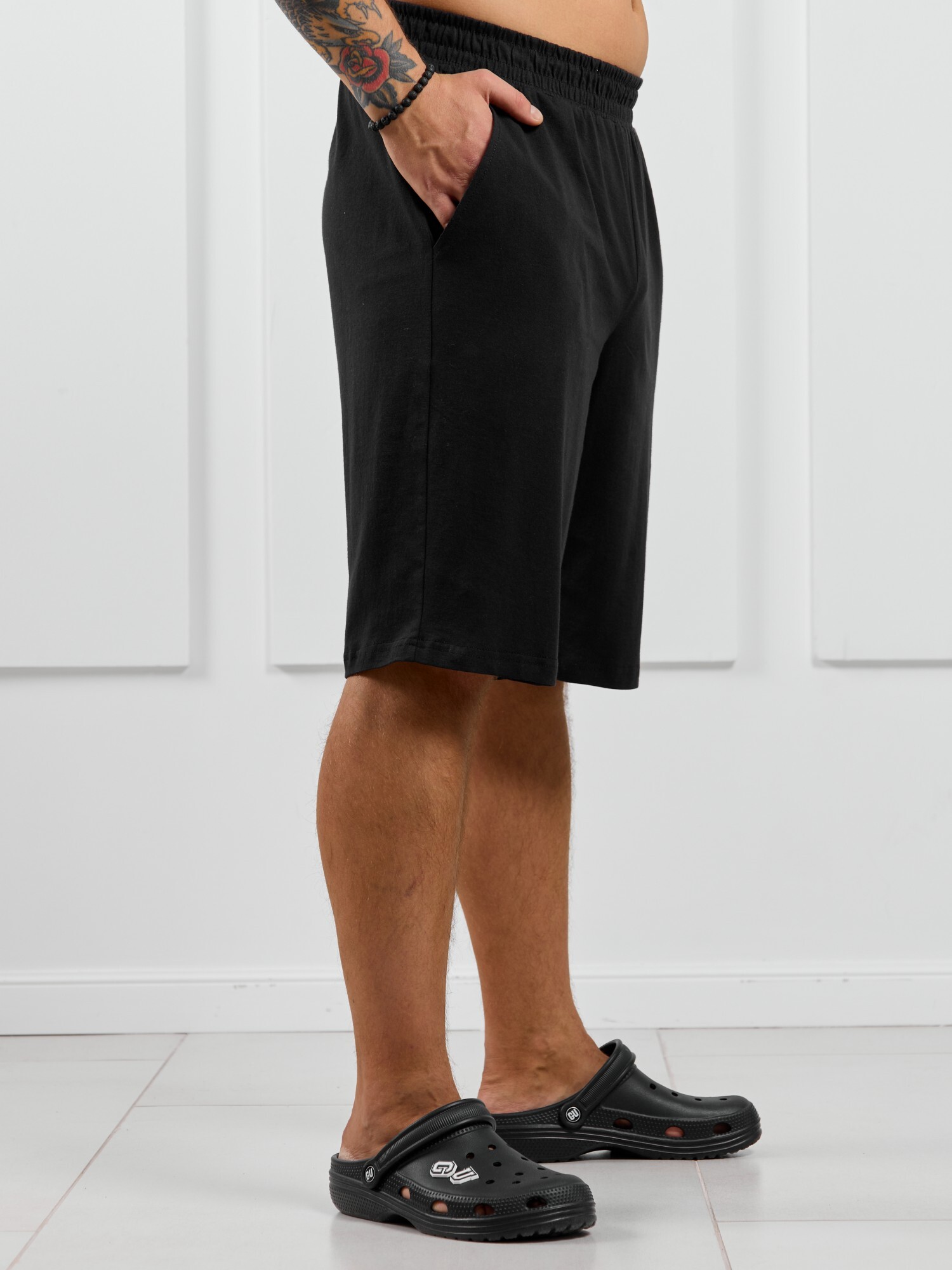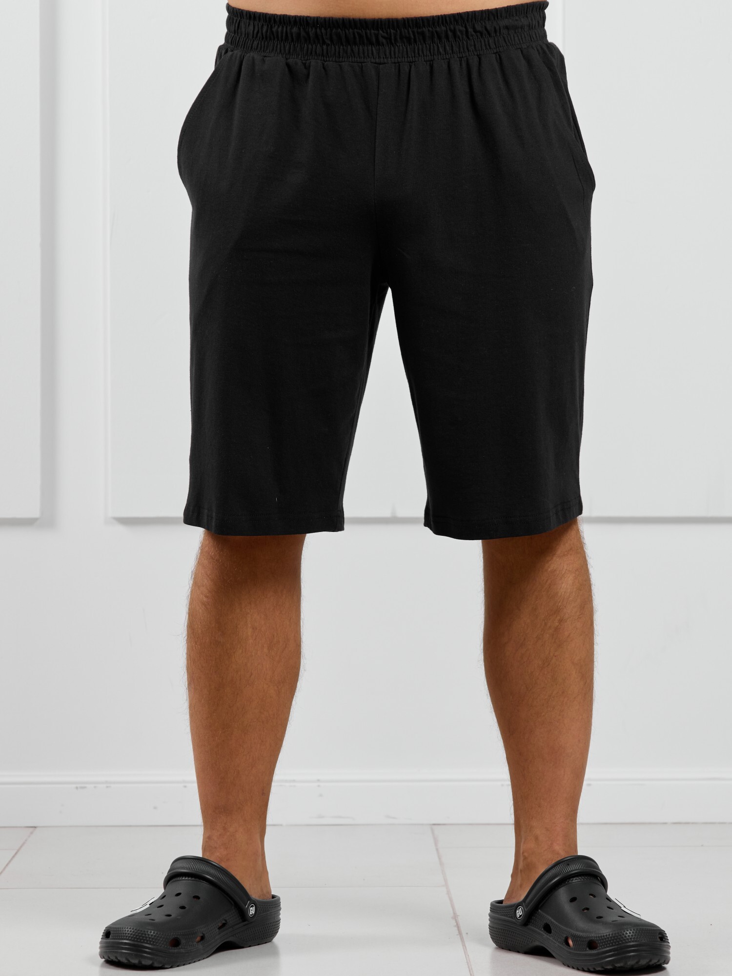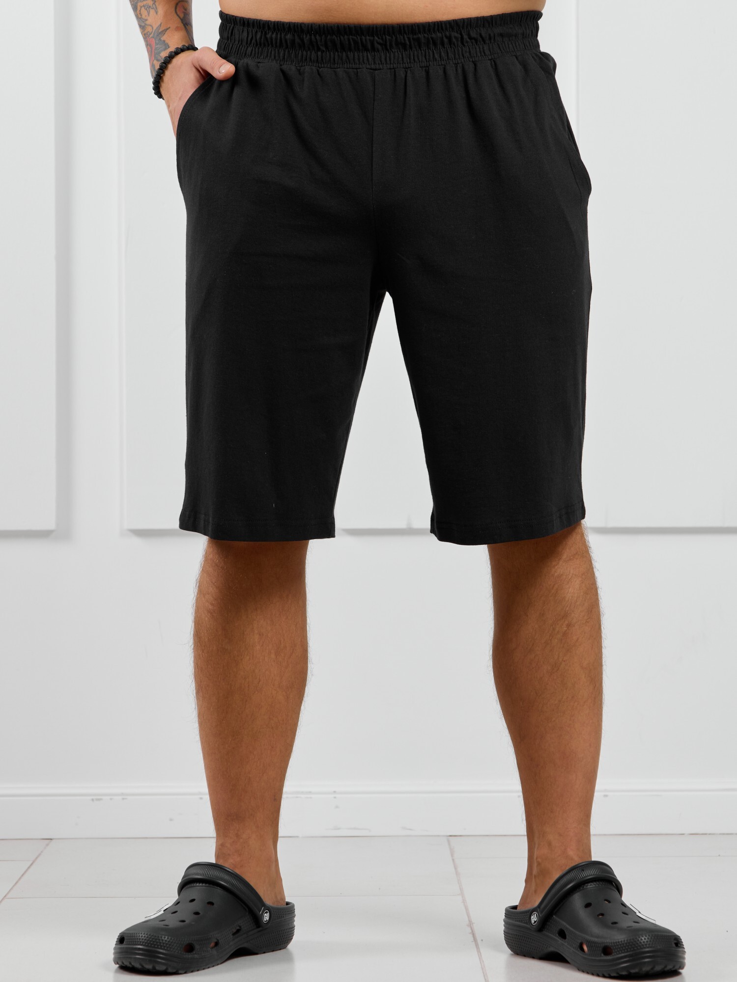 Базовые шорты из однотонного полотна кулирного переплетения черного цвета. Модель с боковыми карманами с обтачными входами, на притачном поясе с отстроченной эластичной тесьмой.
