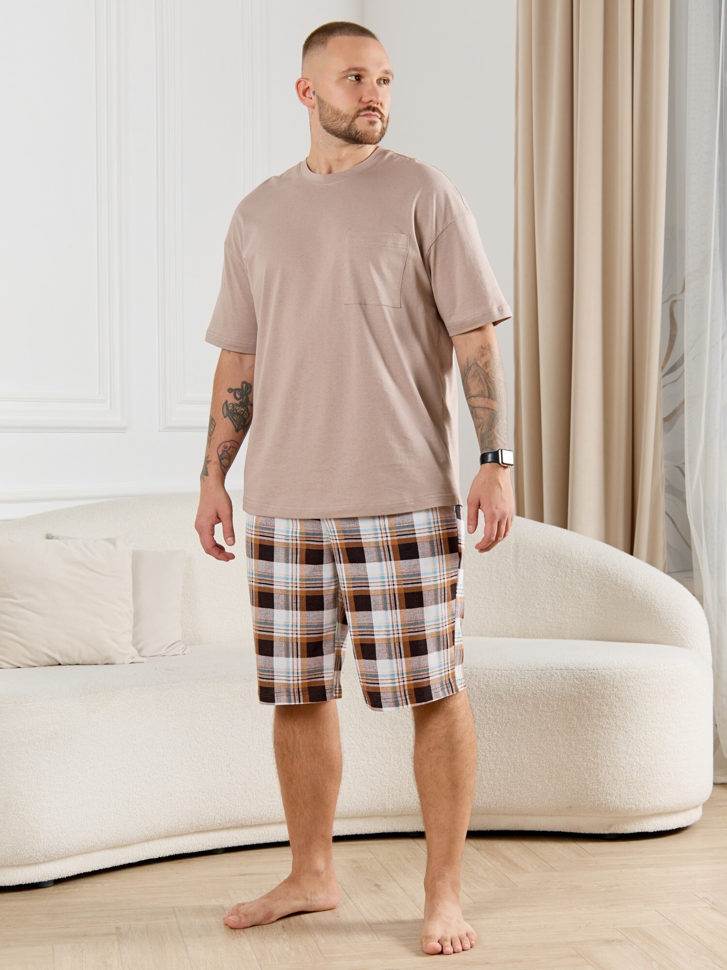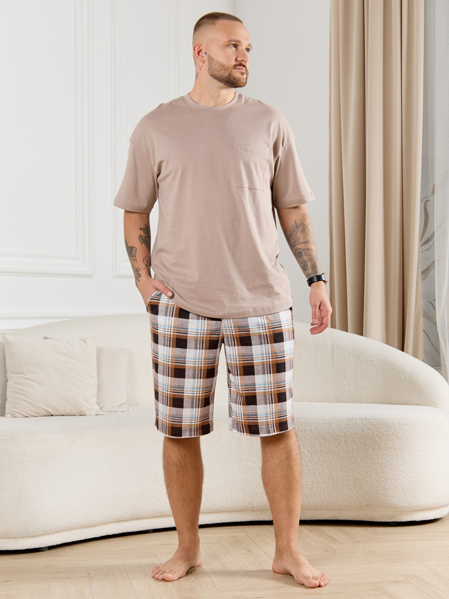 Шорты мужские из трикотажного полотна "кулирка" в клетку, свободного покроя, на притачном поясе с эластичной тесьмой внутри, с карманами в боковых швах. Нижние срезы обработаны подгибкой.