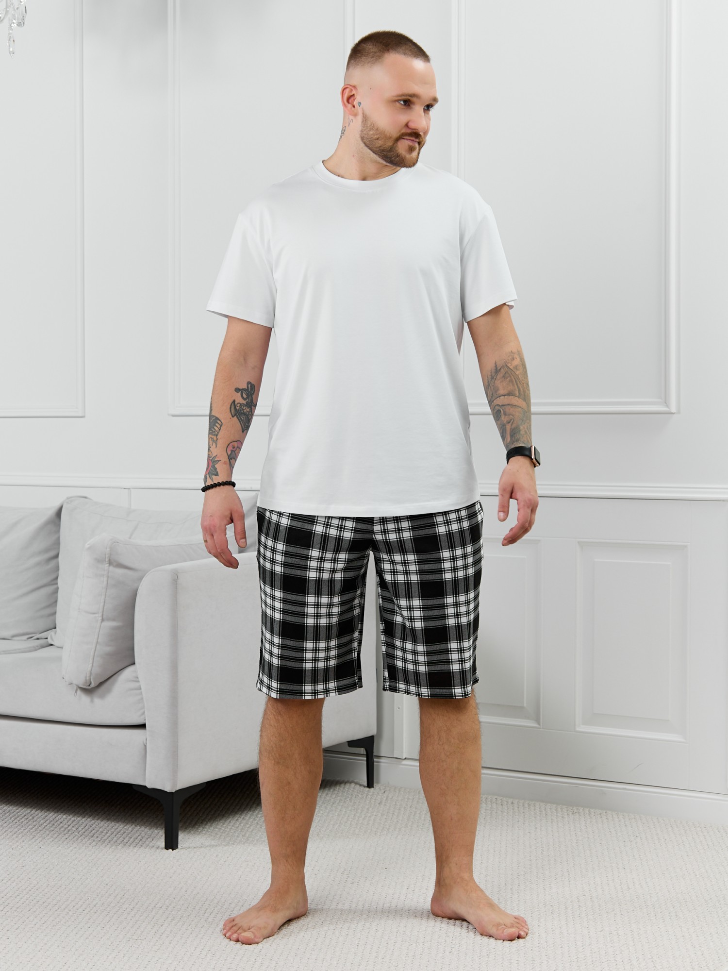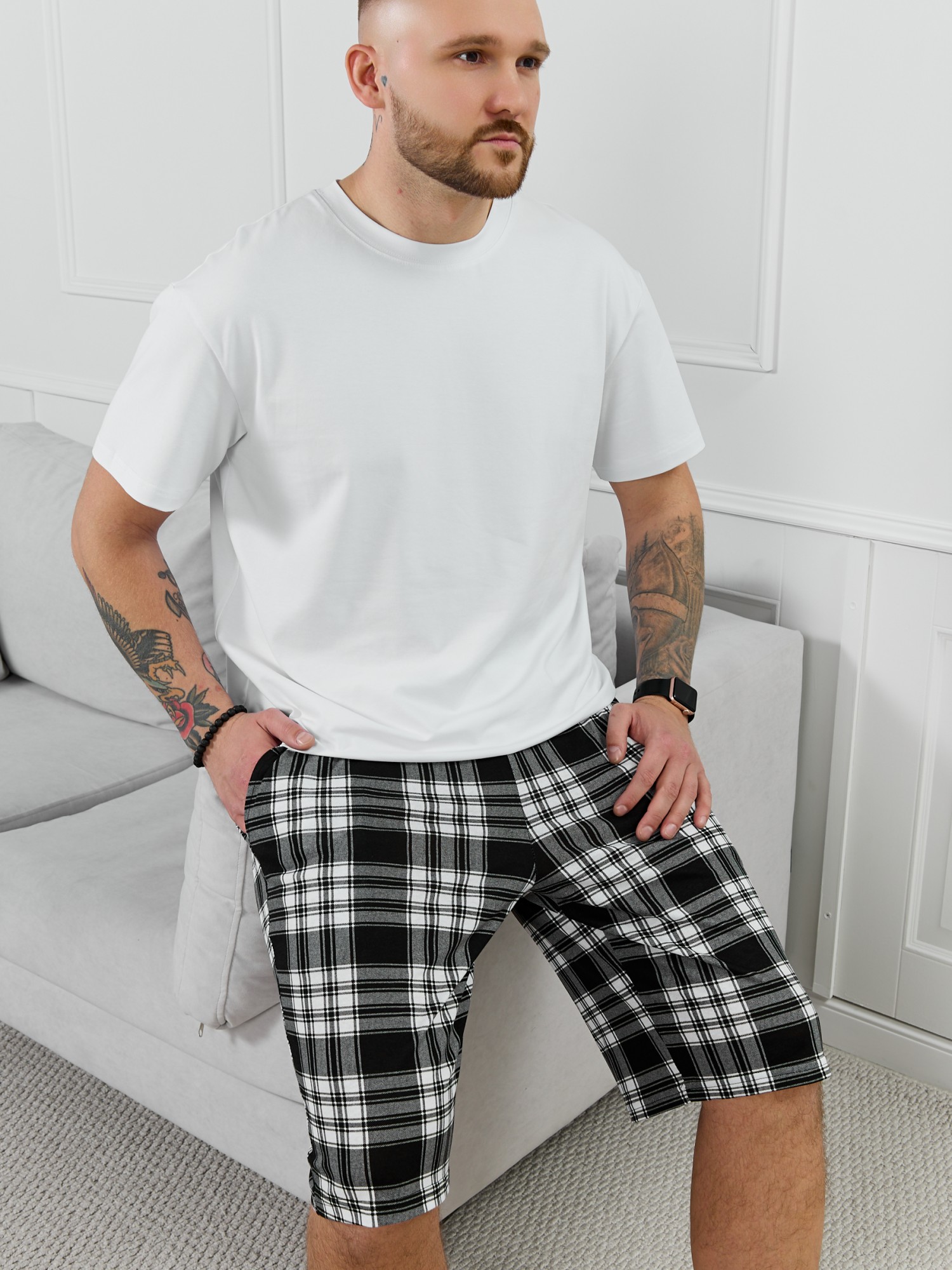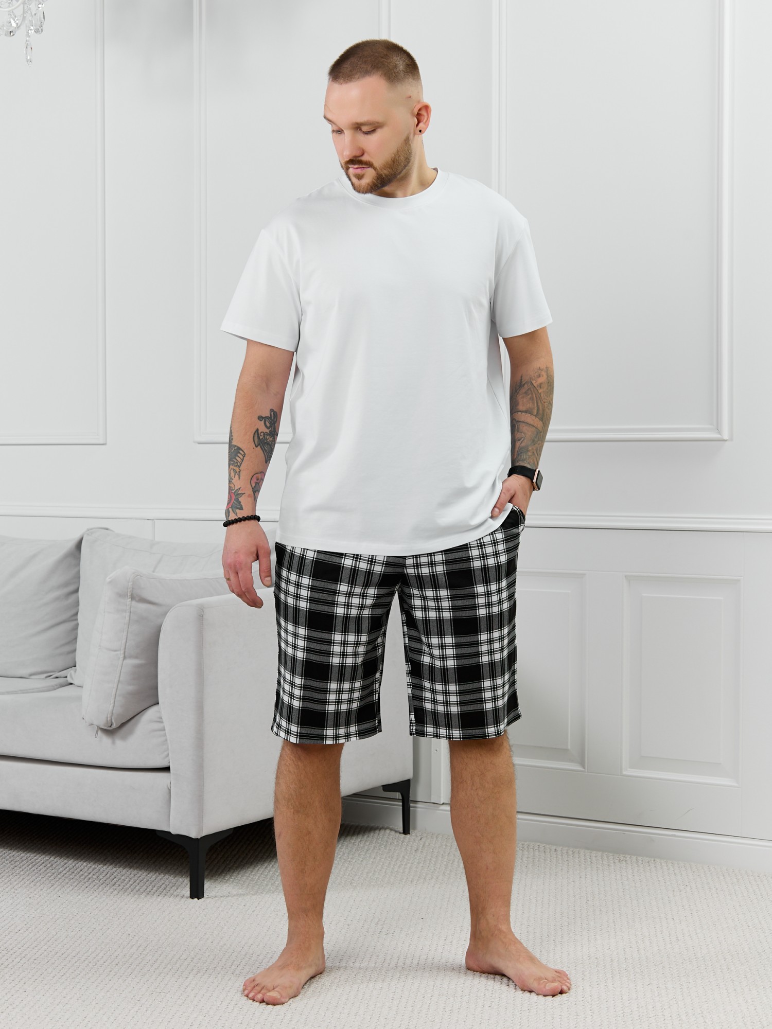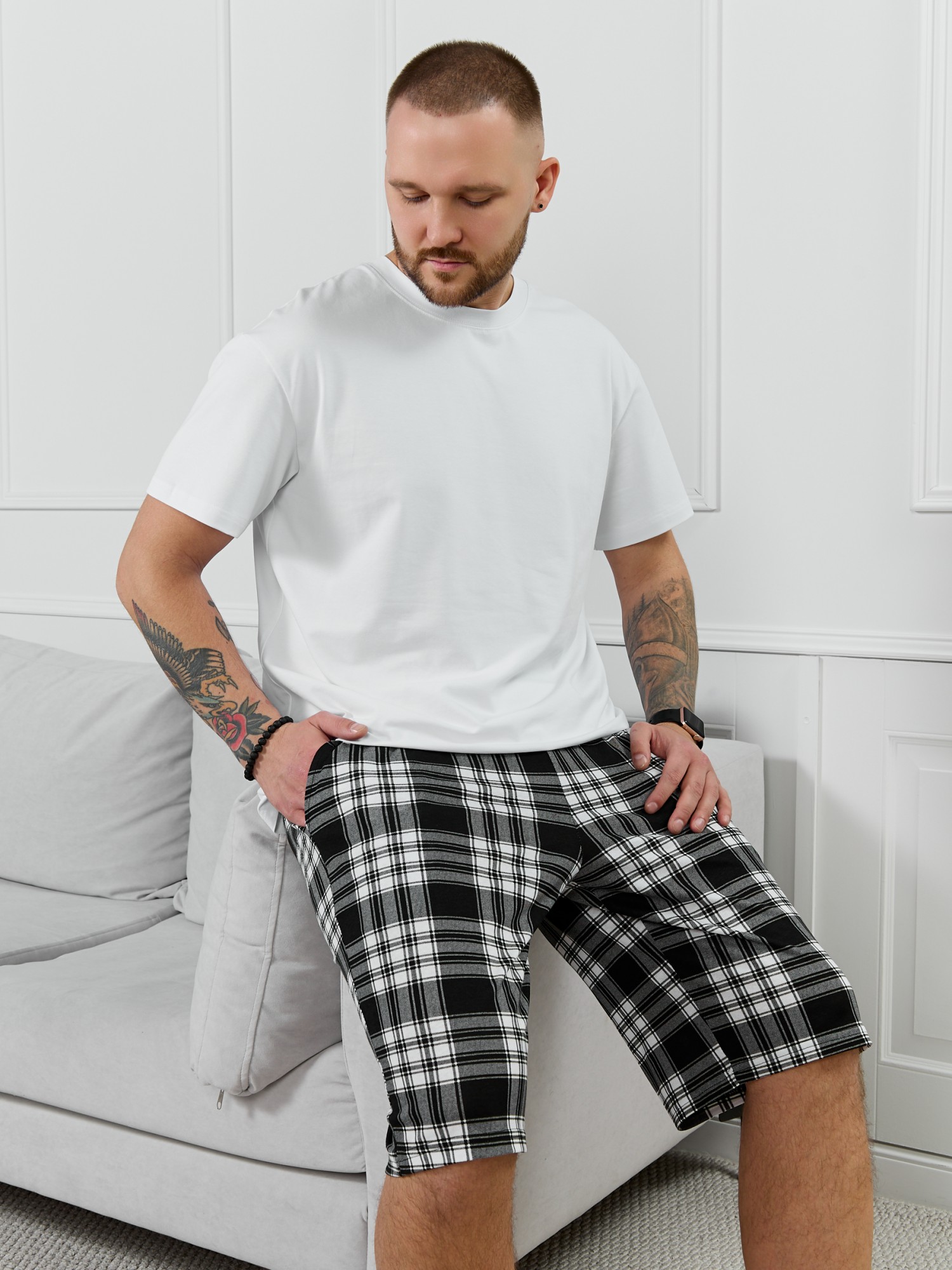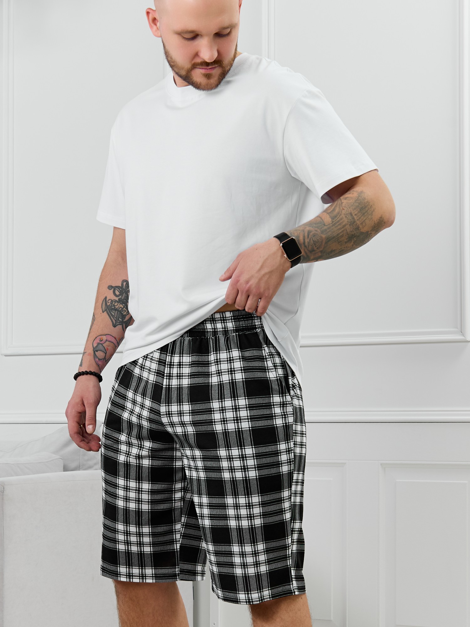 Шорты мужские из трикотажного полотна "кулирка" в клетку, свободного покроя, на притачном поясе с эластичной тесьмой внутри, с карманами в боковых швах. Нижние срезы обработаны подгибкой.