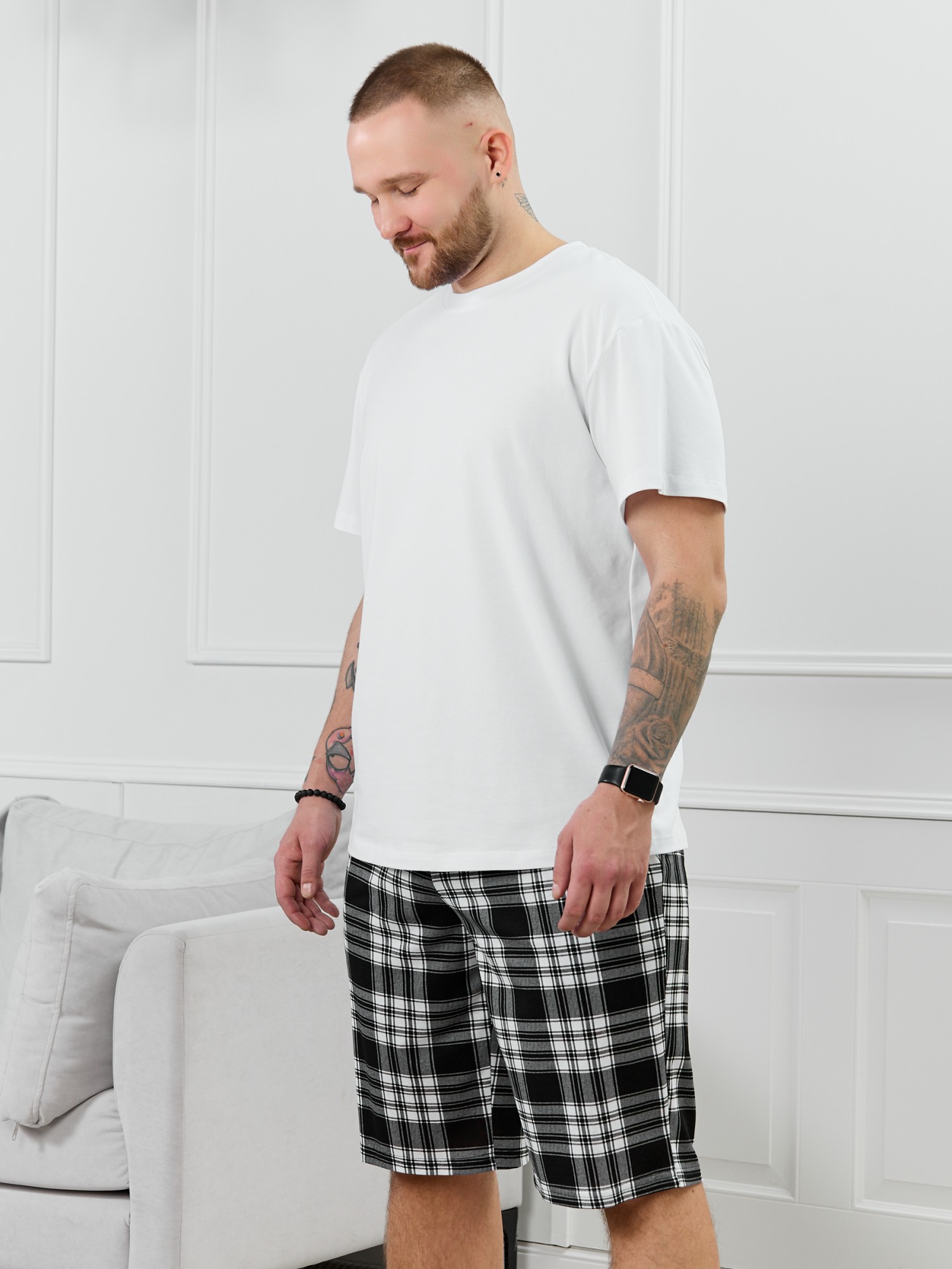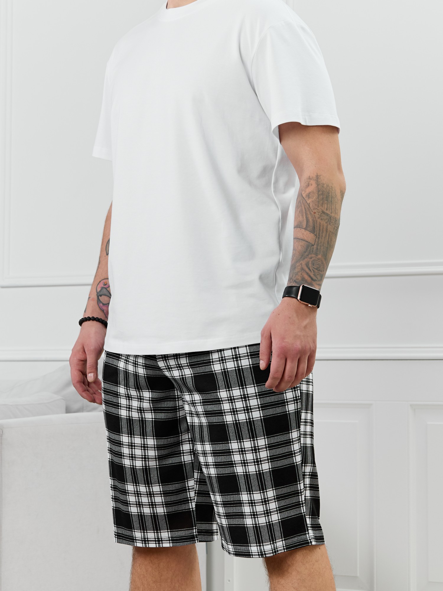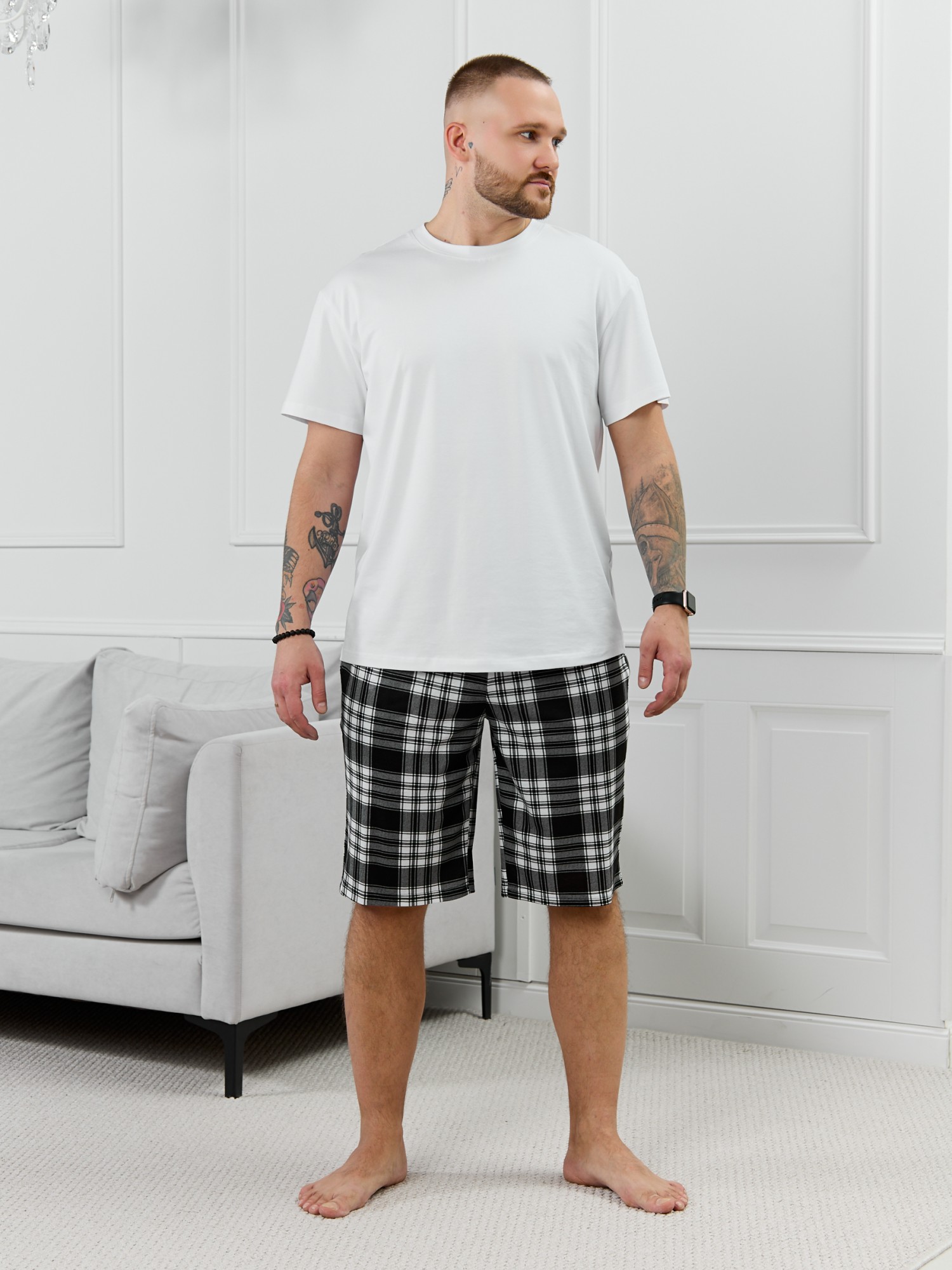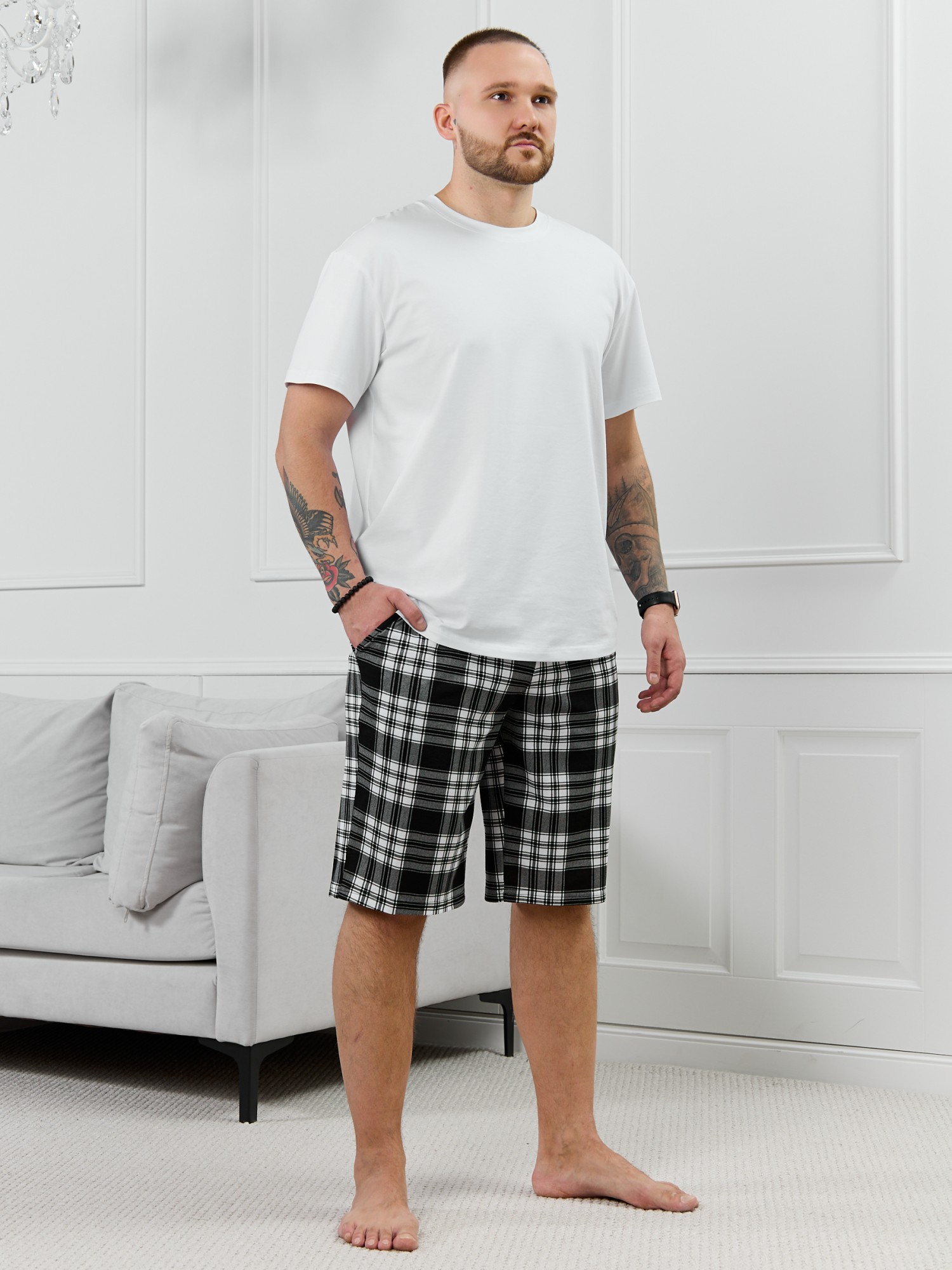 Шорты мужские из трикотажного полотна "кулирка" в клетку, свободного покроя, на притачном поясе с эластичной тесьмой внутри, с карманами в боковых швах. Нижние срезы обработаны подгибкой.