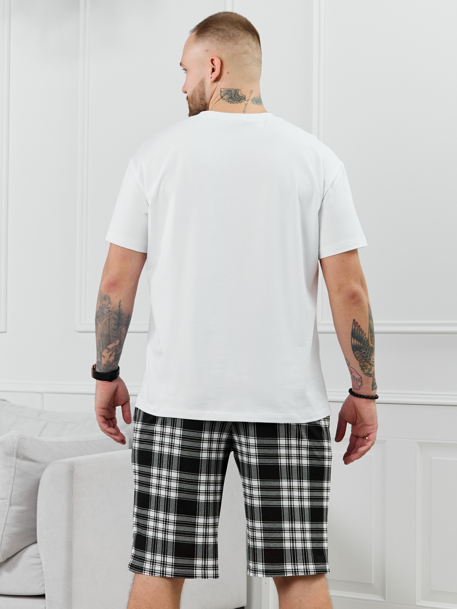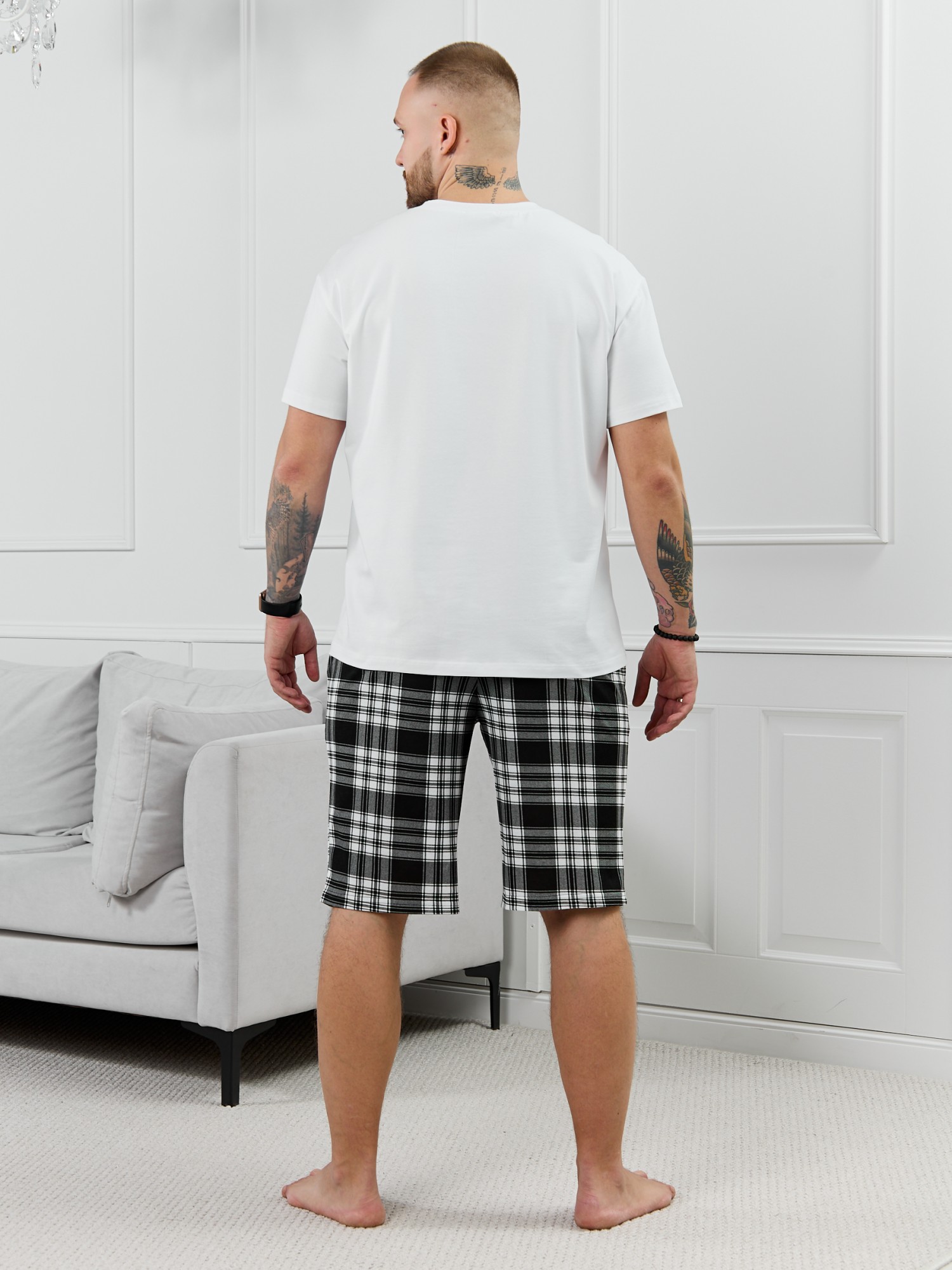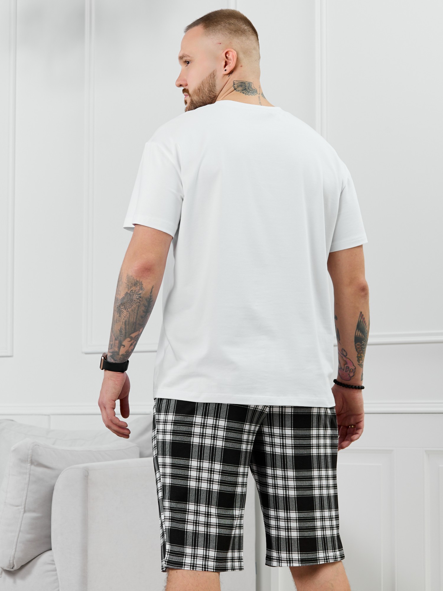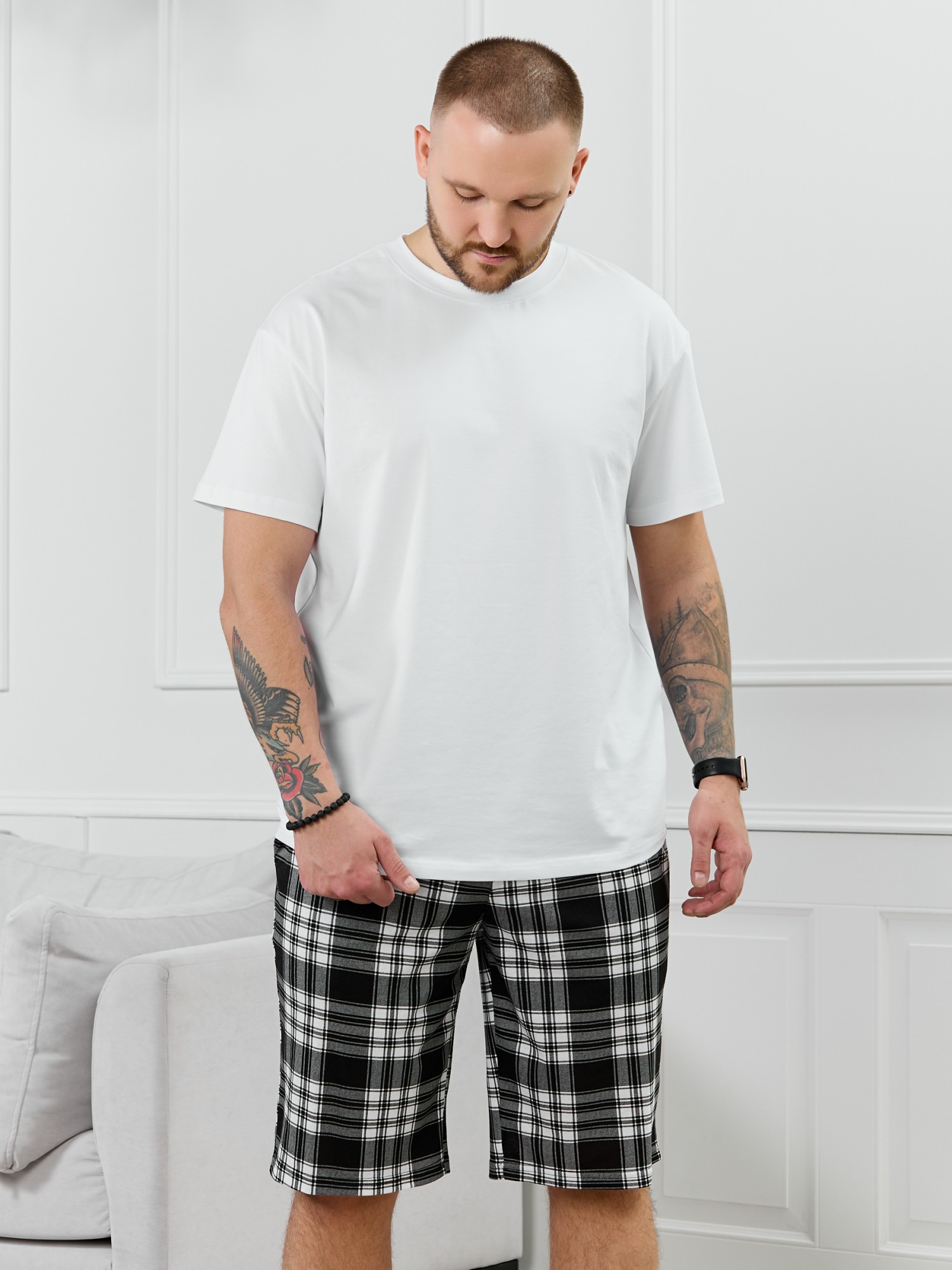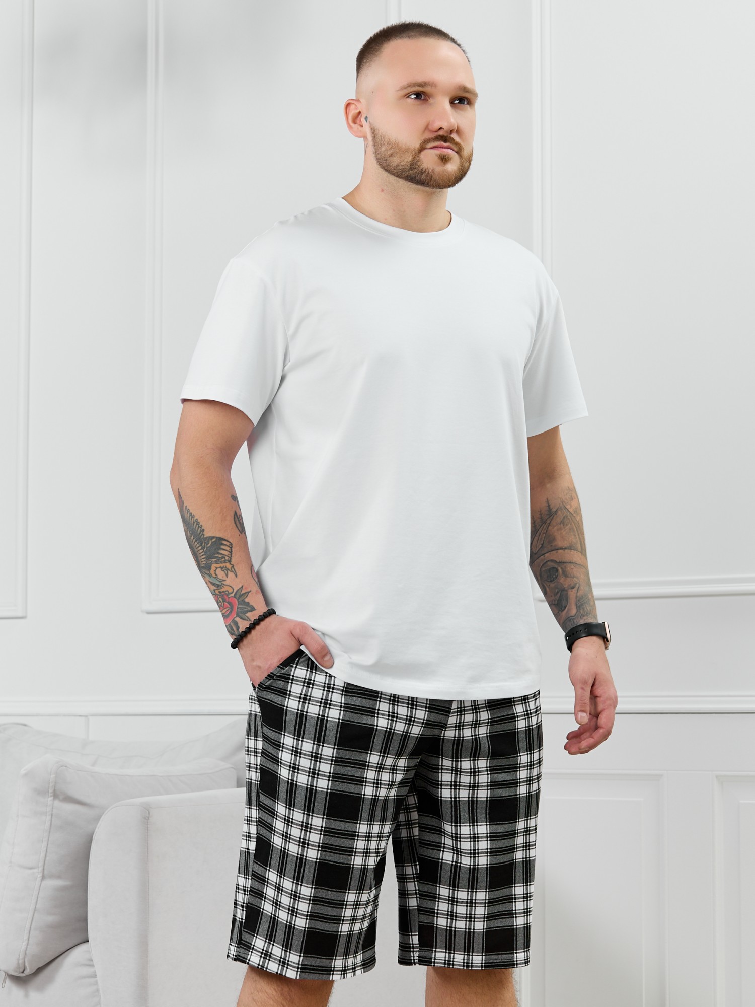 Шорты мужские из трикотажного полотна "кулирка" в клетку, свободного покроя, на притачном поясе с эластичной тесьмой внутри, с карманами в боковых швах. Нижние срезы обработаны подгибкой.