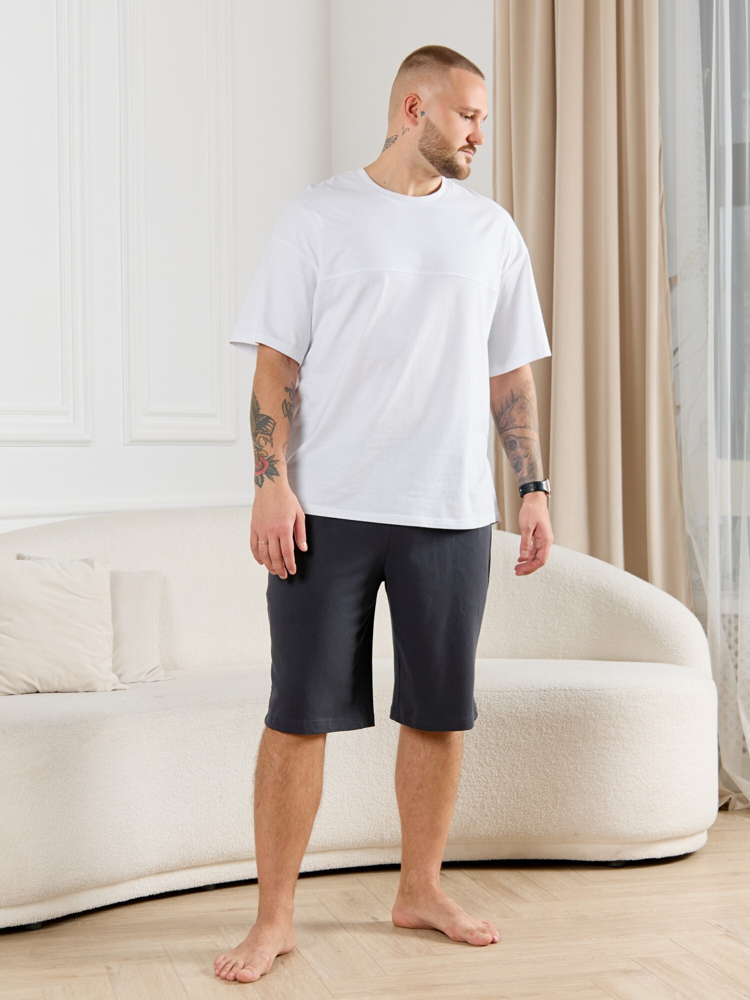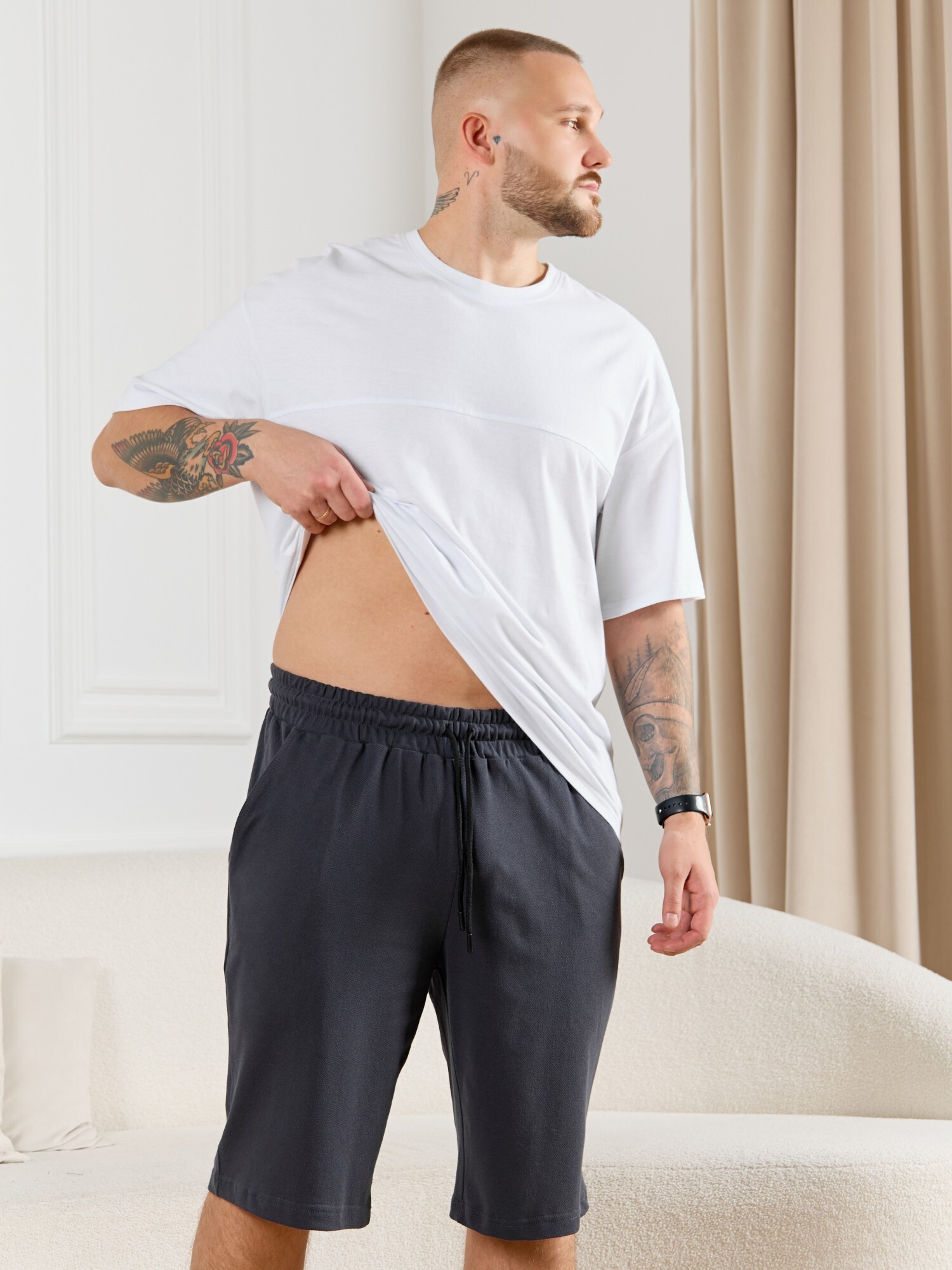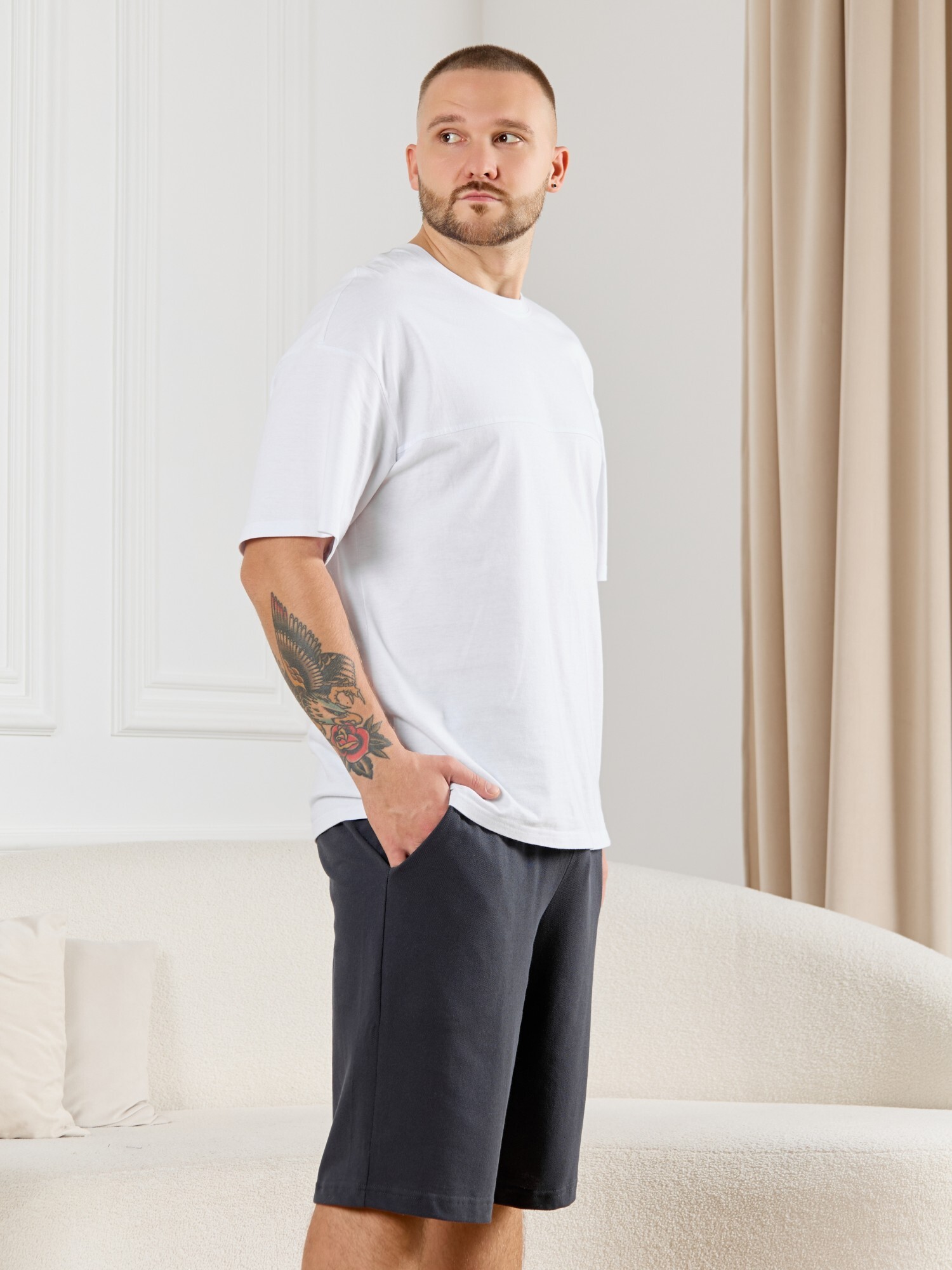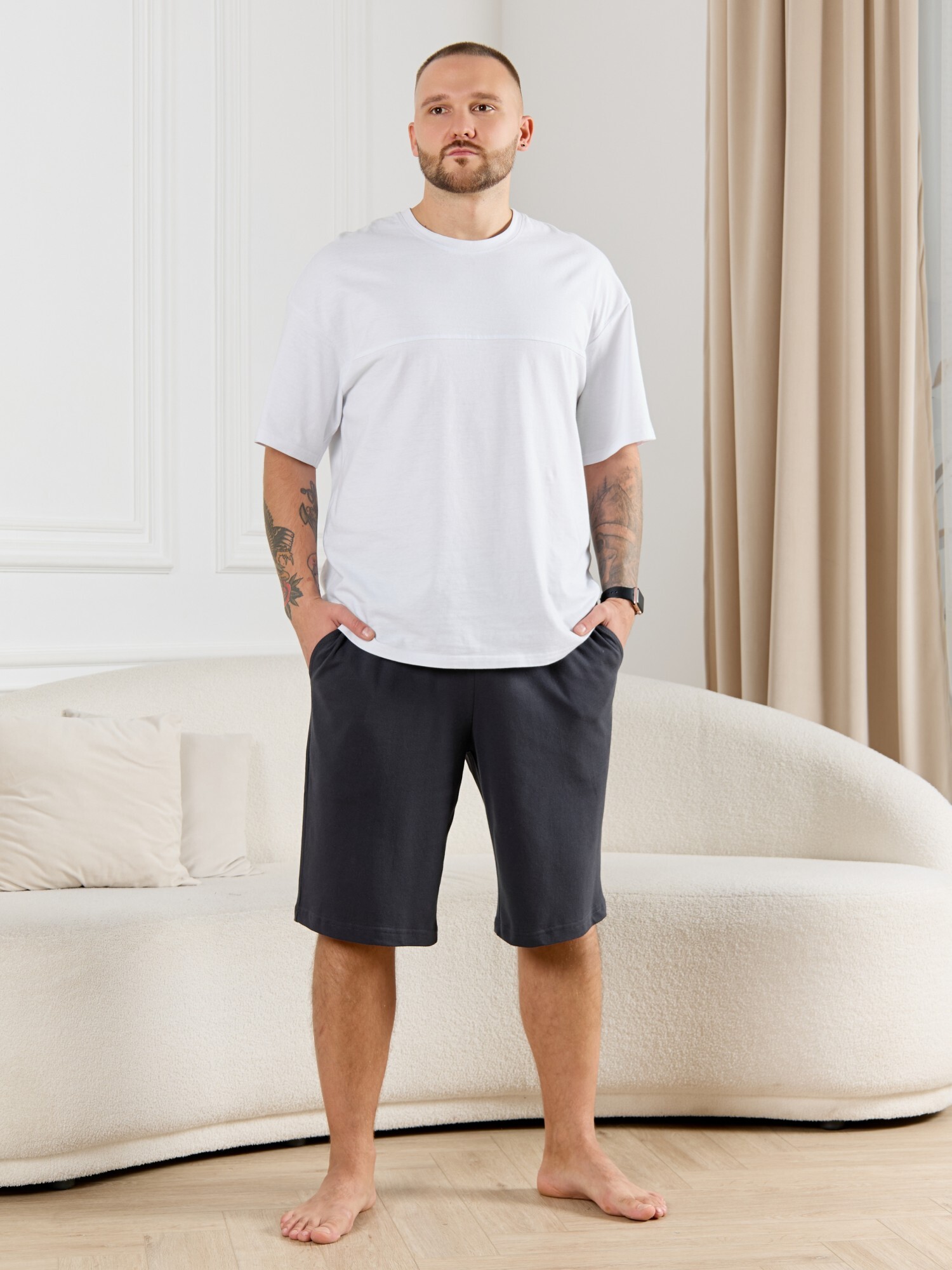 Шорты мужские из гладкокрашеного трикотажного полотна "пике", свободного покроя, на притачном поясе с эластичной тесьмой внутри, с карманами в боковых швах. Нижние срезы обработаны подгибкой.