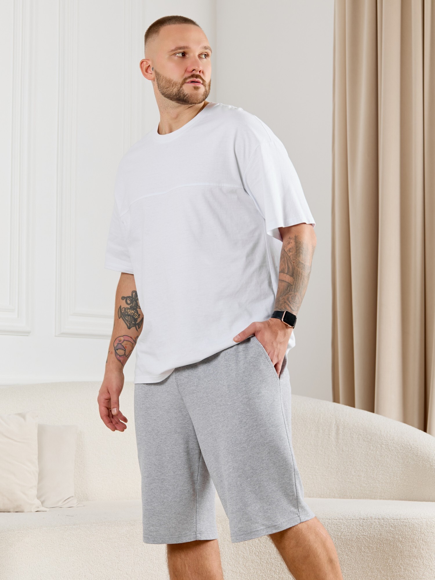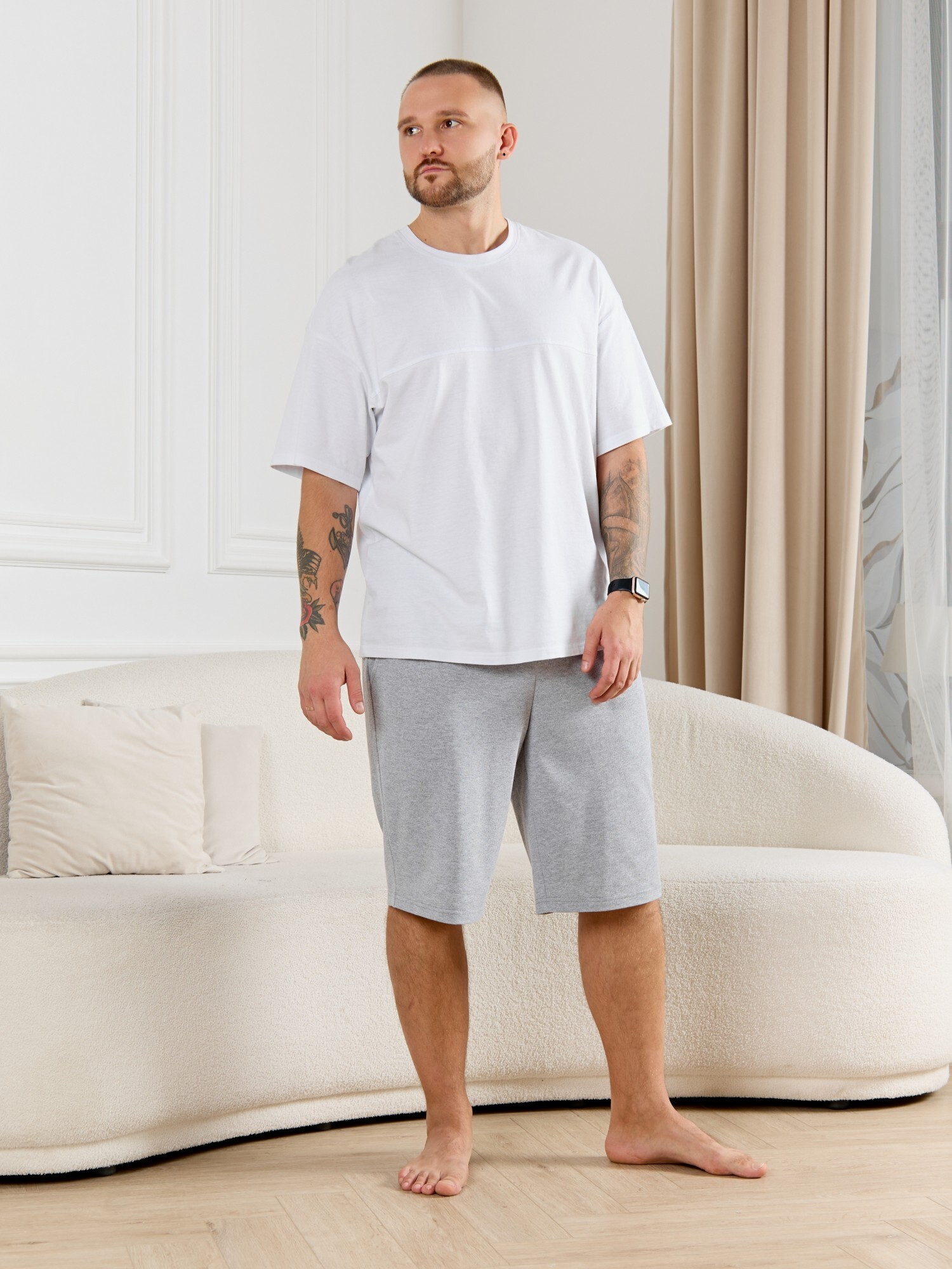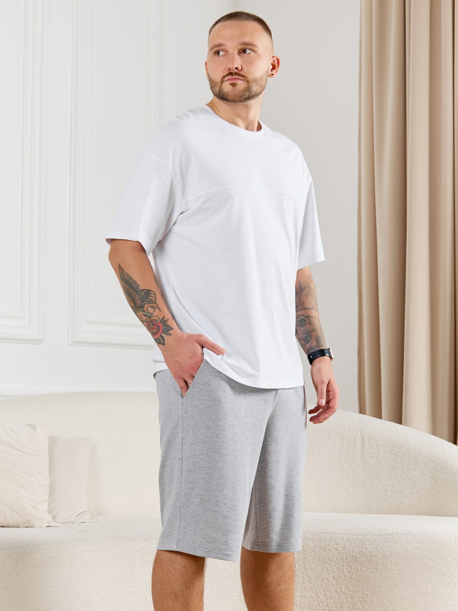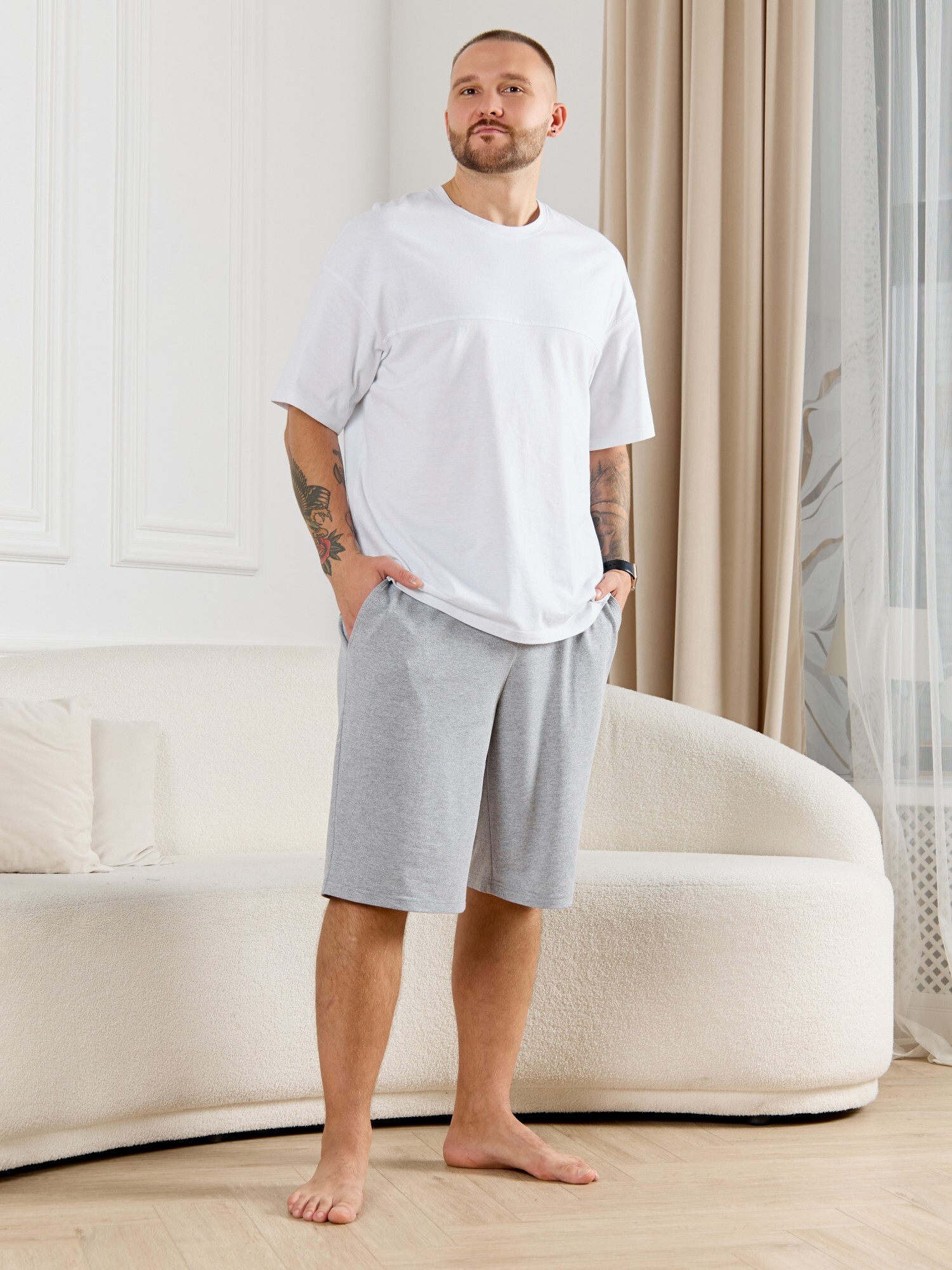 Шорты мужские из гладкокрашеного трикотажного полотна "пике", свободного покроя, на притачном поясе с эластичной тесьмой внутри, с карманами в боковых швах. Нижние срезы обработаны подгибкой.