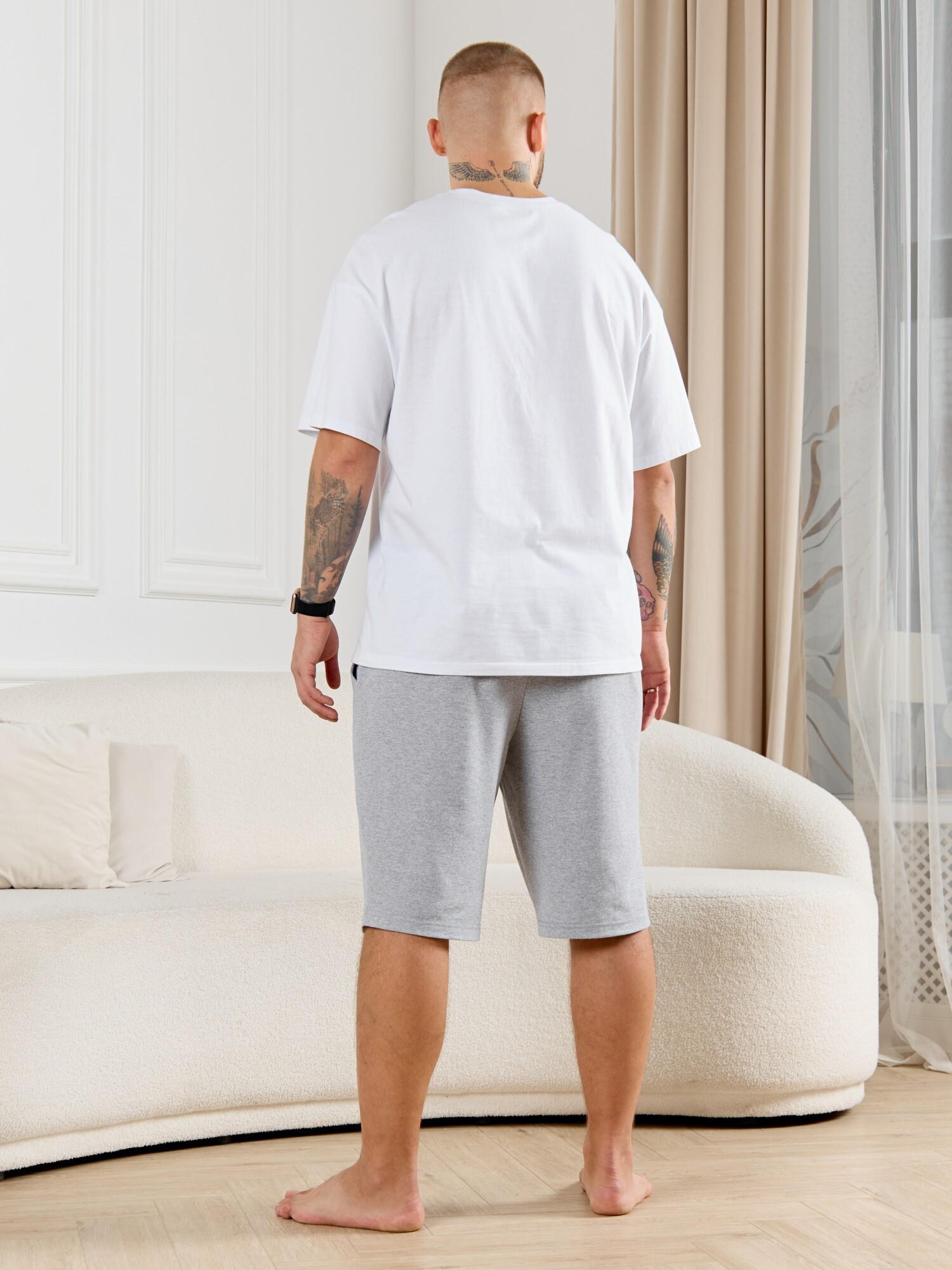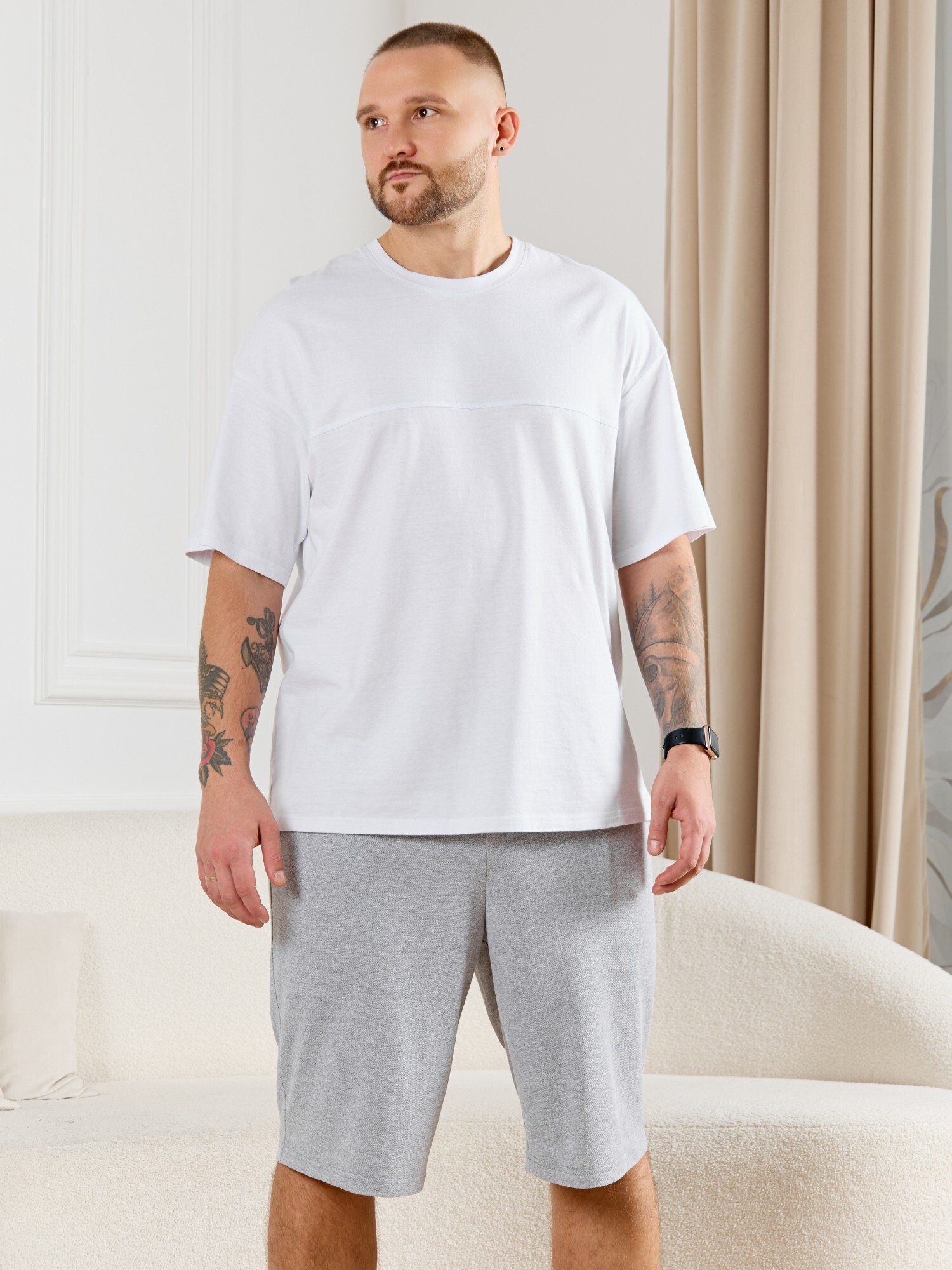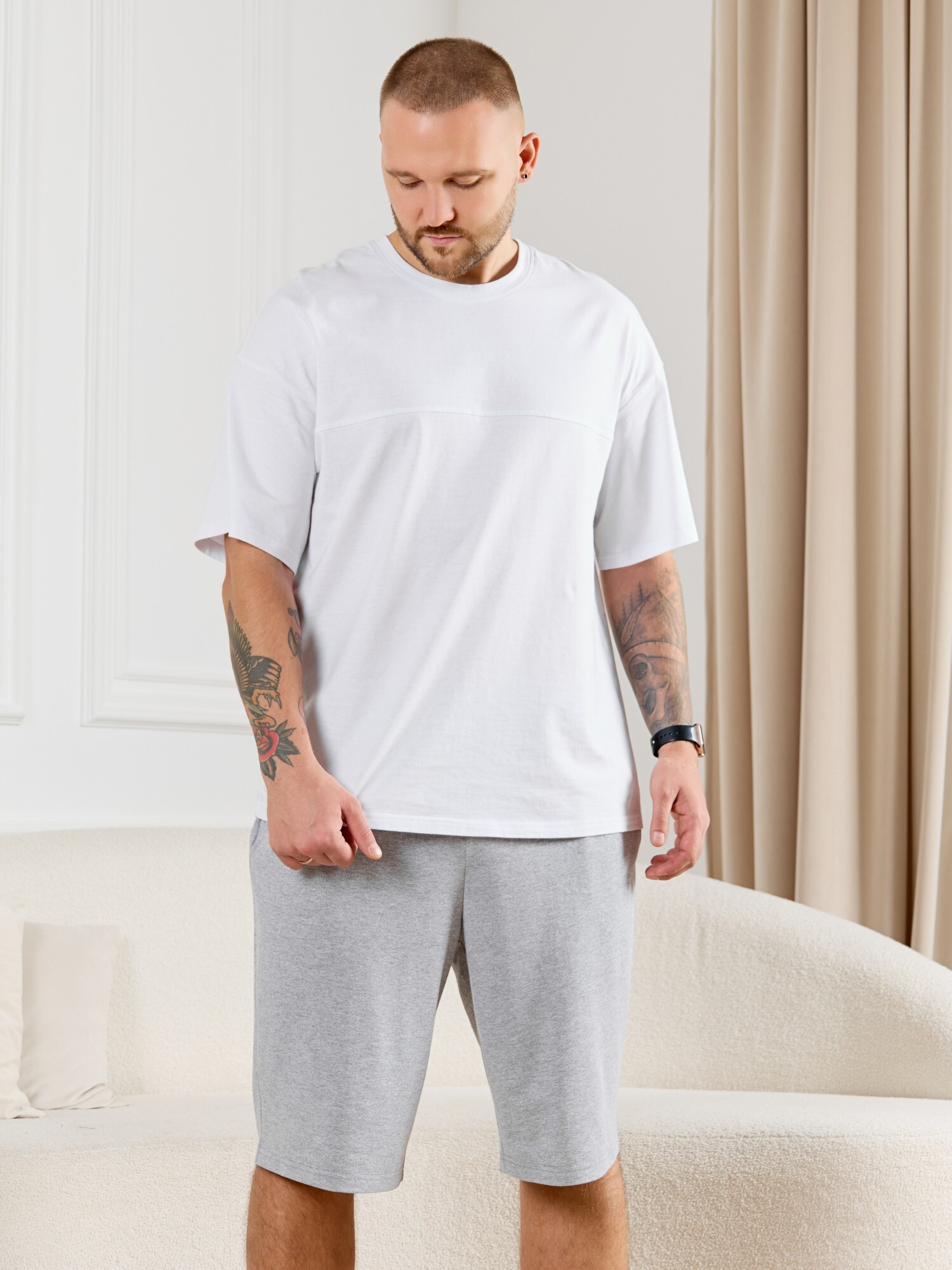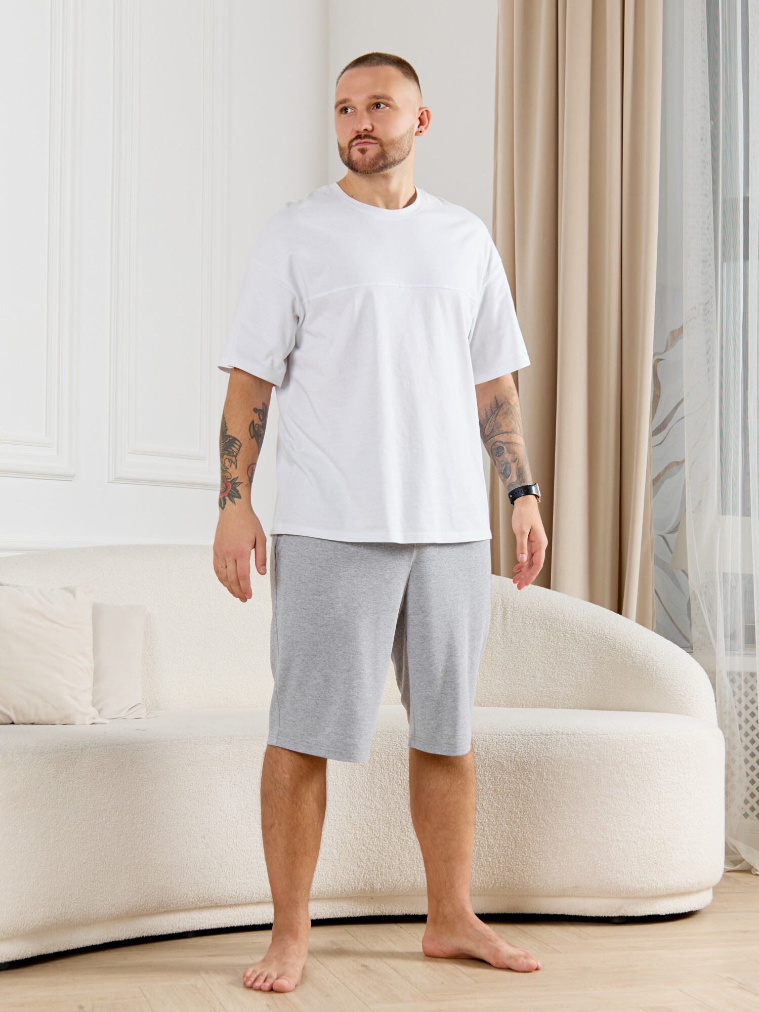 Шорты мужские из гладкокрашеного трикотажного полотна "пике", свободного покроя, на притачном поясе с эластичной тесьмой внутри, с карманами в боковых швах. Нижние срезы обработаны подгибкой.