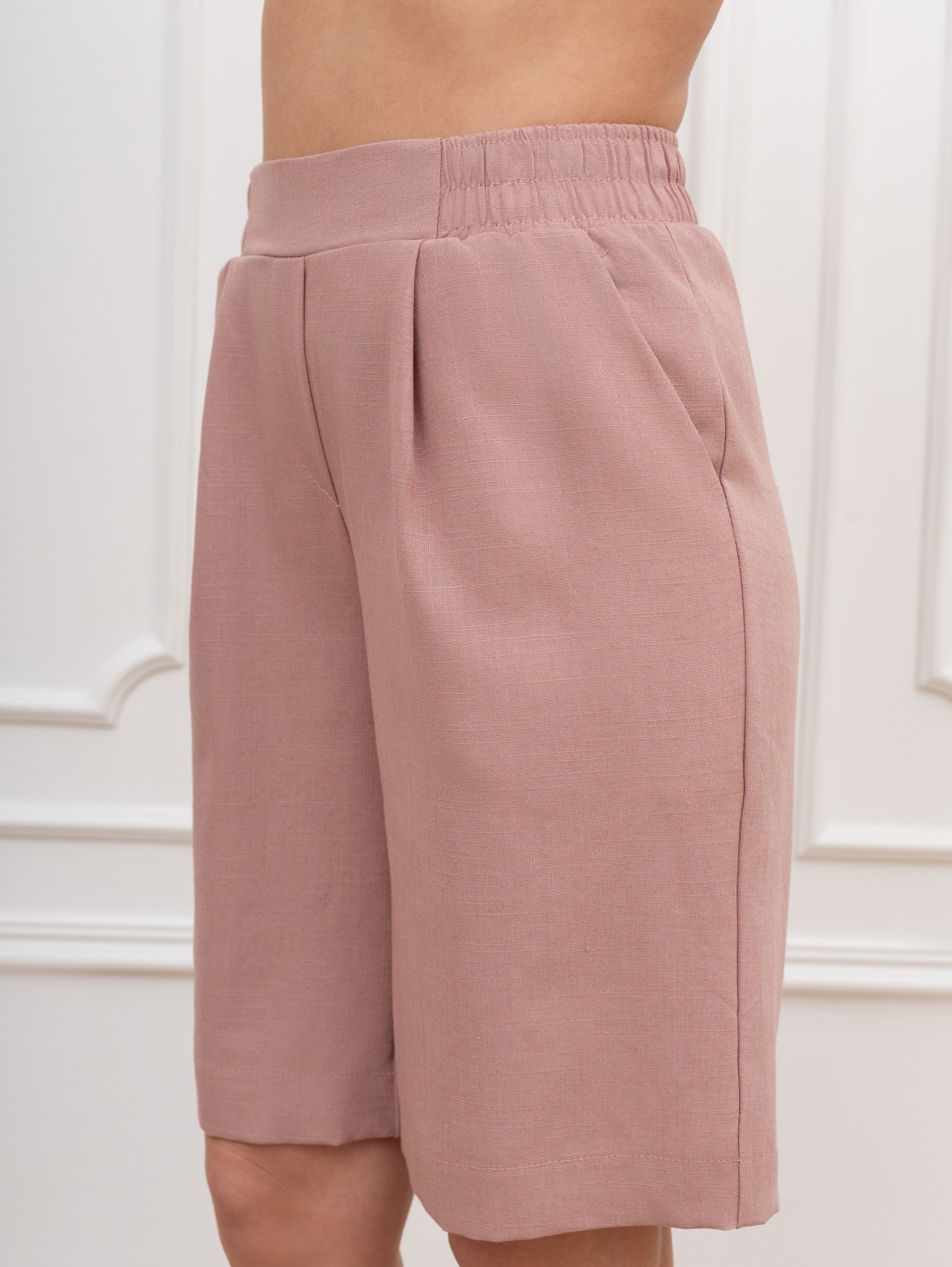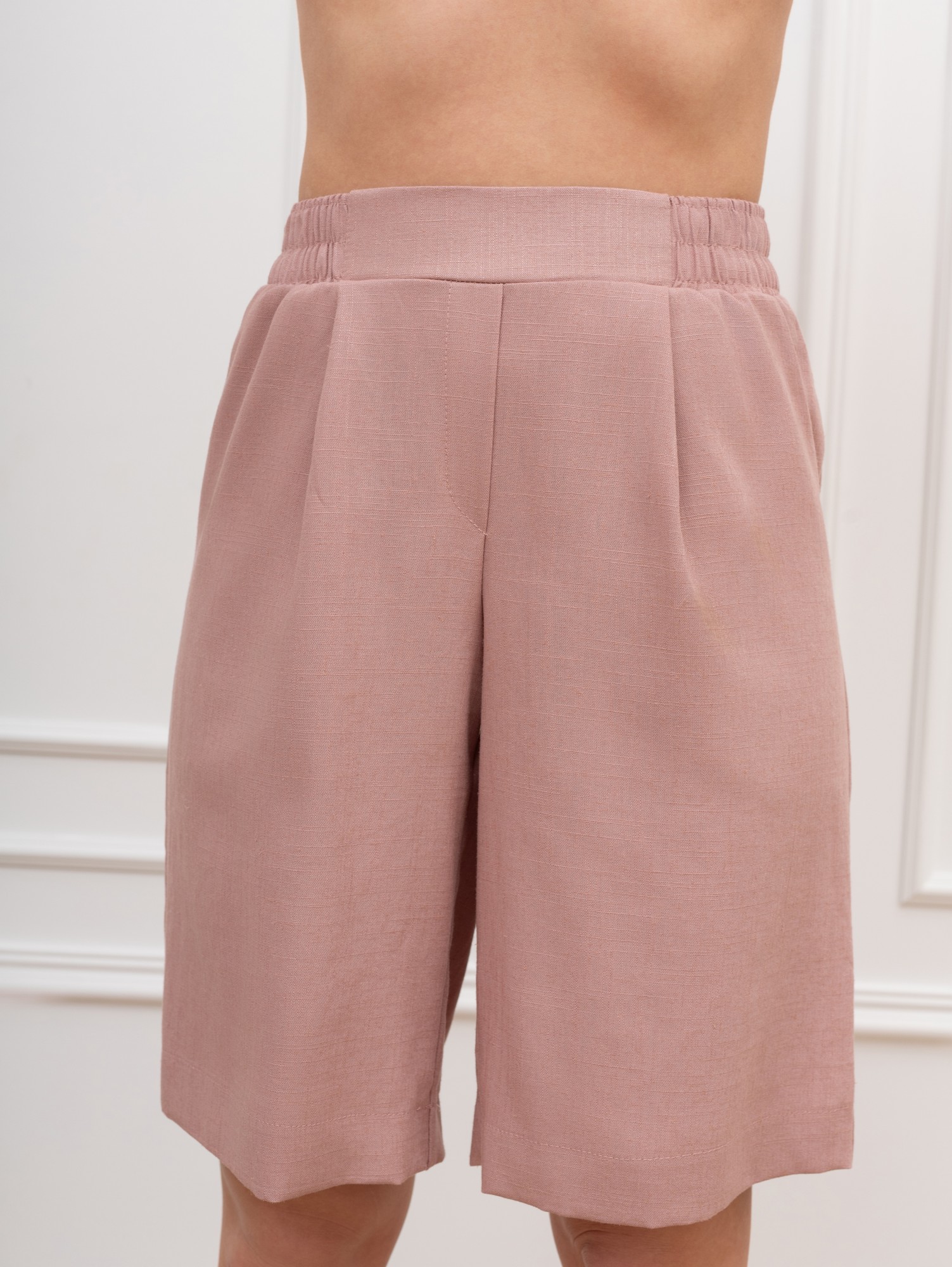Шорты – женские из гладкокрашеного тканого полотна, свободные, длиной выше колена, с карманами в боковых швах и двумя заложенными складками по талии, на притачном поясе с эластичной тесьмой внутри. Средний шов передних половин обработан имитацией «гульфика».
