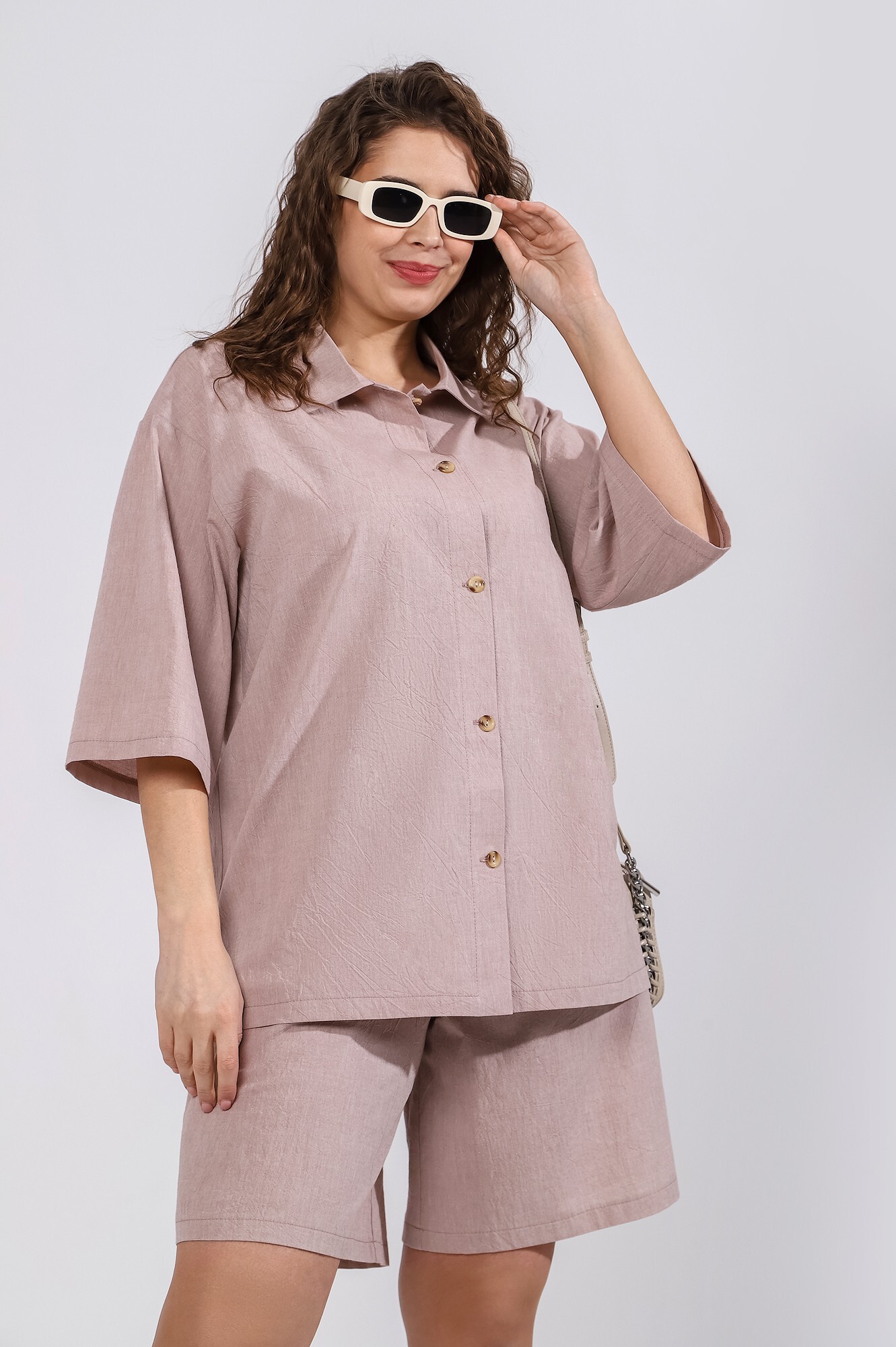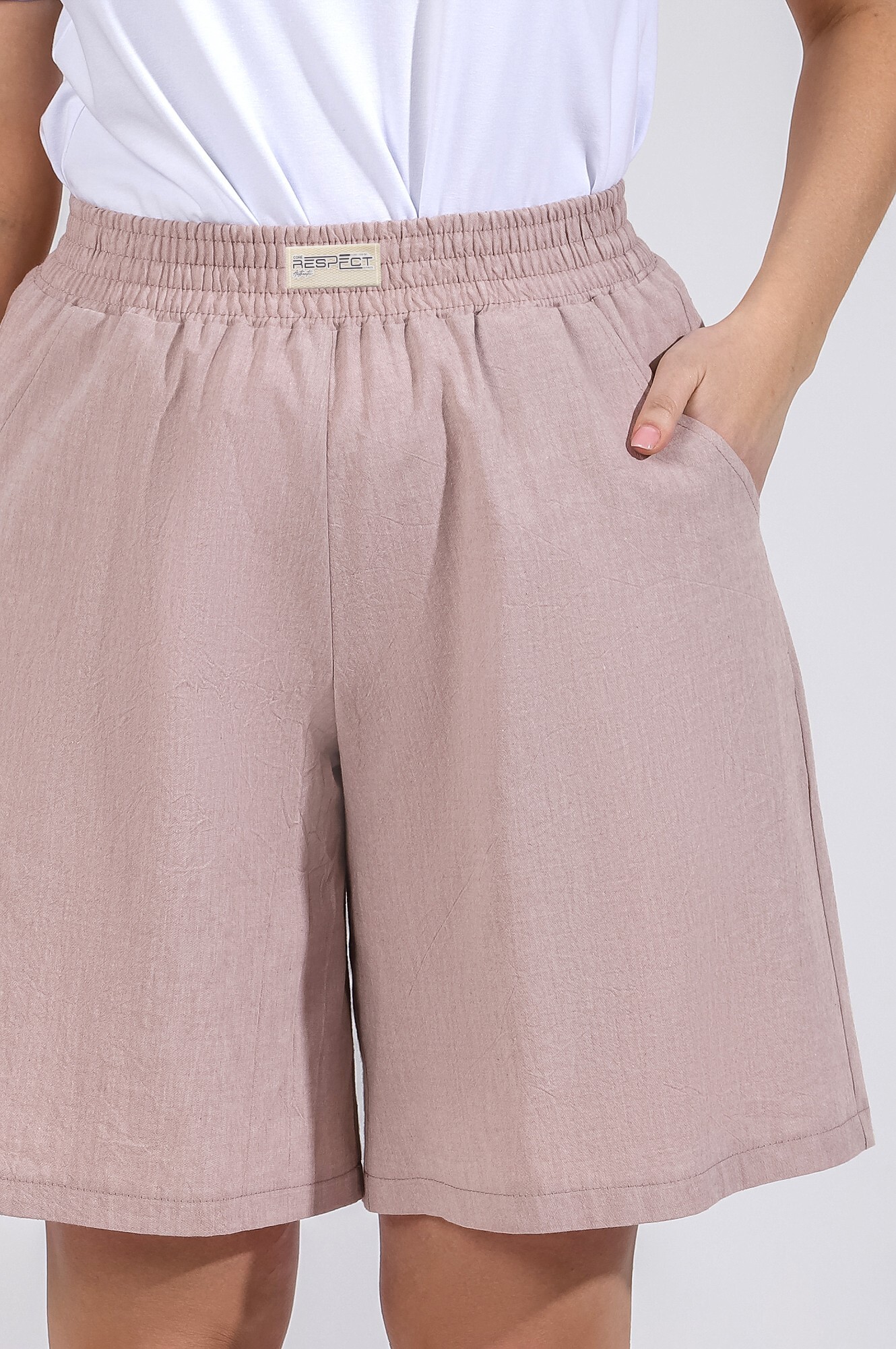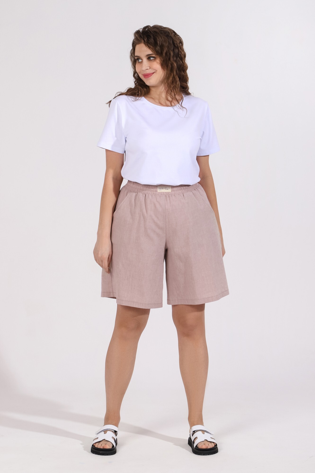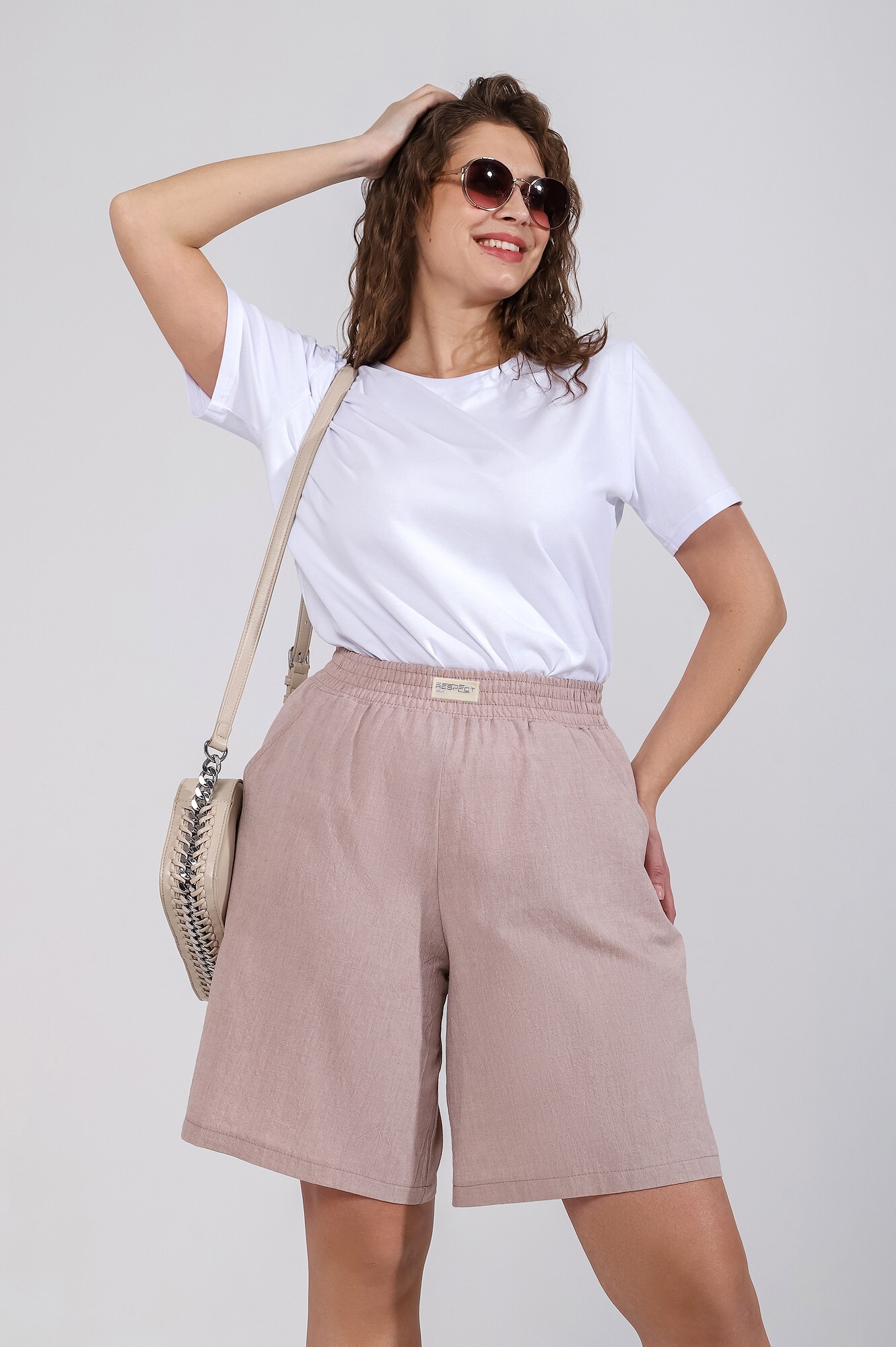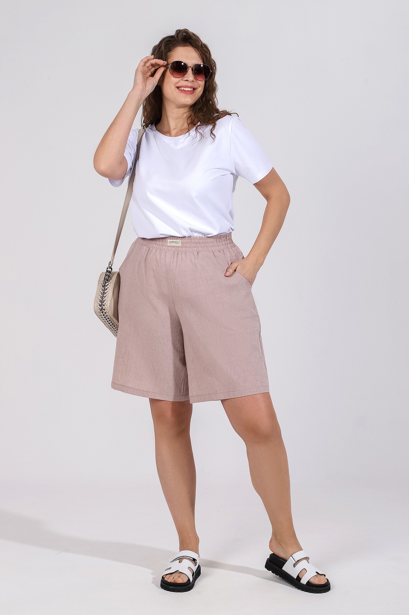 Шорты женские из гладкокрашеного тканого полотна «вареный хлопок», удлиненные, на притачном поясе с эластичной тесьмой внутри, карманами в боковых швах. По центру пояса настрочен декоративный элемент.
