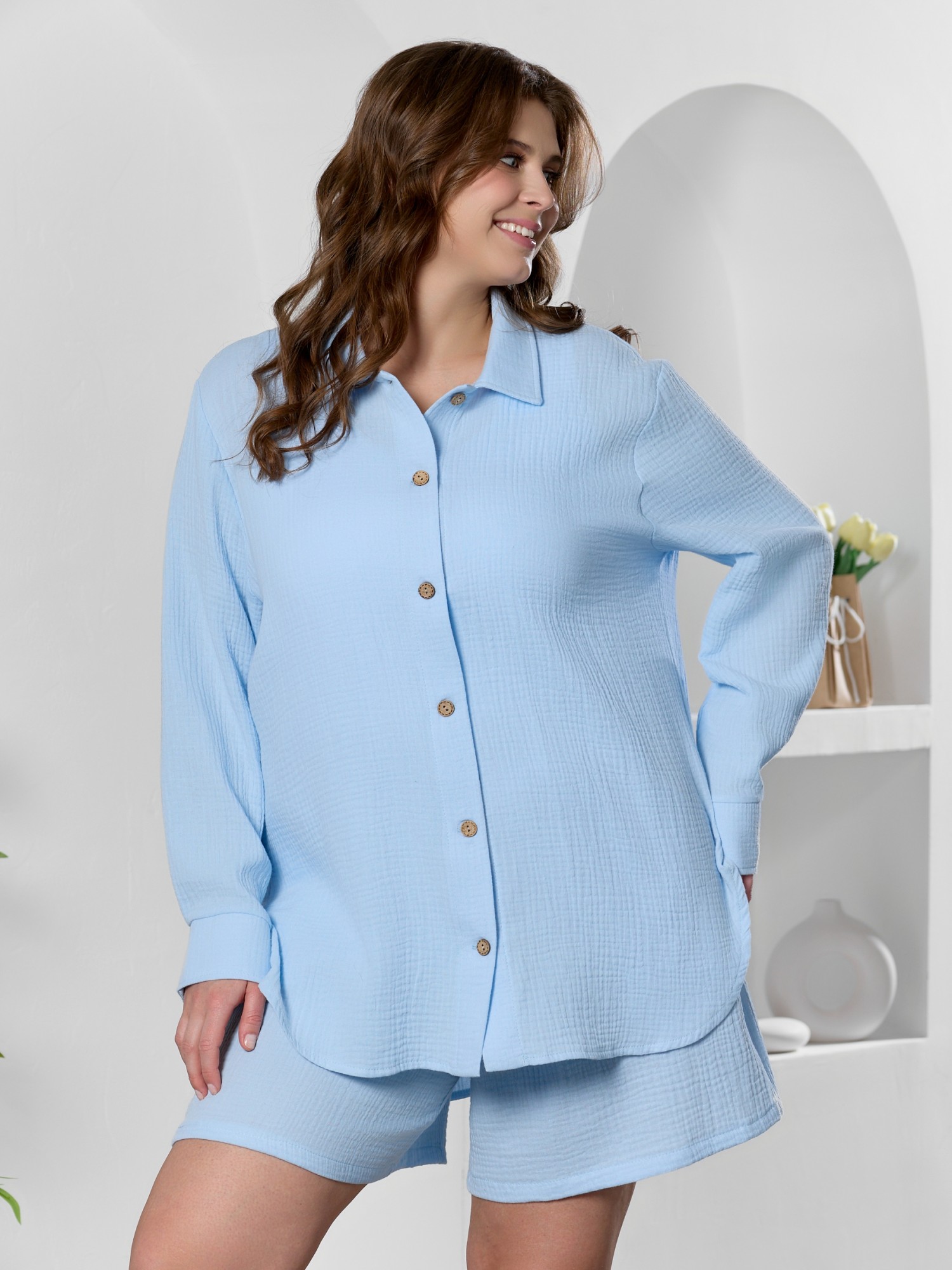 Шорты женские из тканого гладкокрашеного полотна «муслин», свободные, средней длины, с карманами в боковых швах, на притачном поясе с эластичной тесьмой внутри.