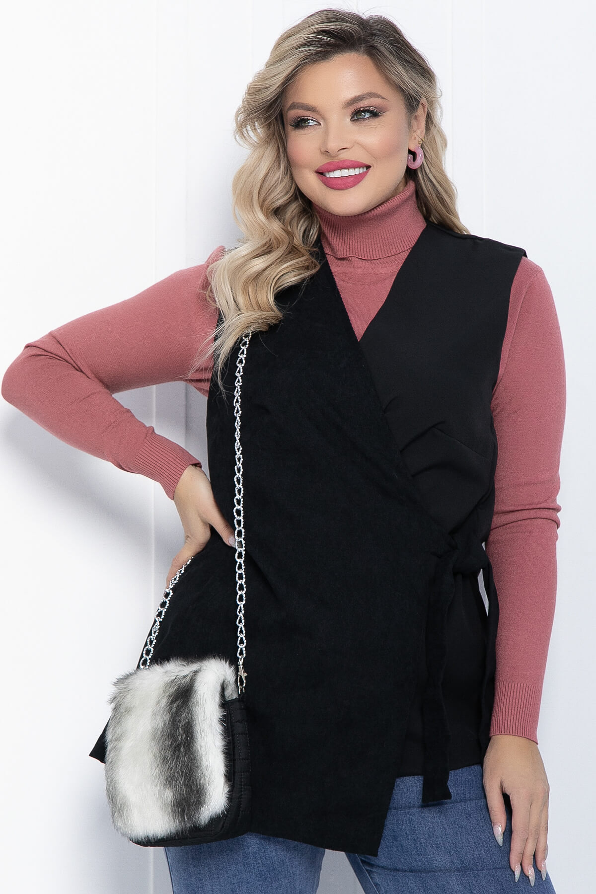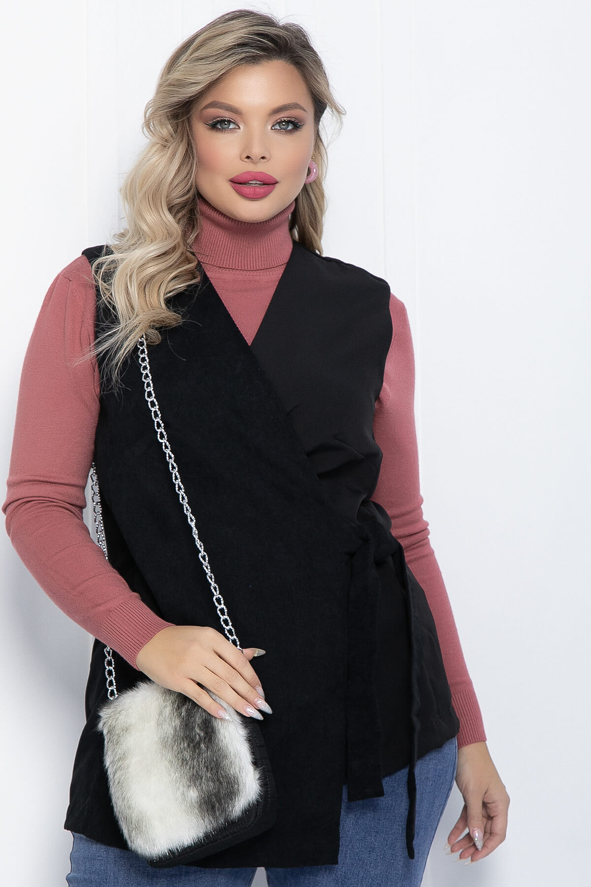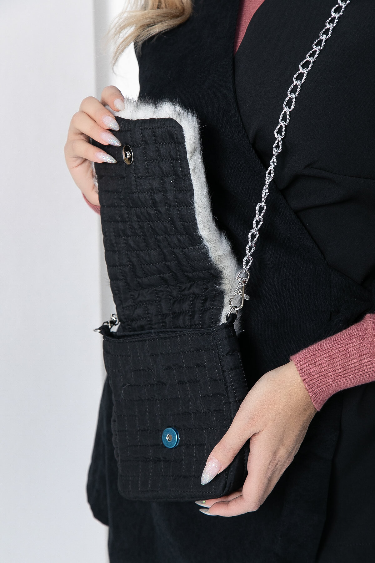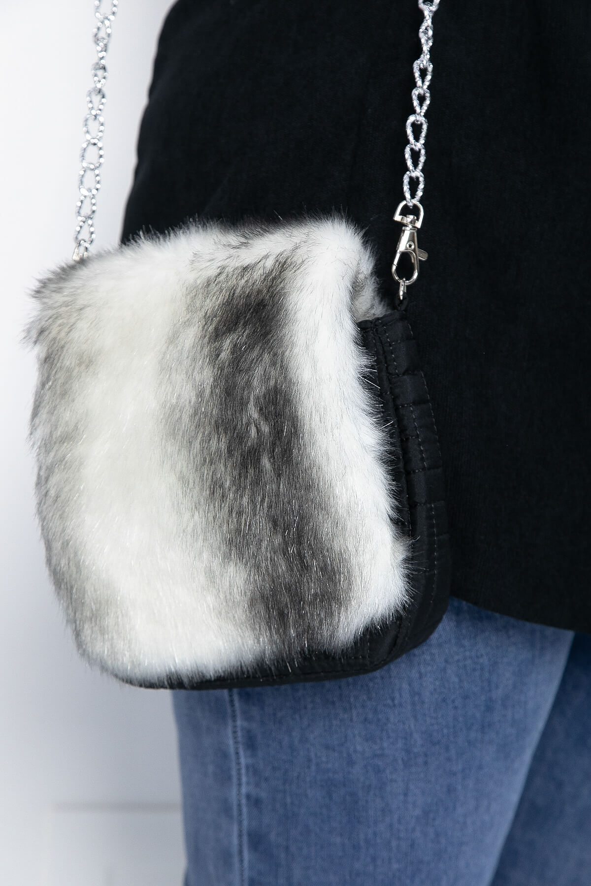 Сумка с меховой отделкой на передней части — это настоящий подарок для тех, кто стремится сделать свой образ уютным и комфортным. Изготовленная из мягкого материала, эта очаровательная сумочка через плечо на цепочке станет вашим незаменимым спутником для зимних прогулок или вечерних походов по магазинам. Её верхний клапан можно откинуть, открывая доступ к внутреннему пространству. А красивый меховой дизайн, стилизованный под волка, делает эту сумку настоящим украшением. Ремешок из никелированной цепочки. Внутри есть кармашки.