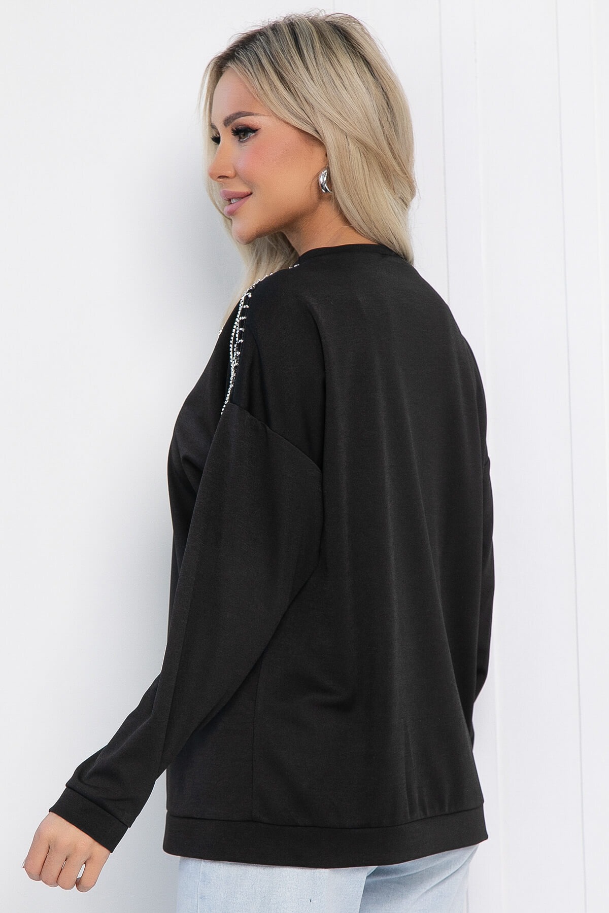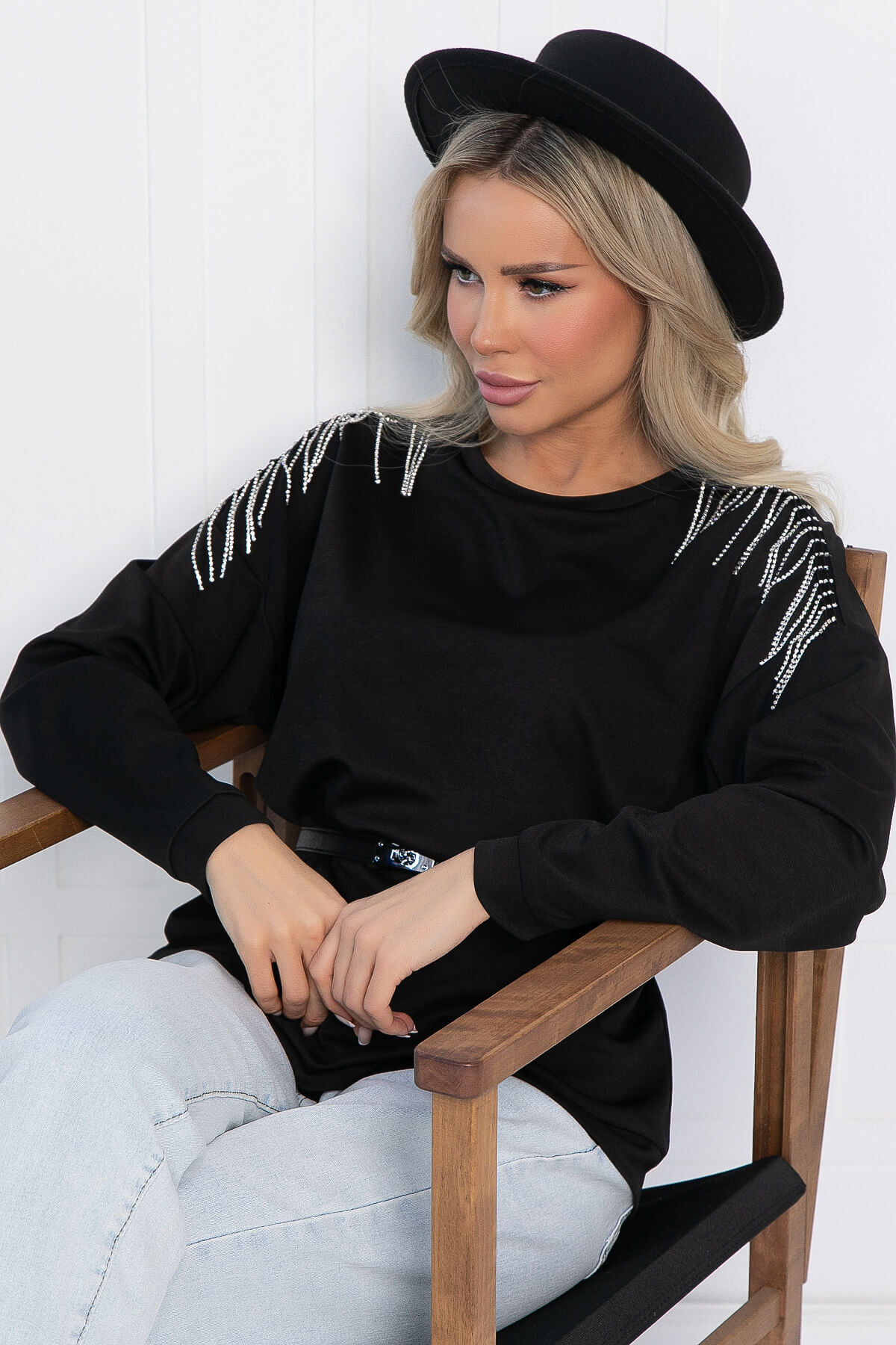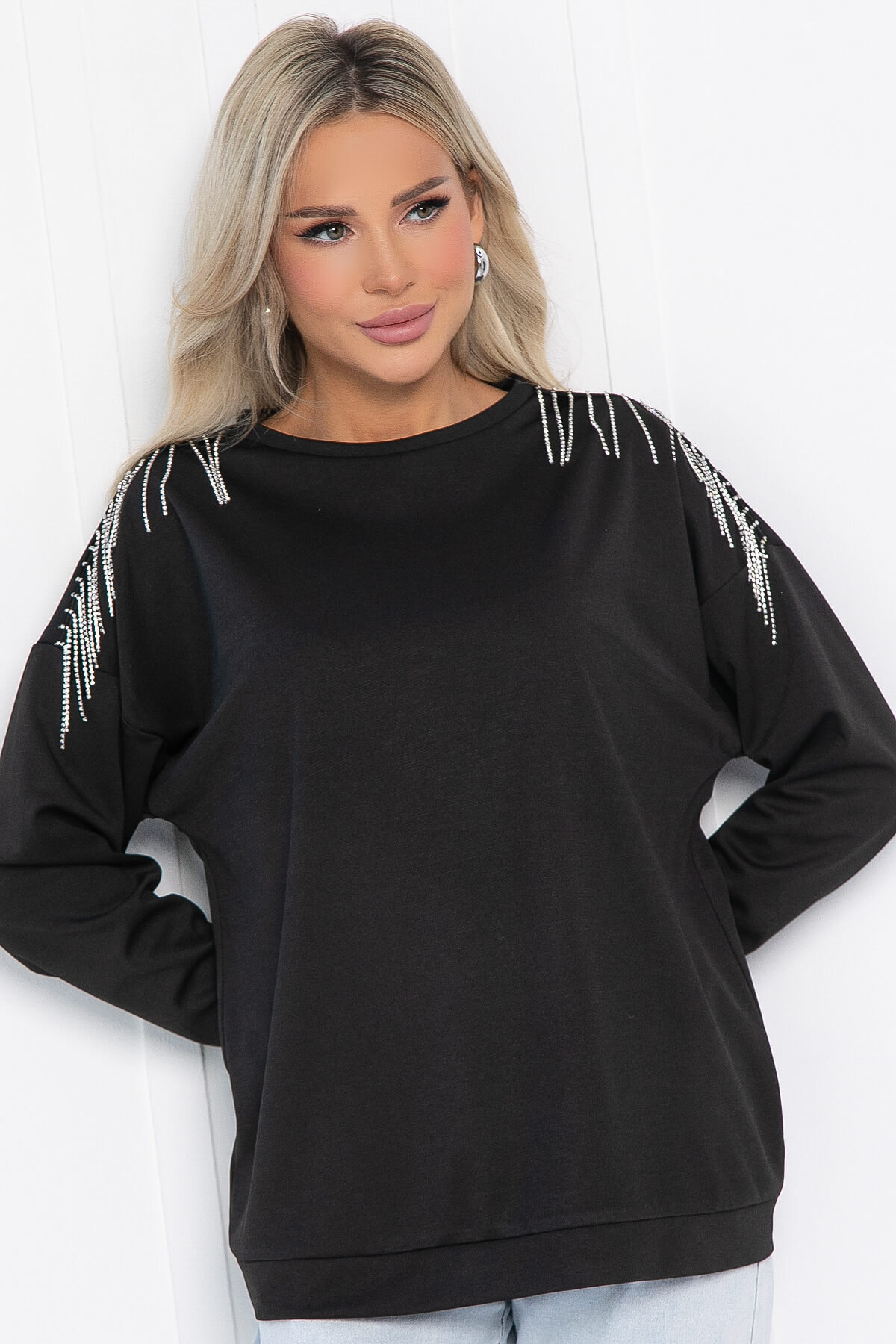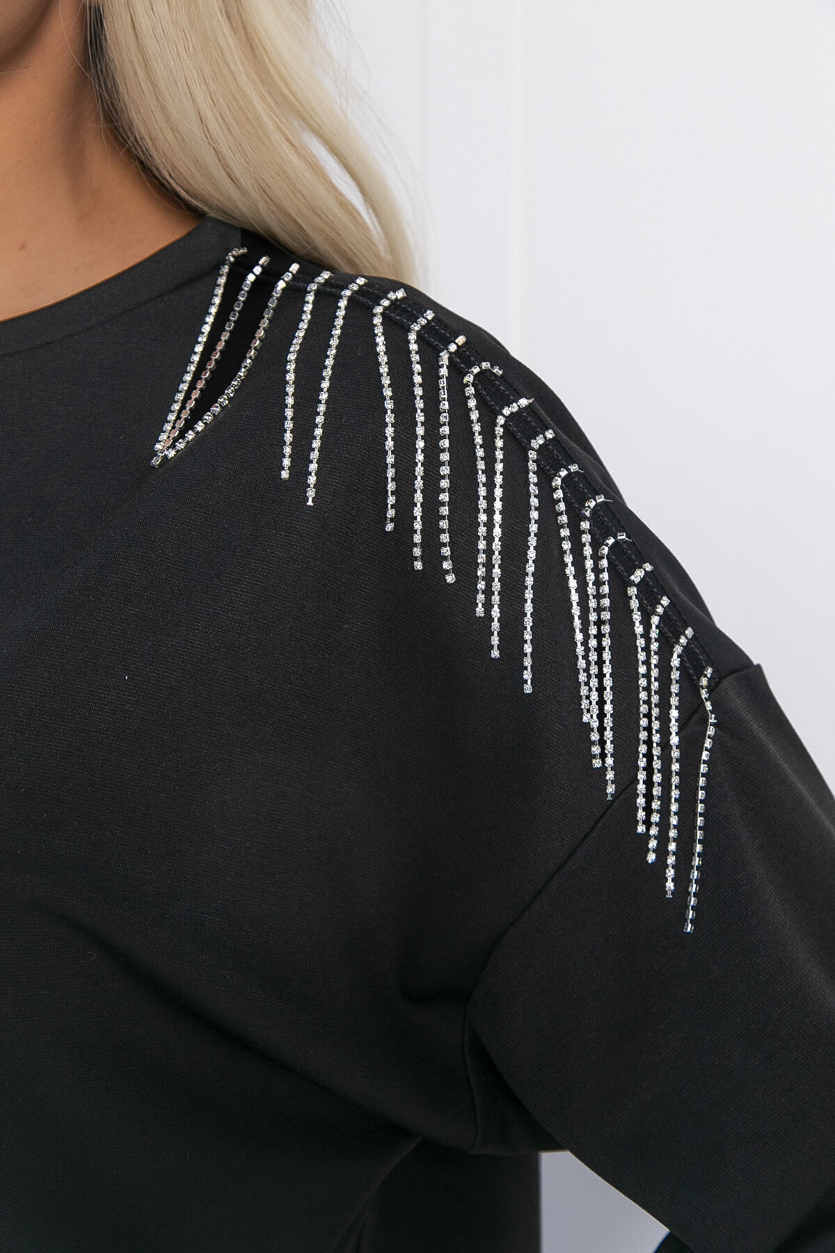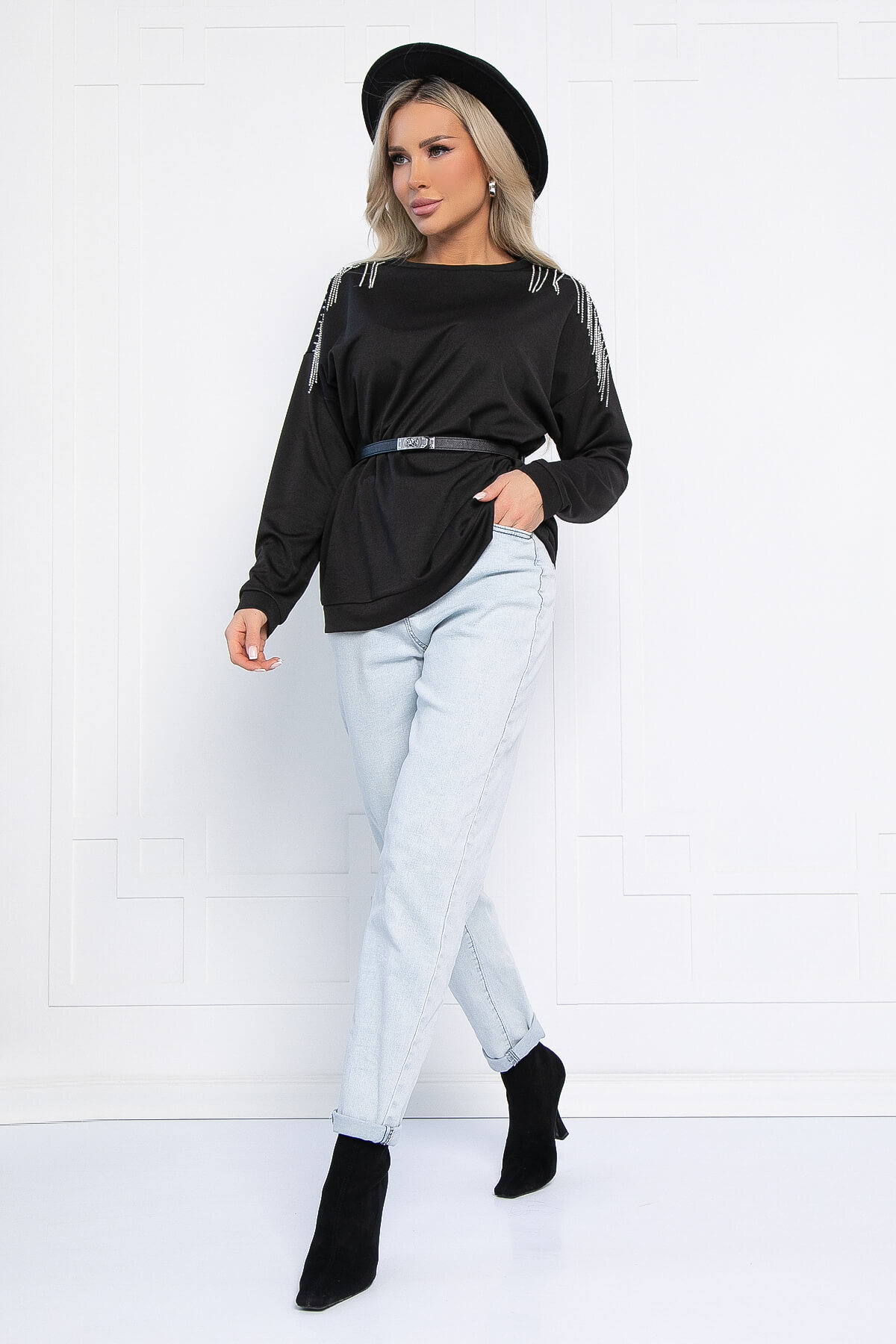 Свитшот из трикотажа, декорированный эффектной бахромой со стразами на плечах, станет изюминкой вашего стильного повседневного гардероба. Он будет отлично сочетаться с большинством базовых вещей. Эта модель идеально подходит для создания уютного и комфортного образа на каждый день. Её можно носить с широкими джинсами или трикотажной юбкой прямого фасона.