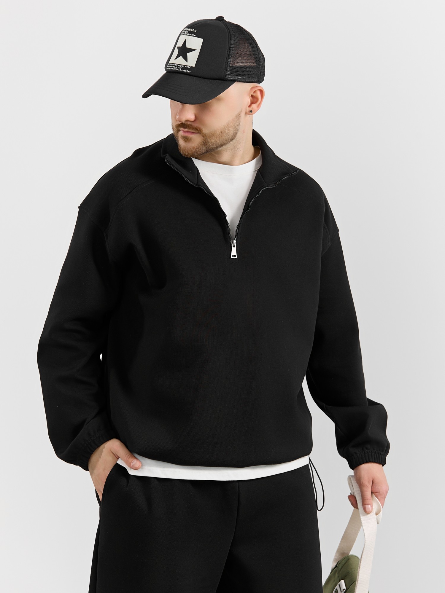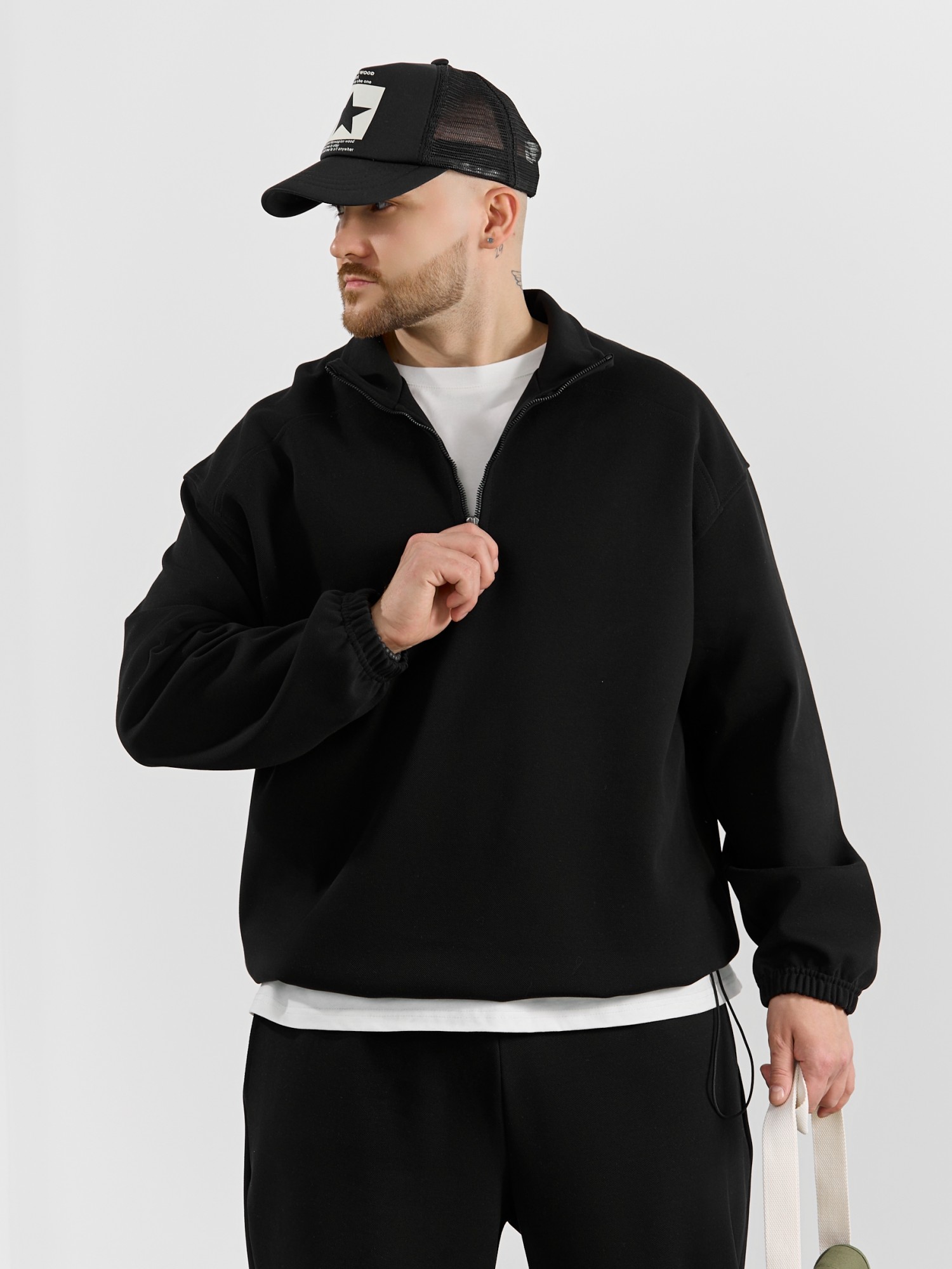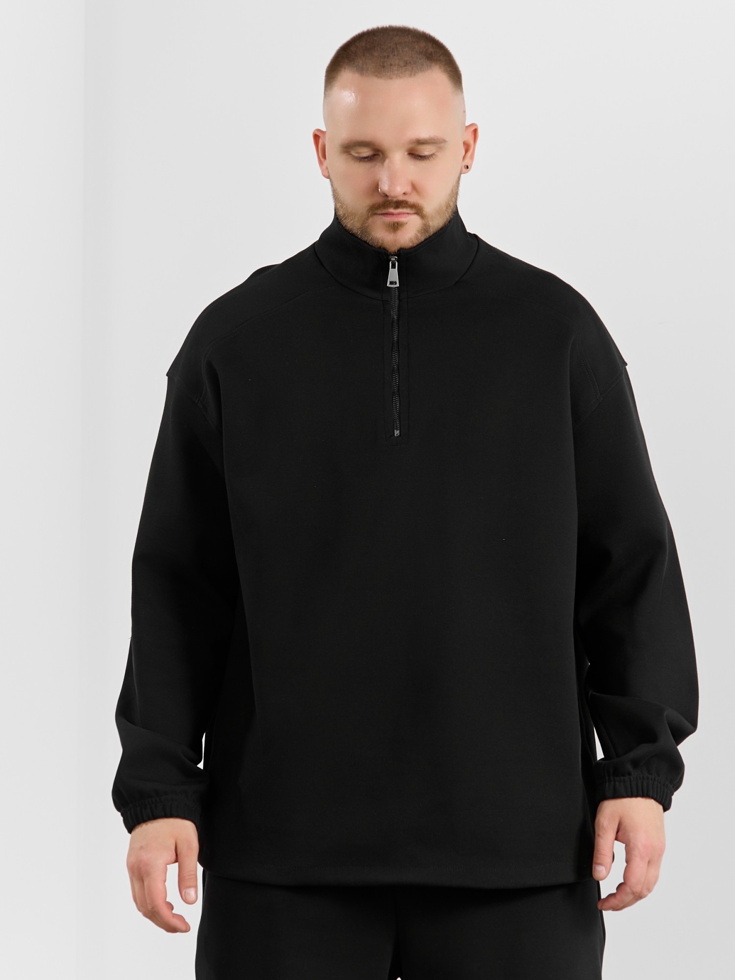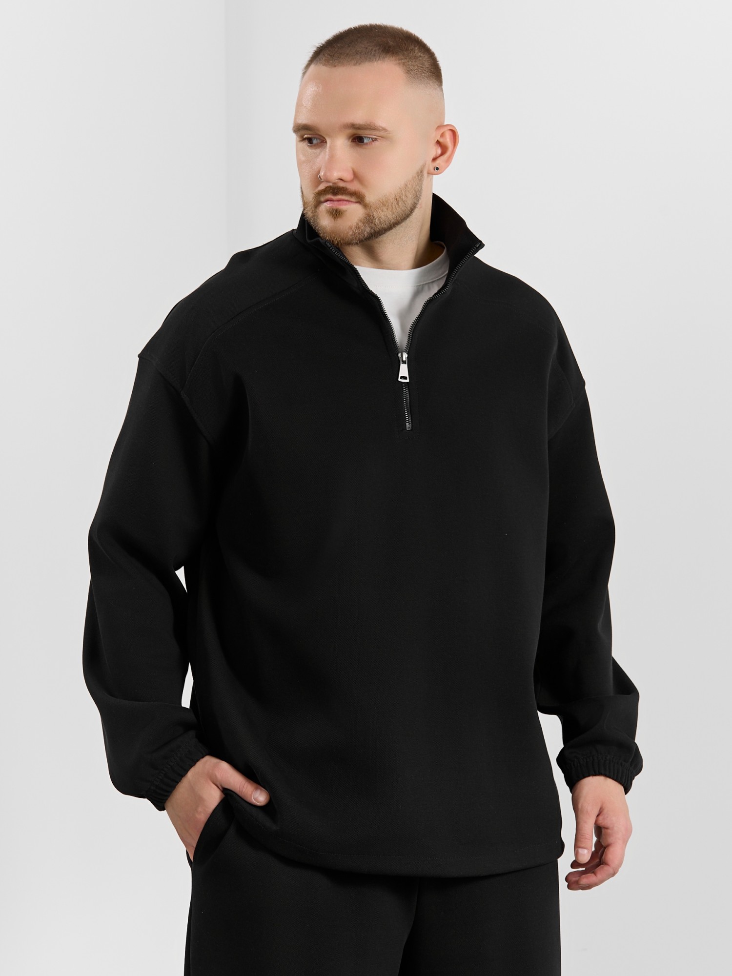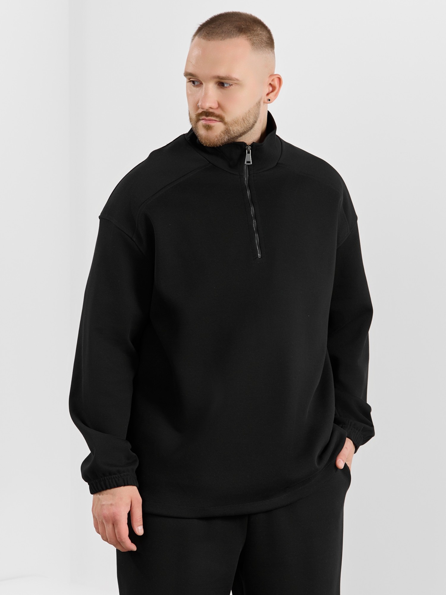Толстовка мужская из трикотажного полотна "интерло-пике". Толстовка свободного покроя, с длинными втачными рукавами, заниженными проймами и воротником-стойкой. Полочка с кокетками, с неразъемной застежкой "молния", обработанной в рамке. Нижние срезы рукавов обработаны с эластичной тесьмой, нижний срез изделия - подгибкой, с эластичным шнуром и фиксаторлм для регулировки ширины изделия на этом участке.
