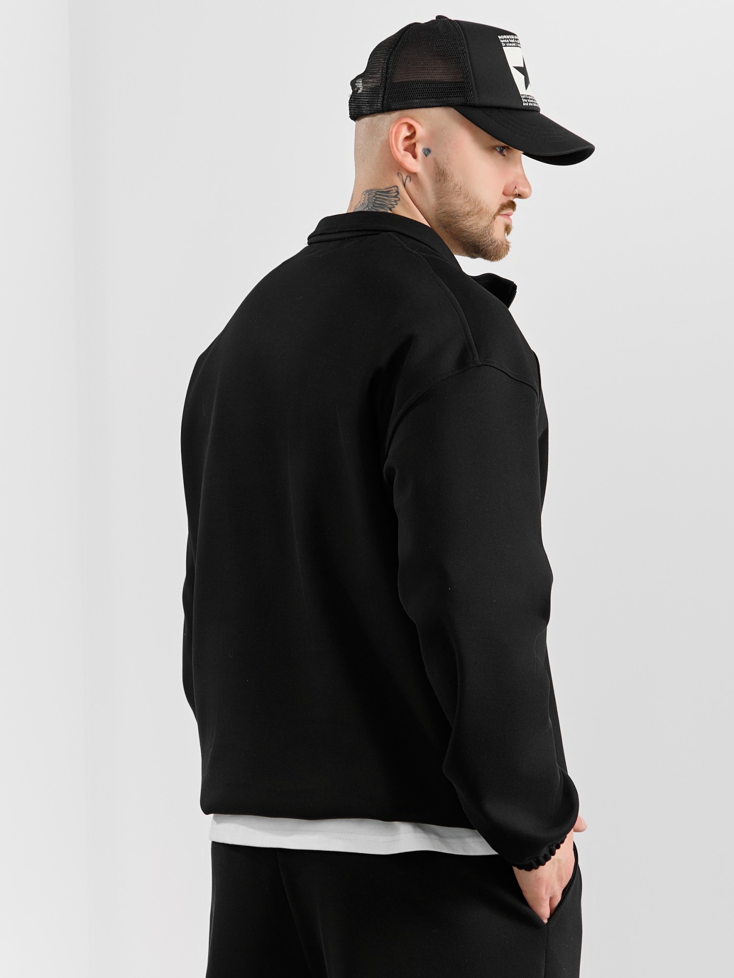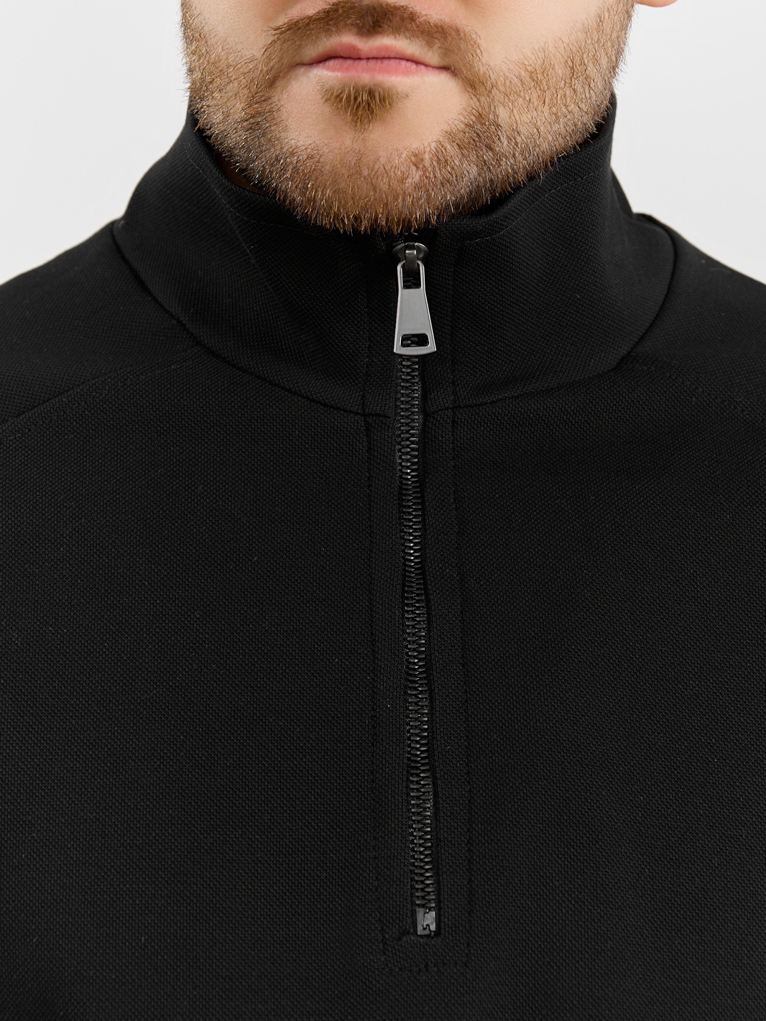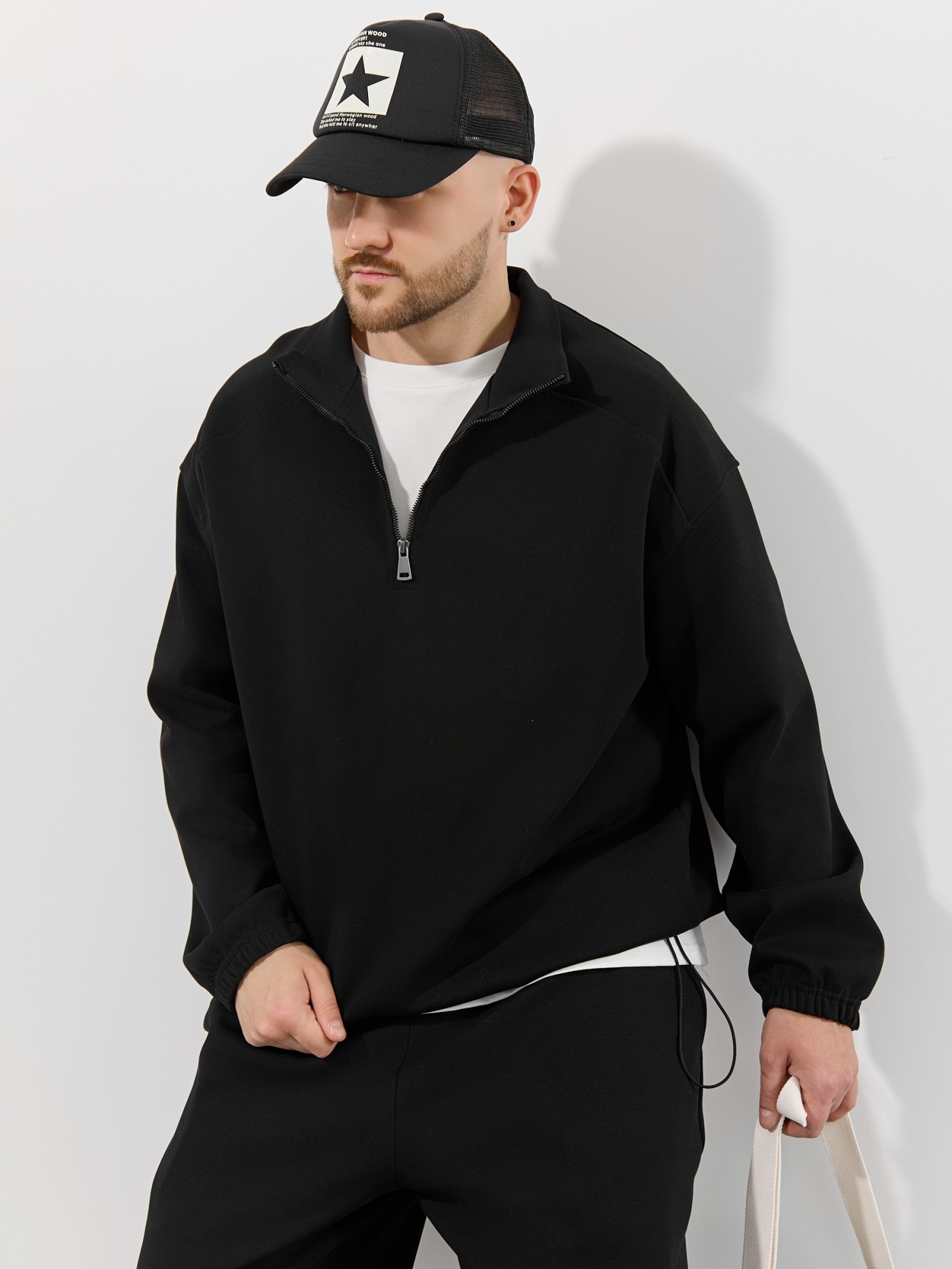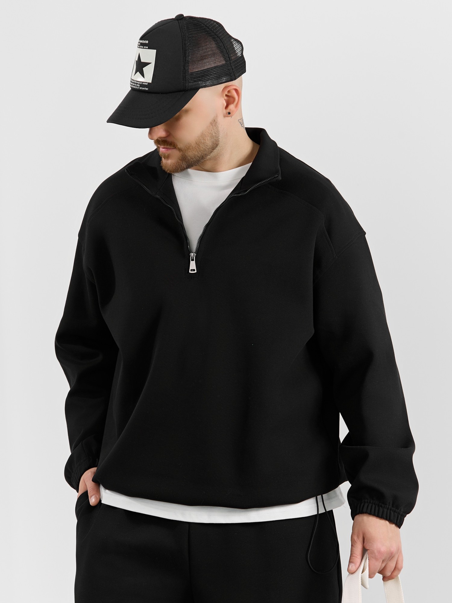 Толстовка мужская из трикотажного полотна "интерло-пике". Толстовка свободного покроя, с длинными втачными рукавами, заниженными проймами и воротником-стойкой. Полочка с кокетками, с неразъемной застежкой "молния", обработанной в рамке. Нижние срезы рукавов обработаны с эластичной тесьмой, нижний срез изделия - подгибкой, с эластичным шнуром и фиксаторлм для регулировки ширины изделия на этом участке.