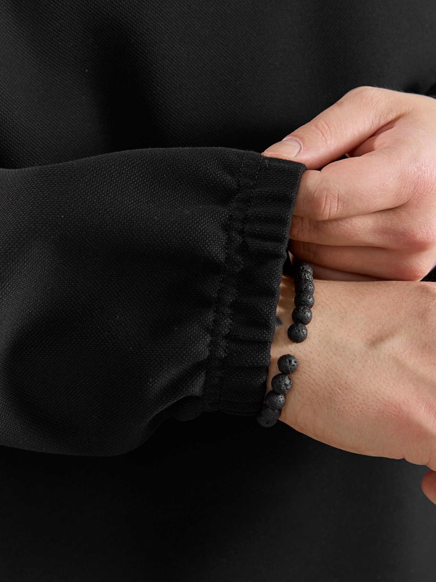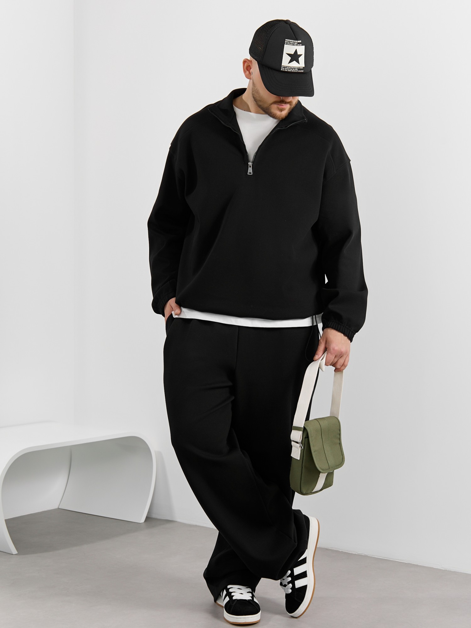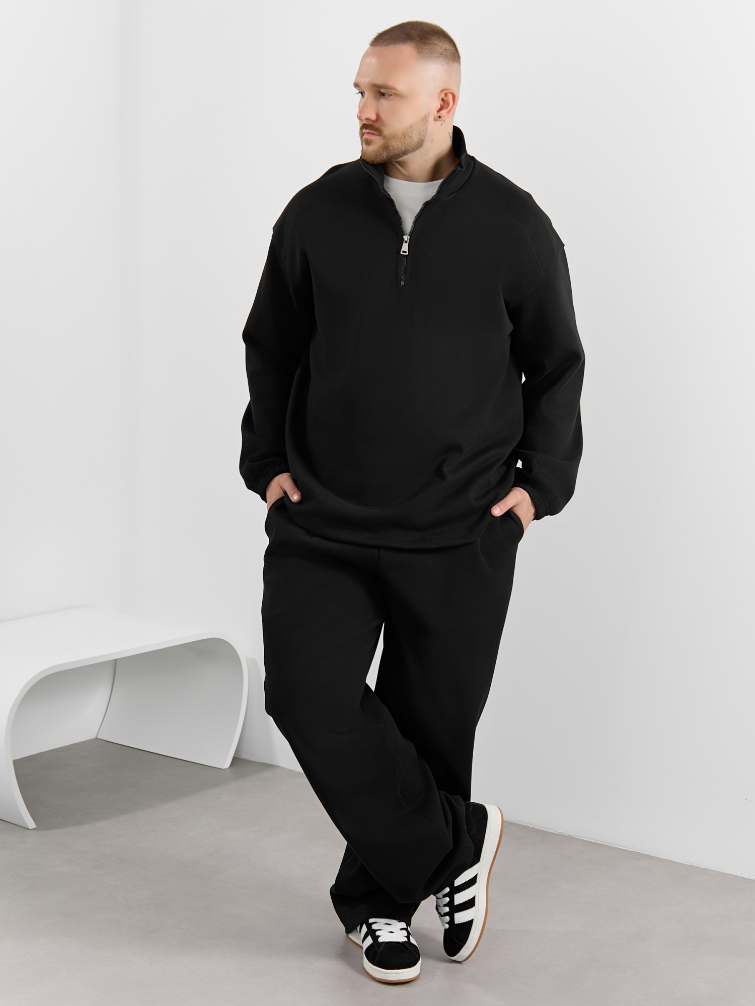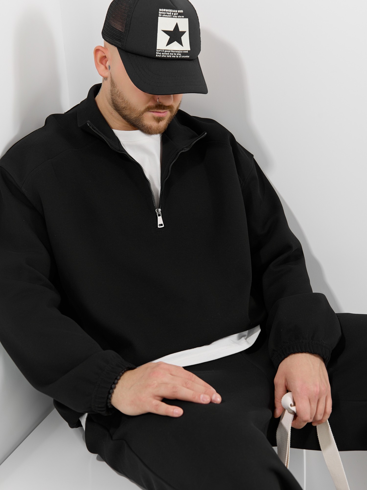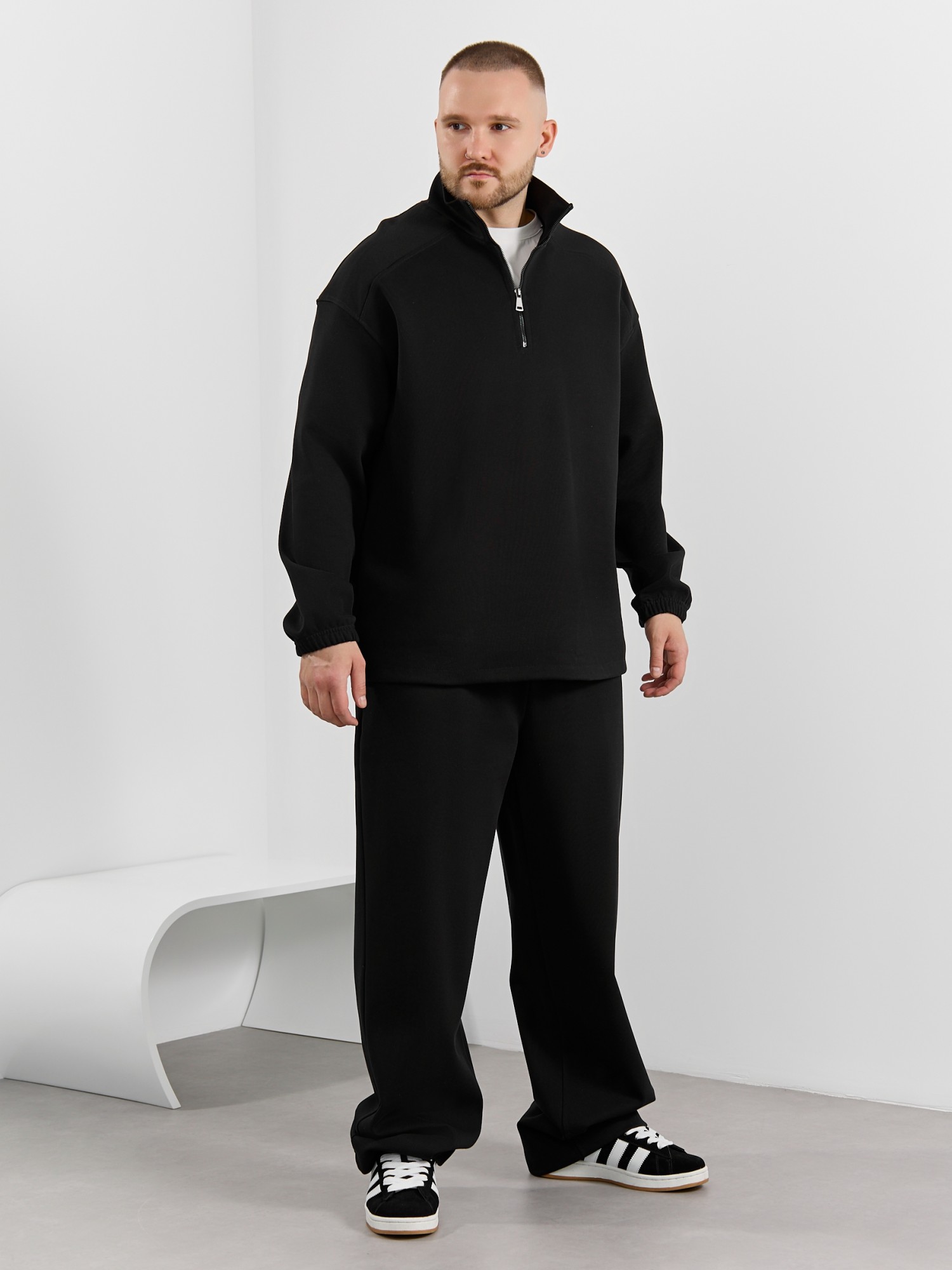 Толстовка мужская из трикотажного полотна "интерло-пике". Толстовка свободного покроя, с длинными втачными рукавами, заниженными проймами и воротником-стойкой. Полочка с кокетками, с неразъемной застежкой "молния", обработанной в рамке. Нижние срезы рукавов обработаны с эластичной тесьмой, нижний срез изделия - подгибкой, с эластичным шнуром и фиксаторлм для регулировки ширины изделия на этом участке.