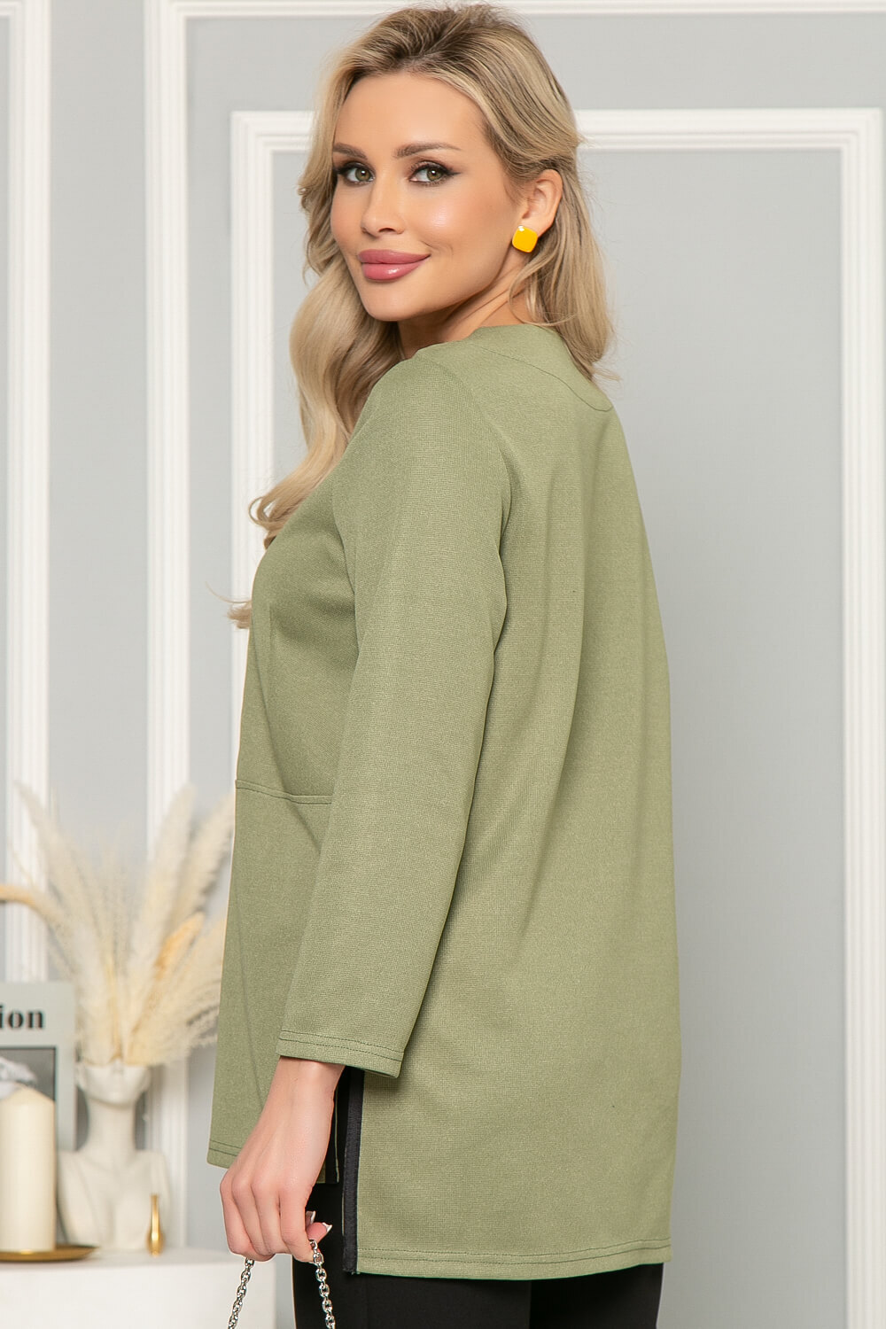 Туника из мягкого трикотажа подойдёт для создания повседневных образов. Имеет ассиметричный крой - спинка длиннее переда. По бокам есть глубокие разрезы. Туника имеет приятный оливковый цвет, который является универсальным базовым цветом для повседневного и делового гардероба.