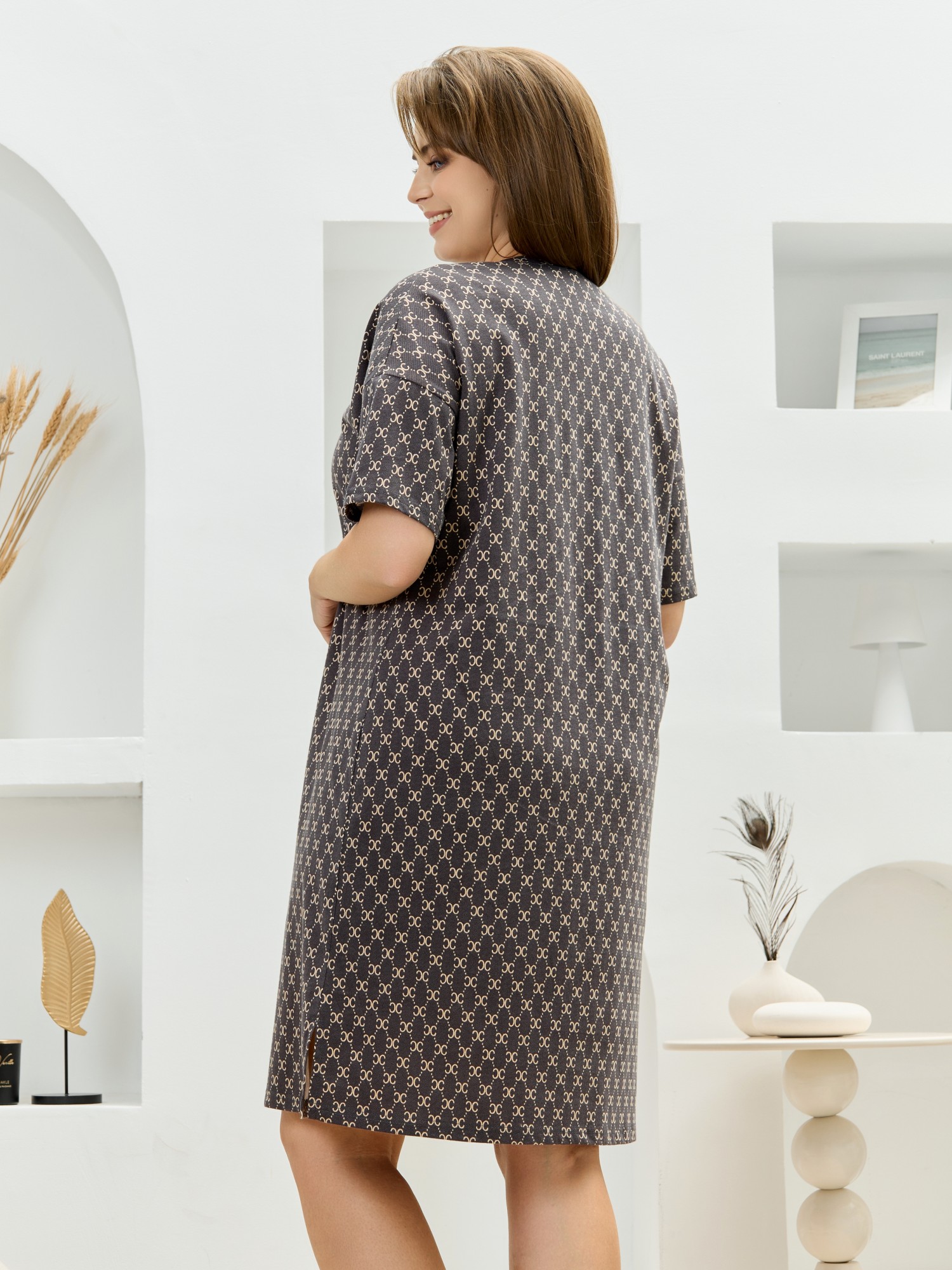 Туника женская из трикотажного полотна «кулирка» с набивным рисунком, свободного покроя, со спущенной линией плеча, втачными короткими рукавами, горловиной V-образной формы, обработанной втачной планкой и разрезами в боковых швах.
