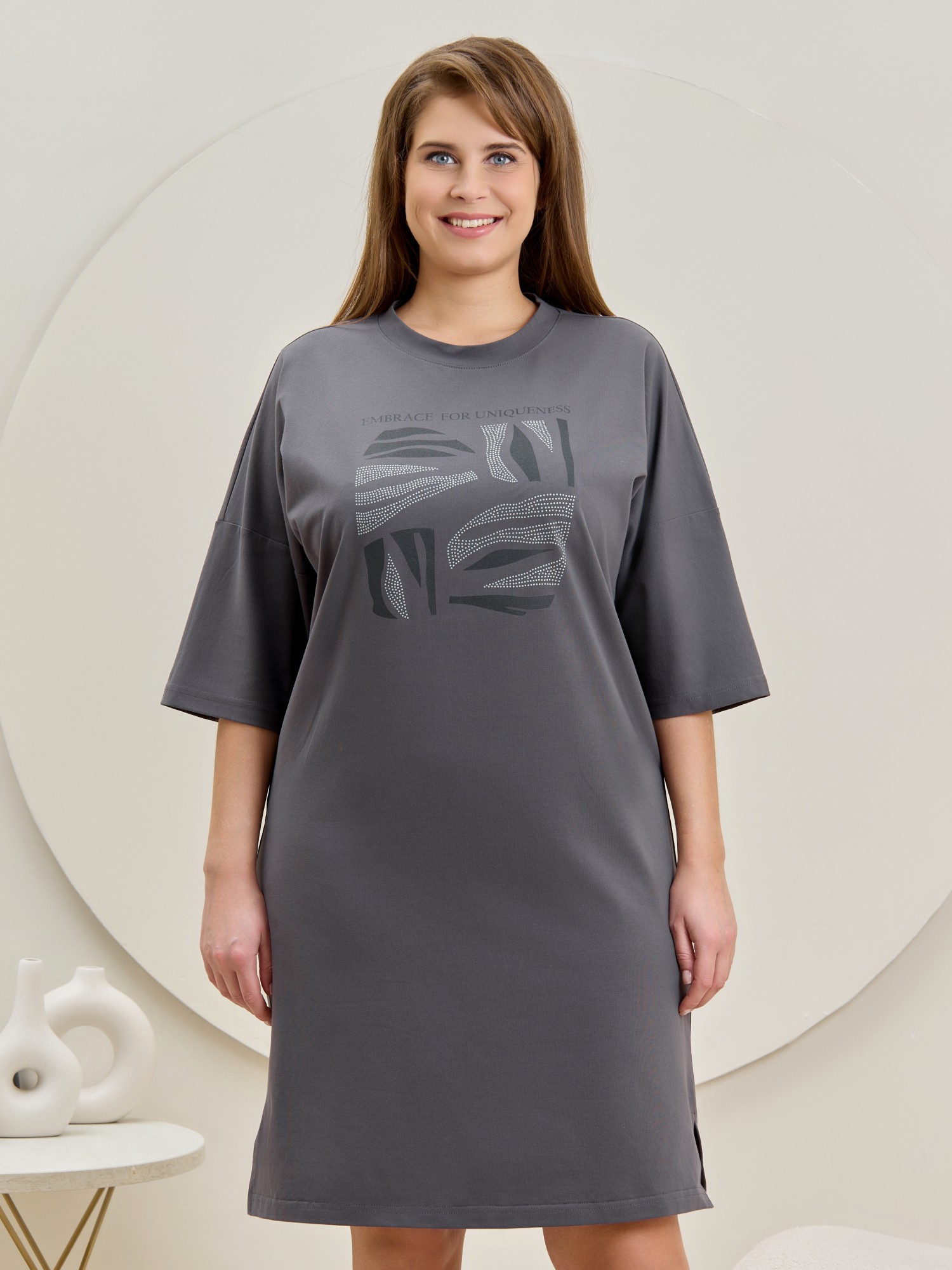 Туника женская из гладкокрашенного полотна «кулирка» с лайкрой, свободного покроя, с втачными рукавами длиной до локтя, горловиной овальной формы, обработанной втачной планкой и разрезами в боковых швах. На полочке принт, выполненный в технике «шелкографии».