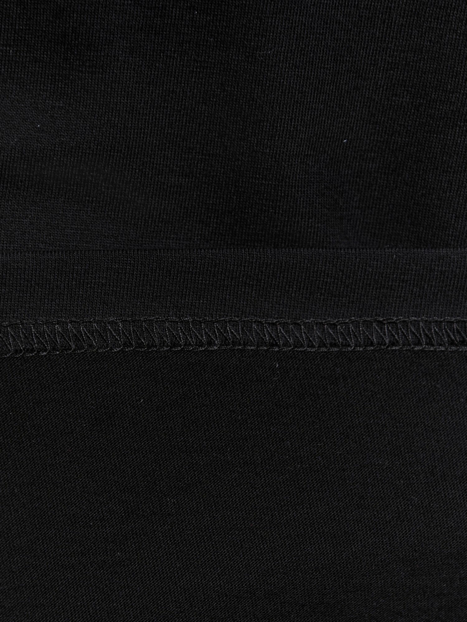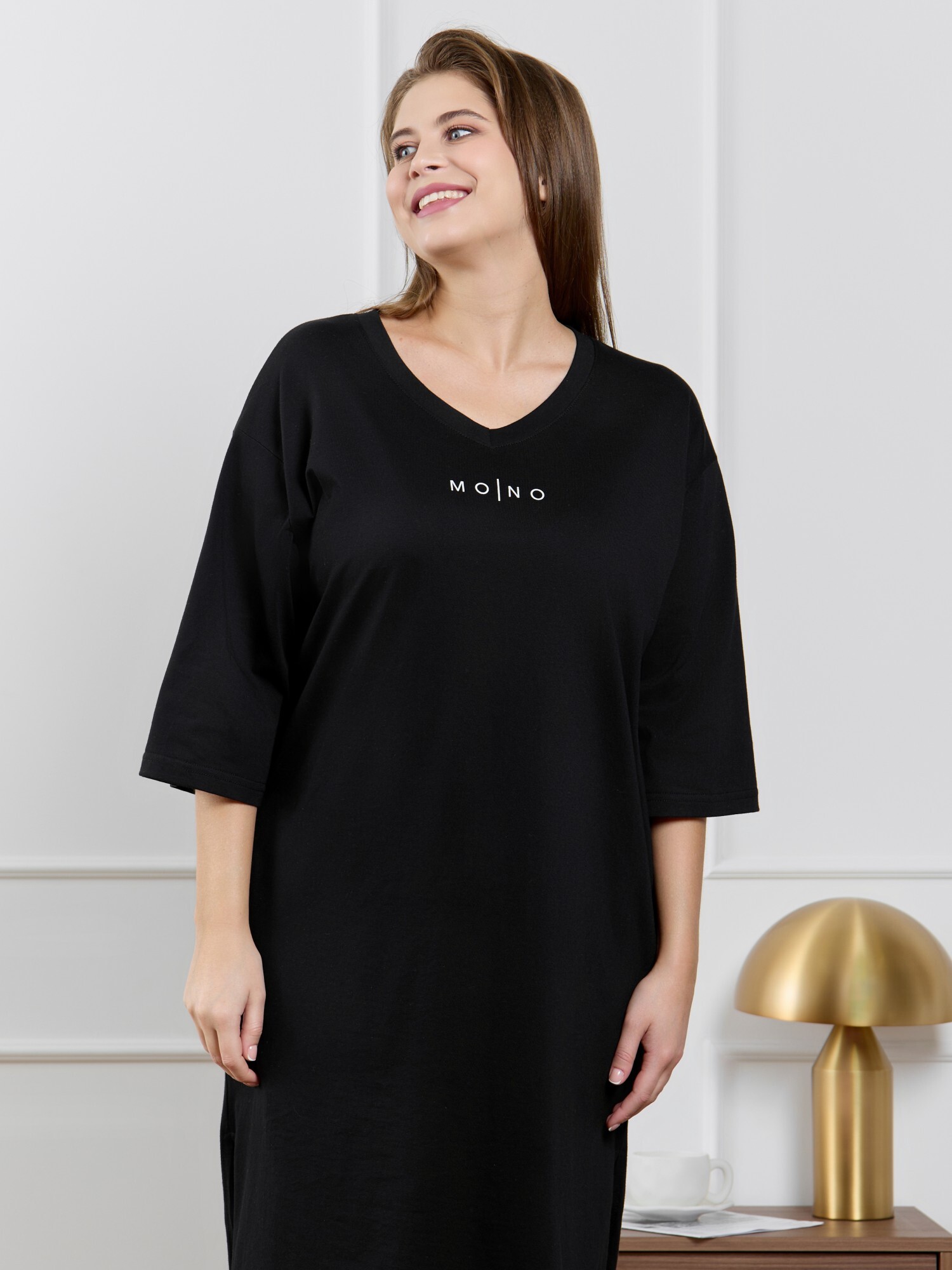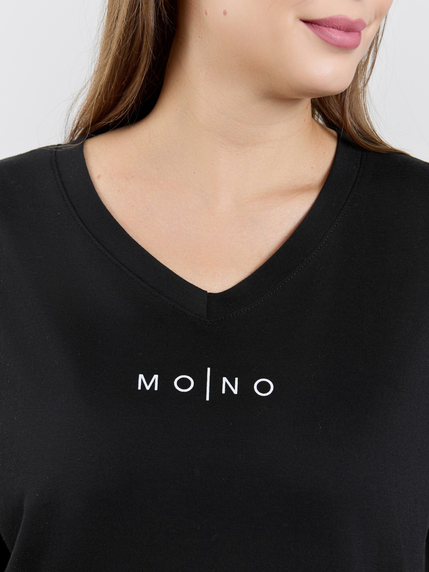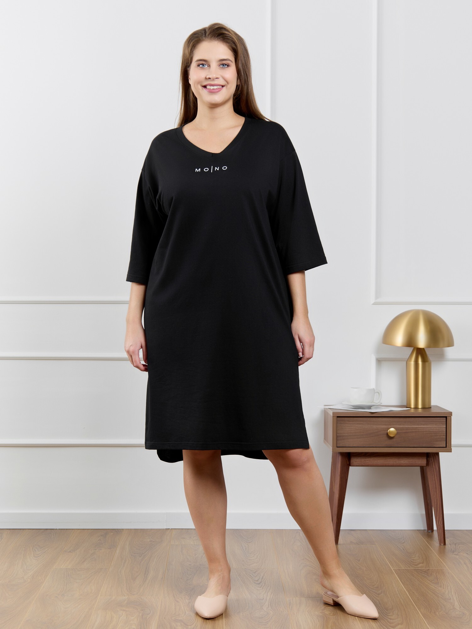 Туника женская из гладкокрашенного полотна «кулирка», свободного кроя, со спущенной линией плеча, втачными рукавами длиной до локтя, горловиной V-образной формы обработанной втачной планкой и принтом на полочке выполненным в технике «шелкографии». Модным элементом является разность длин фигурного низа изделия: низ полочки – прямой укороченный, низ спинки – удлиненный скруглённой формы.