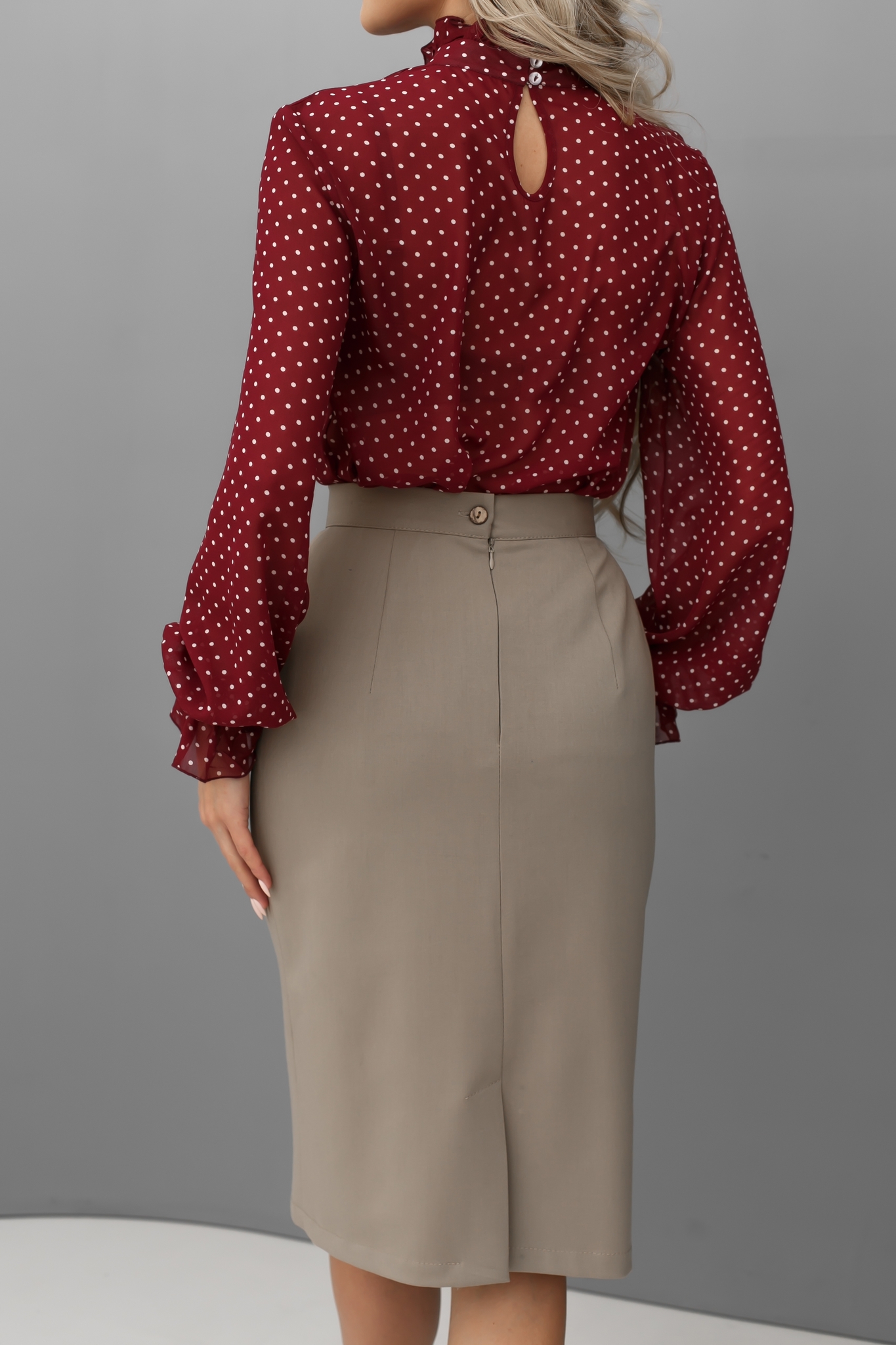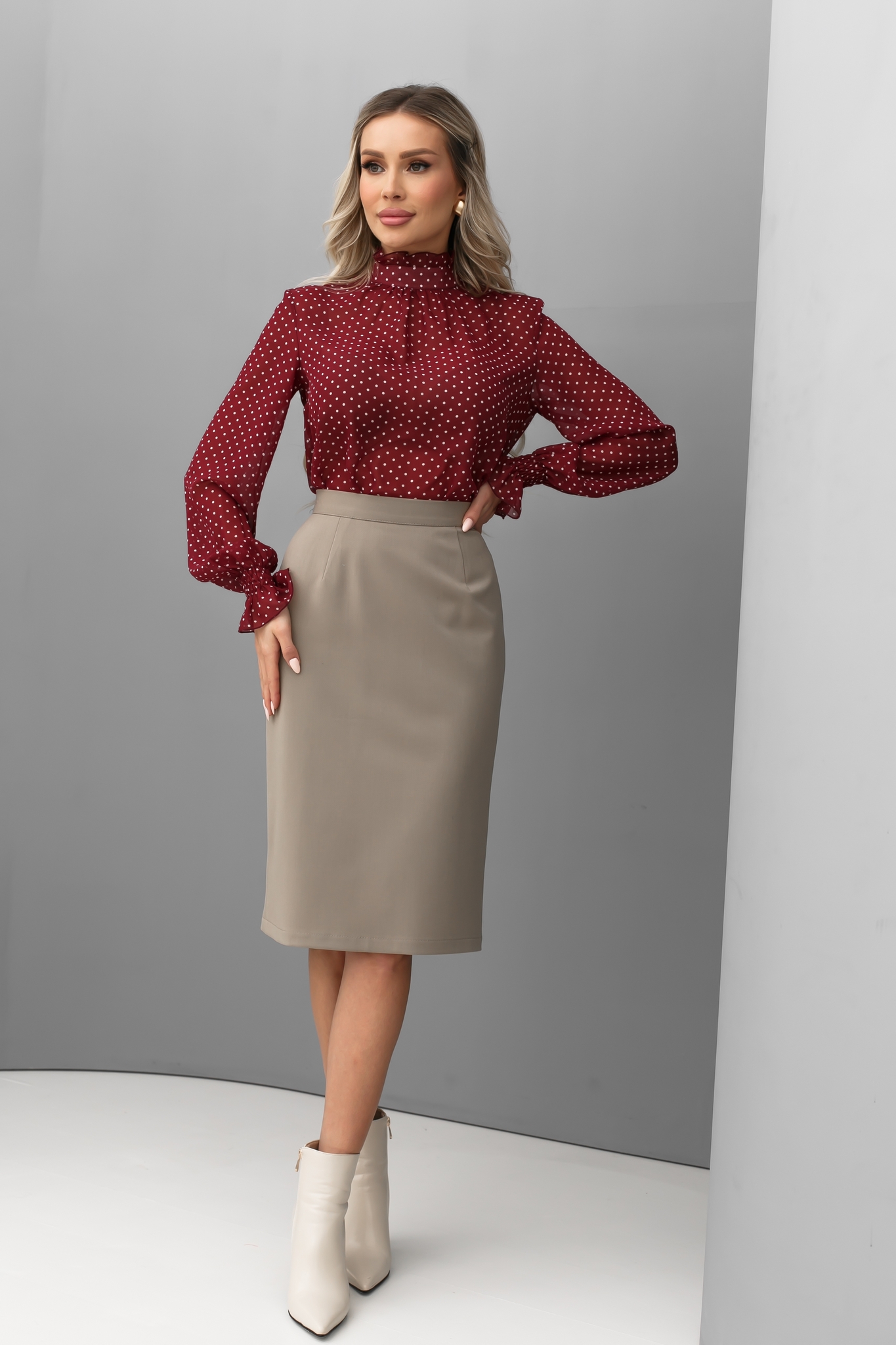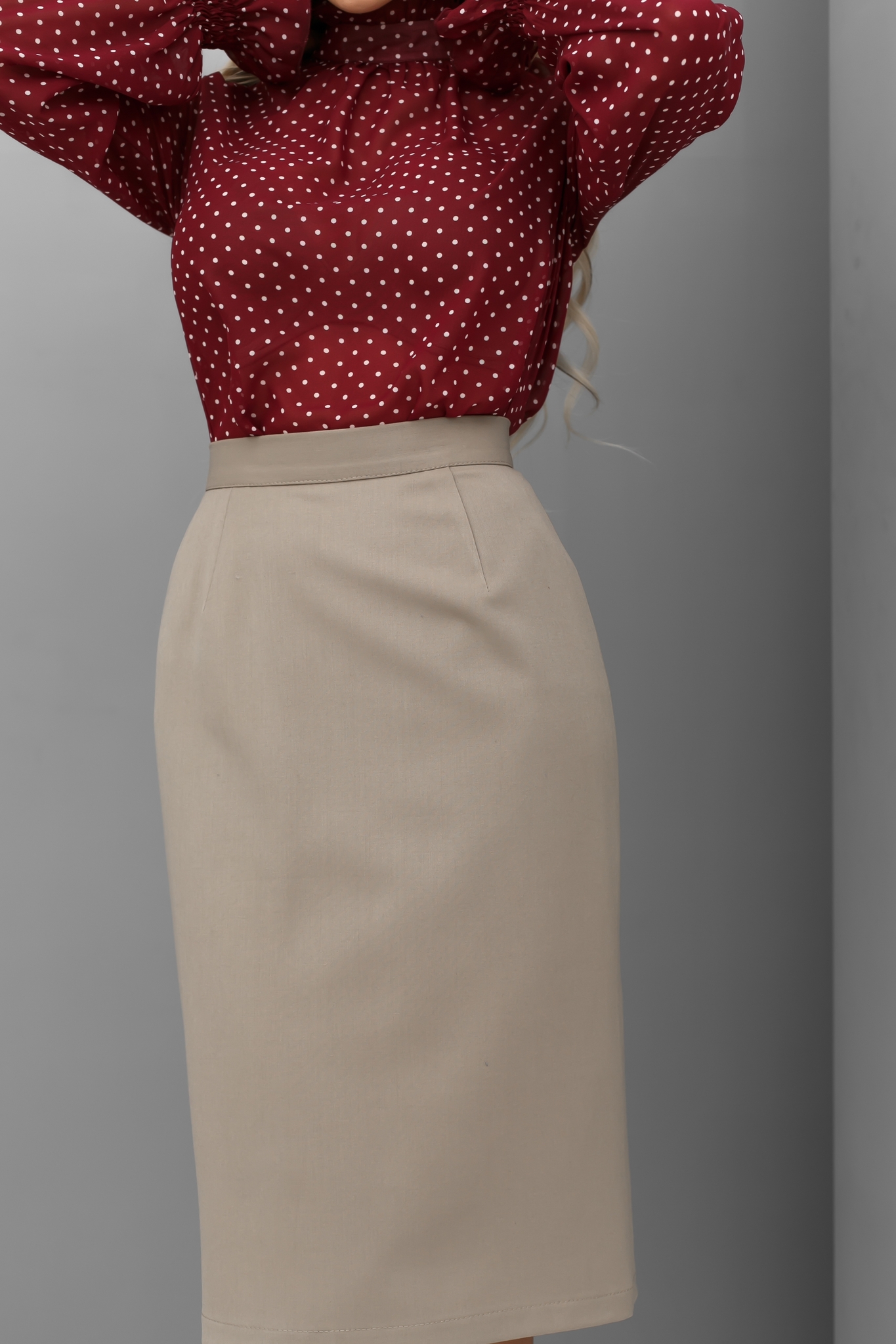Юбка - карандаш. Верх оформлен втачным поясом. В среднем шве спинки застежка на пуговицу и потайную молнию. Модель на подкладке. Низ ровный, сзади шлица.