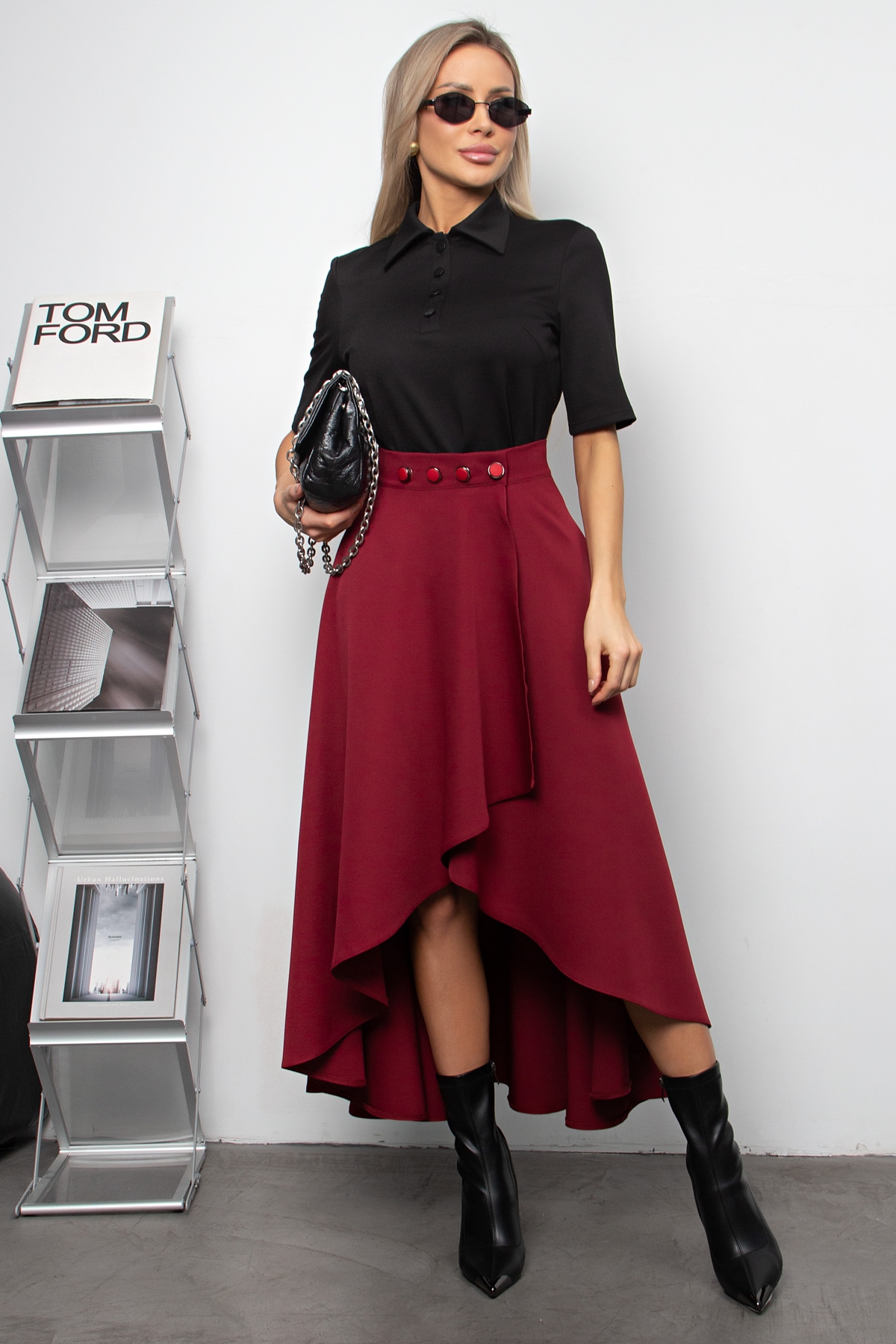 Ассиметричная юбка на запахе выполнена из плательно-костюмной ткани. Верх оформлен втачным поясом с застежкой на петли и пуговицы.