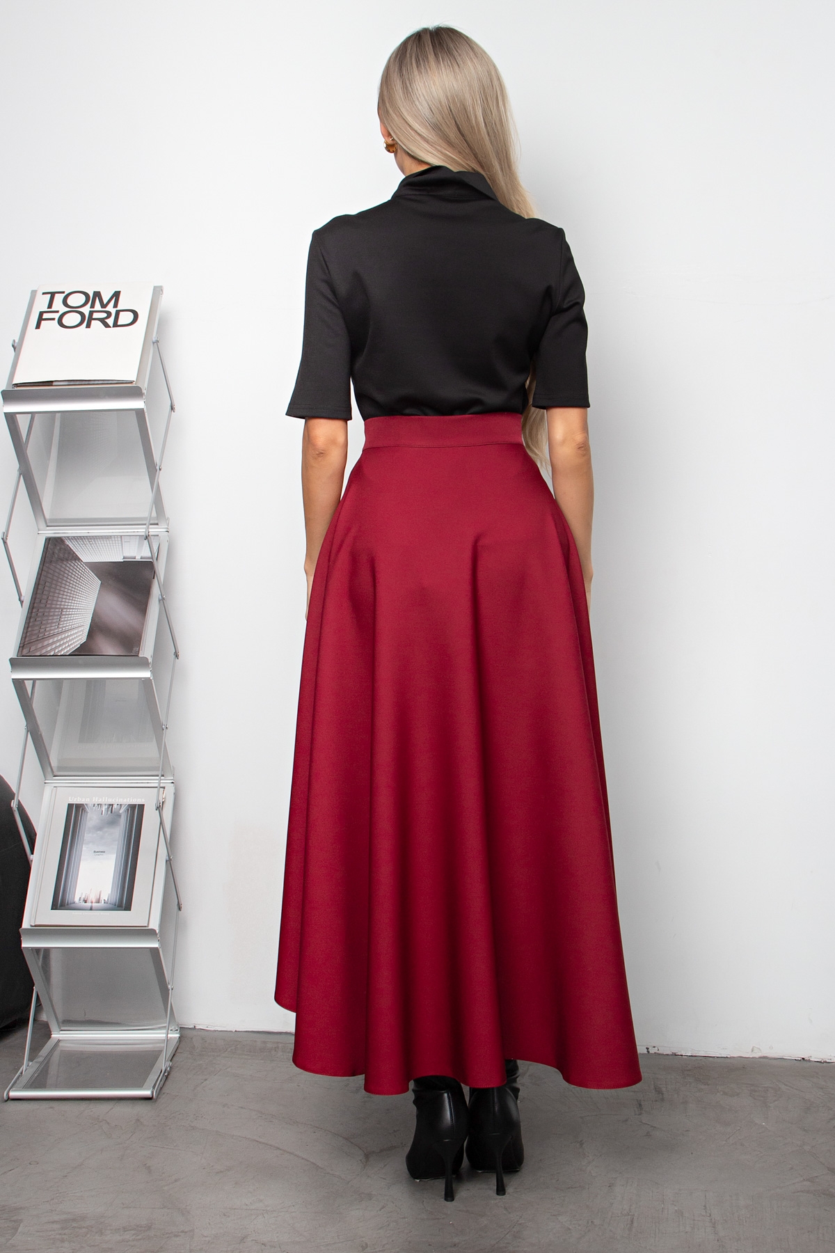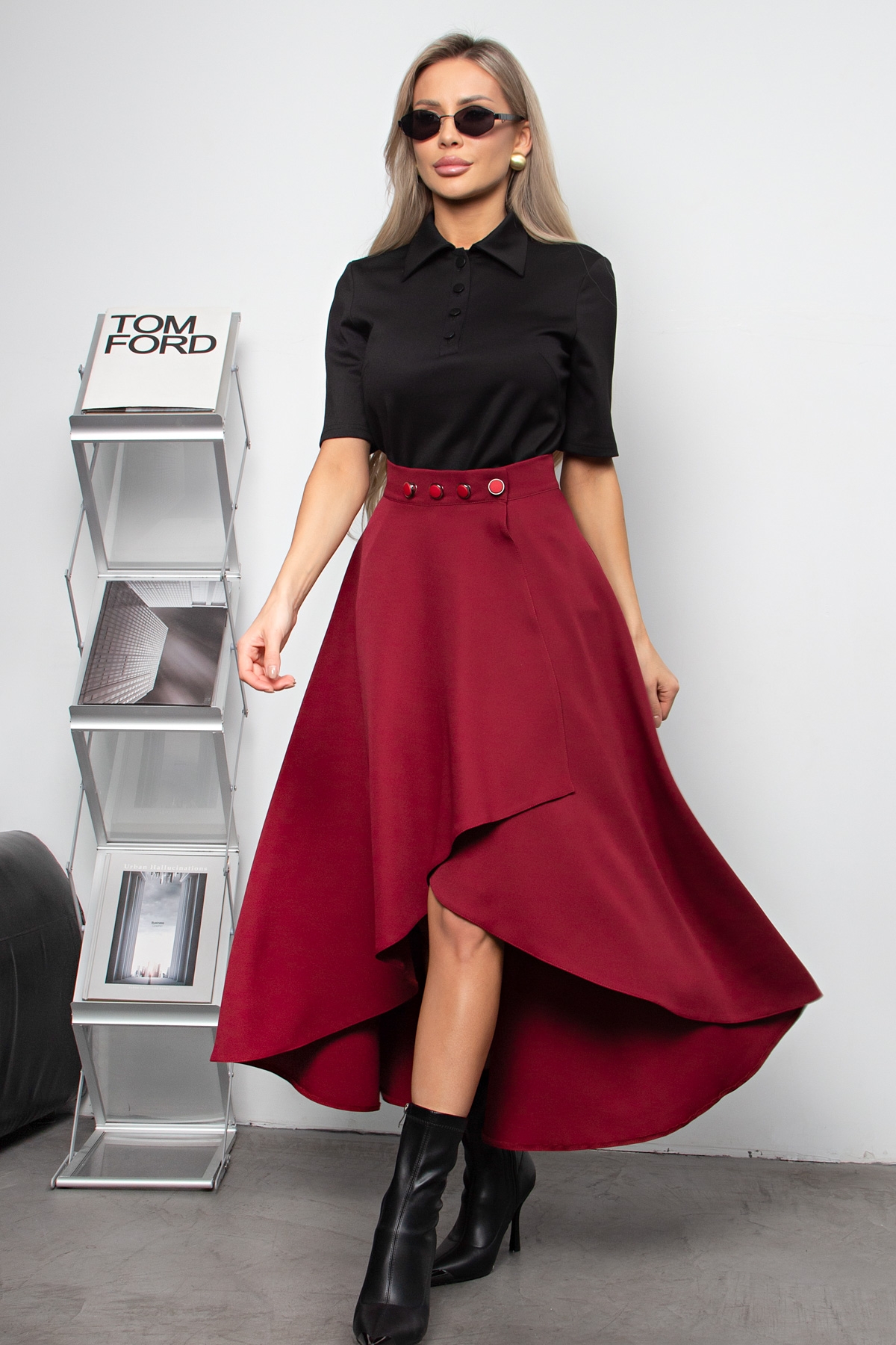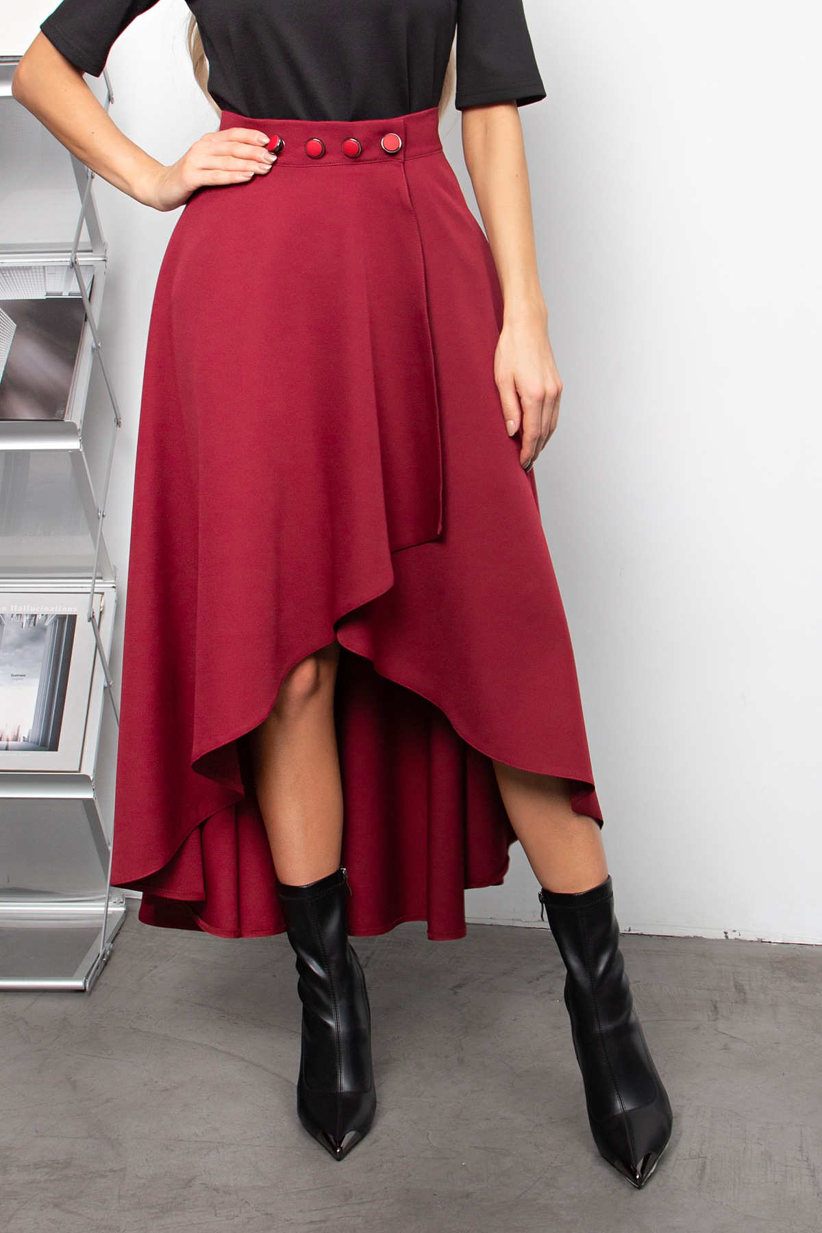 Ассиметричная юбка на запахе выполнена из плательно-костюмной ткани. Верх оформлен втачным поясом с застежкой на петли и пуговицы.