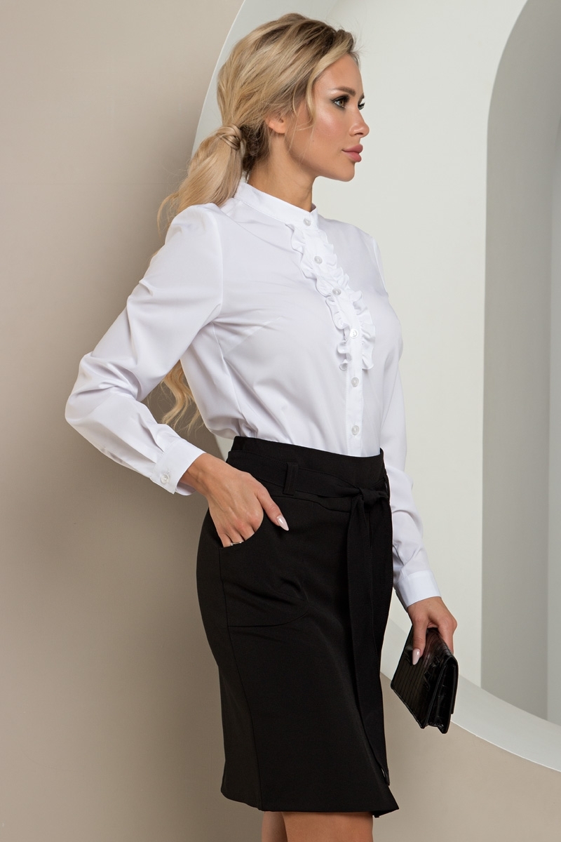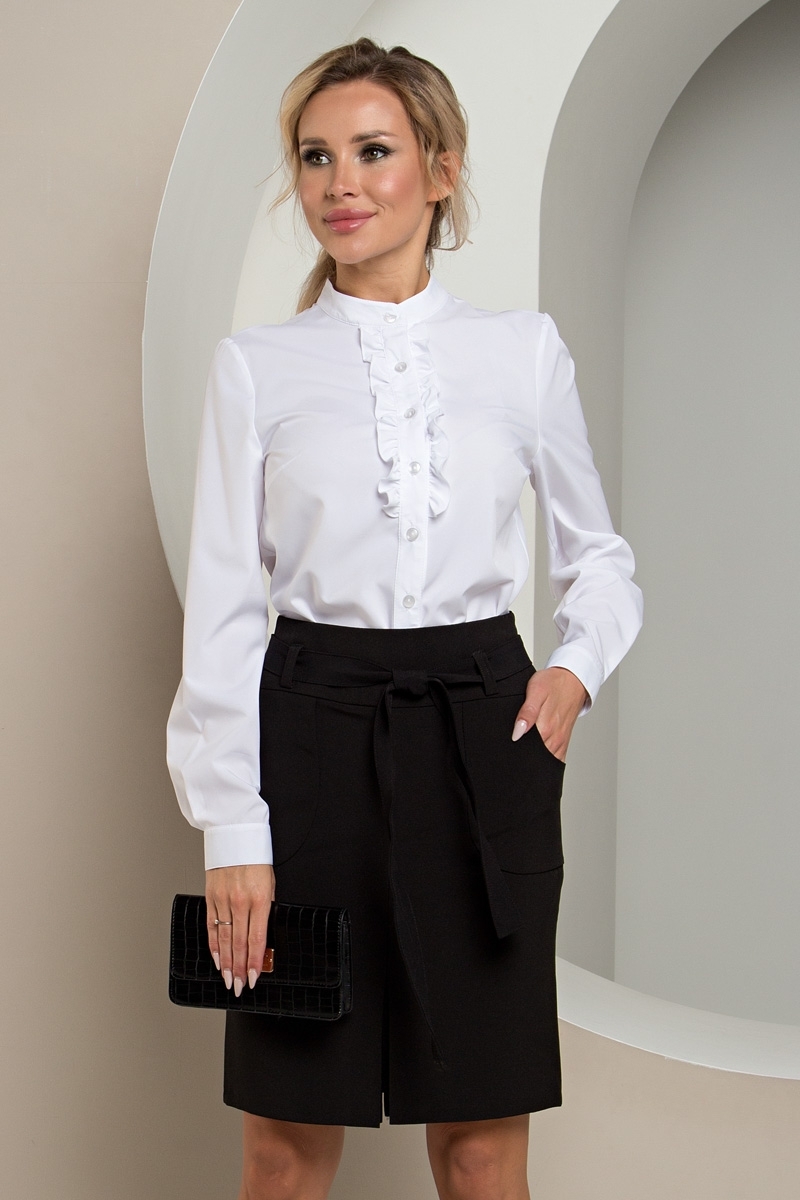 Юбка-карандаш из однотонной костюмной ткани. Модель на кокетке, дополнена шлевками под ремень. По бокам выполнены накладные карманы. В боковом шве – застежка на потайную молнию. Низ ровный, дополнен разрезом со встречными веерными складками. На подкладке. Пояс из основного материала входит в комплект.