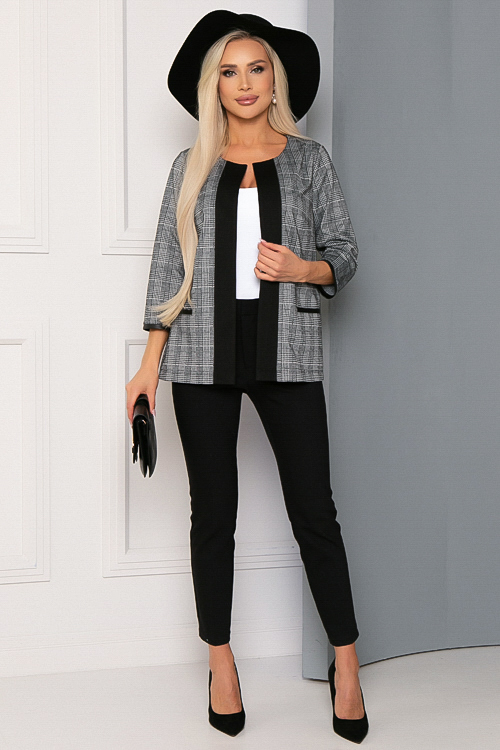 Жакет из жаккардового трикотажного полотна в клетку с контрастной трикотажной отделкой по переду и эко кожи по карманам и рукавам.