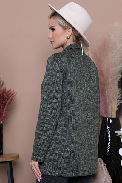 Жакет свободного силуэта из теплого комфортного трикотажного полотна в елочку,прямого свободного силуэта .По переду центральная застежка на одну пуговицу.Воротник отложной с лацканами.По переду жакета накладные удобные карманы.