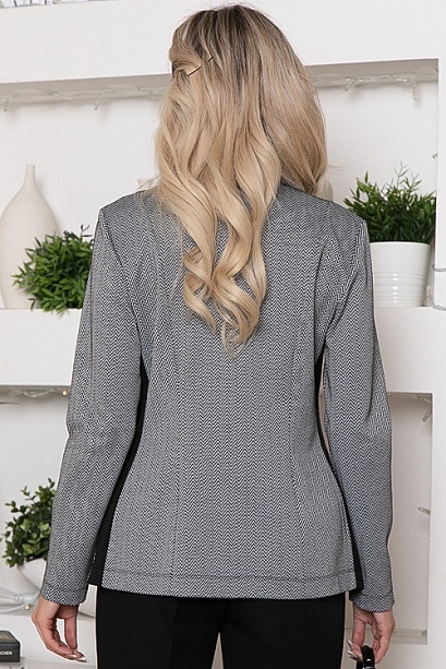 Жакет из плотного жаккардового трикотажного полотна в елочку полуприлегающего силуэта с контрастной отделкой по бокам.Воротник отложной с лацканами.По переду застежка на три пуговицы.